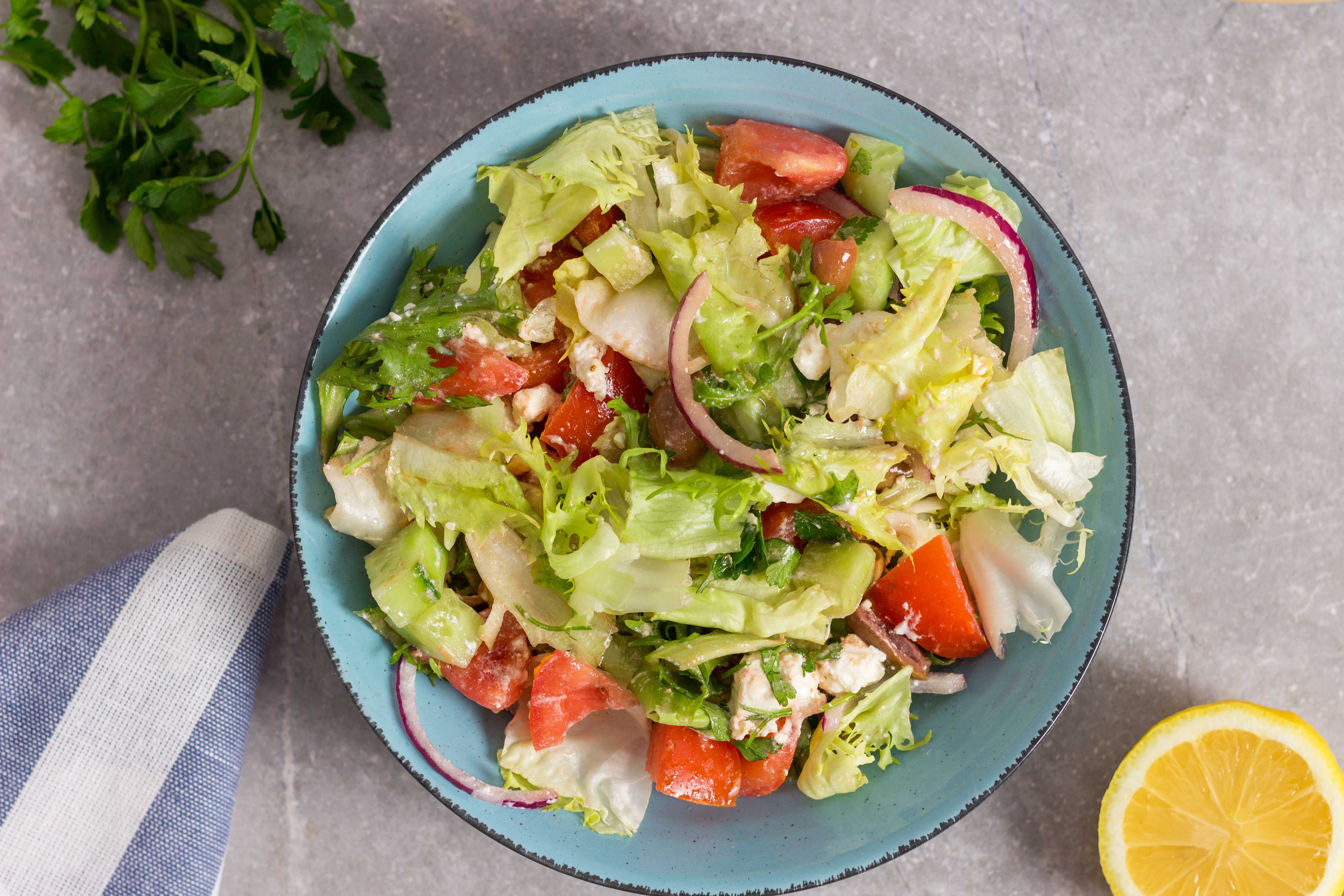 Step 1 -Add the chopped lettuce, the tomatoes, the cucumber, the onions, the 30 halved kalamata olives, 1/2 of the crumbled feta, and the parsley to a large bowl.