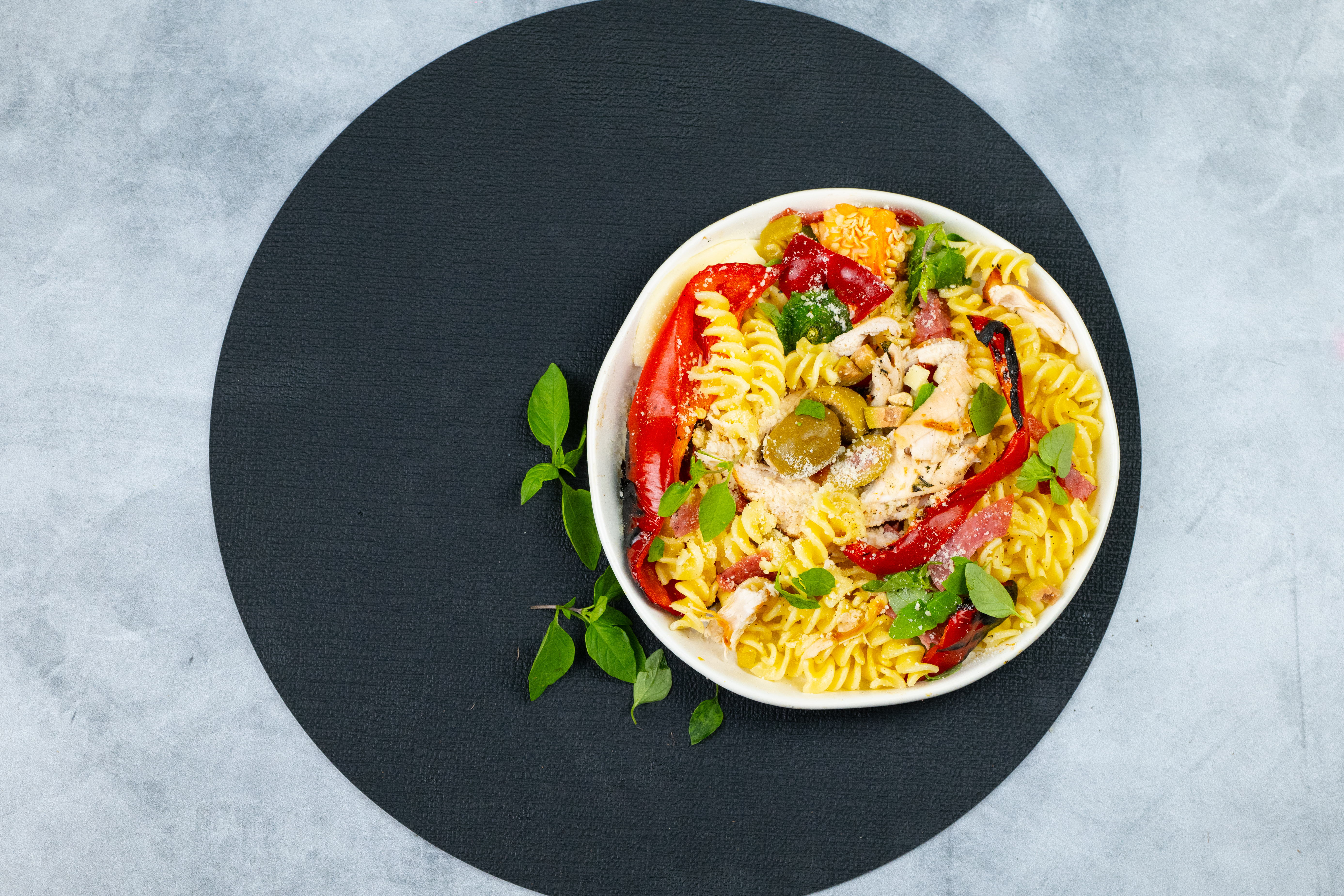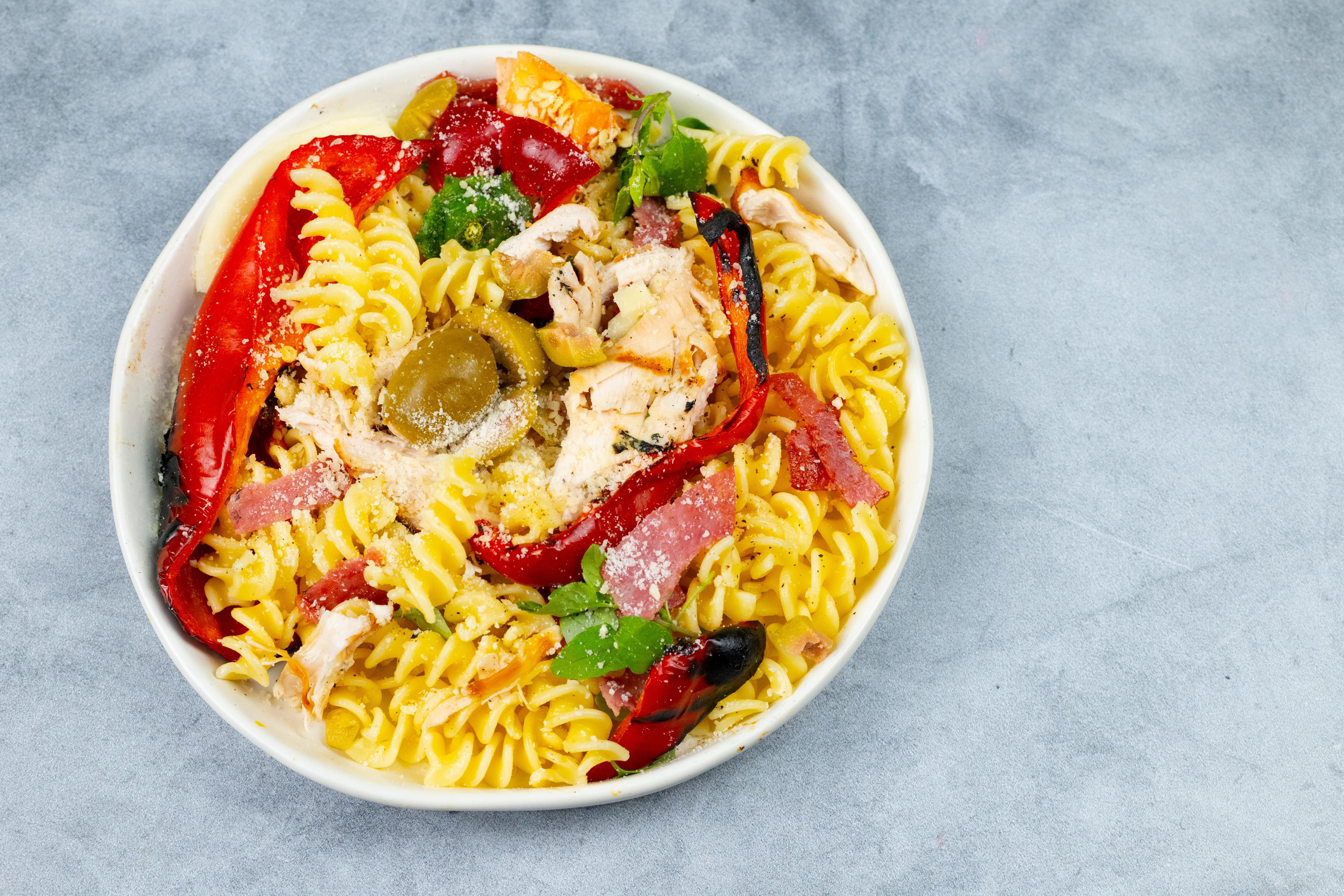Step 3 -In a large bowl, add the cooked fusilli, the salami, the turkey, the provolone, the Asiago, the olives, the red peppers, the remaining salt, and the remaining pepper and toss to combine.