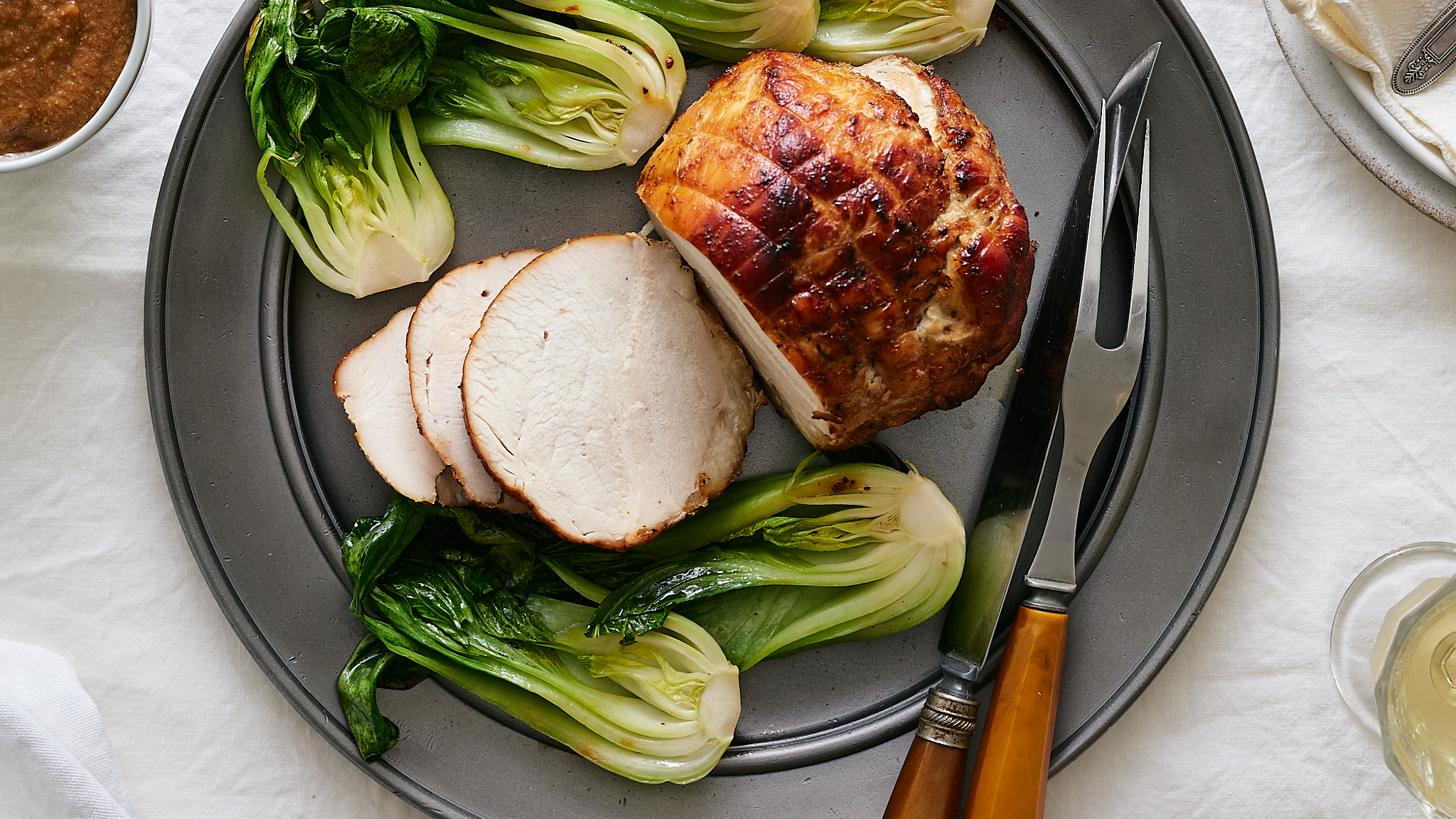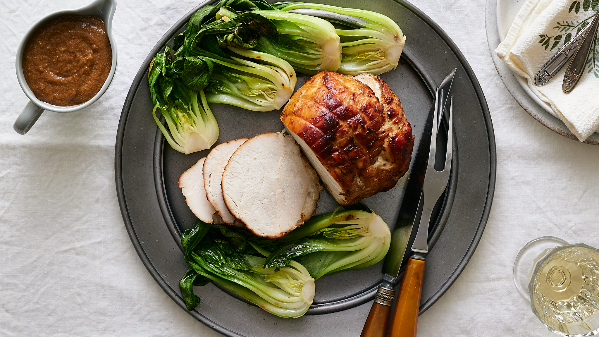 Step 13 -Serve the turkey with the roasted baby bok choy, topped with the gravy.