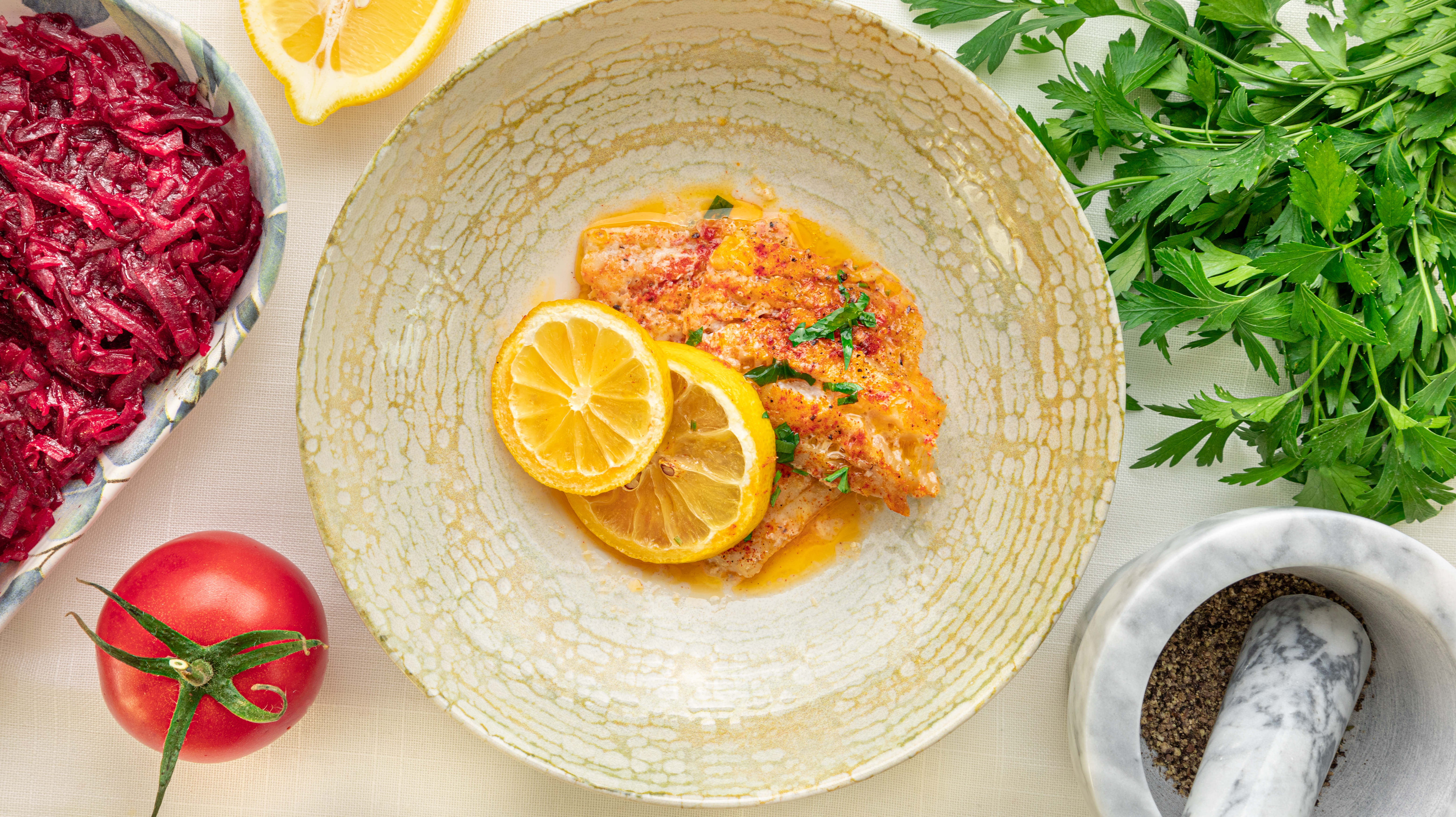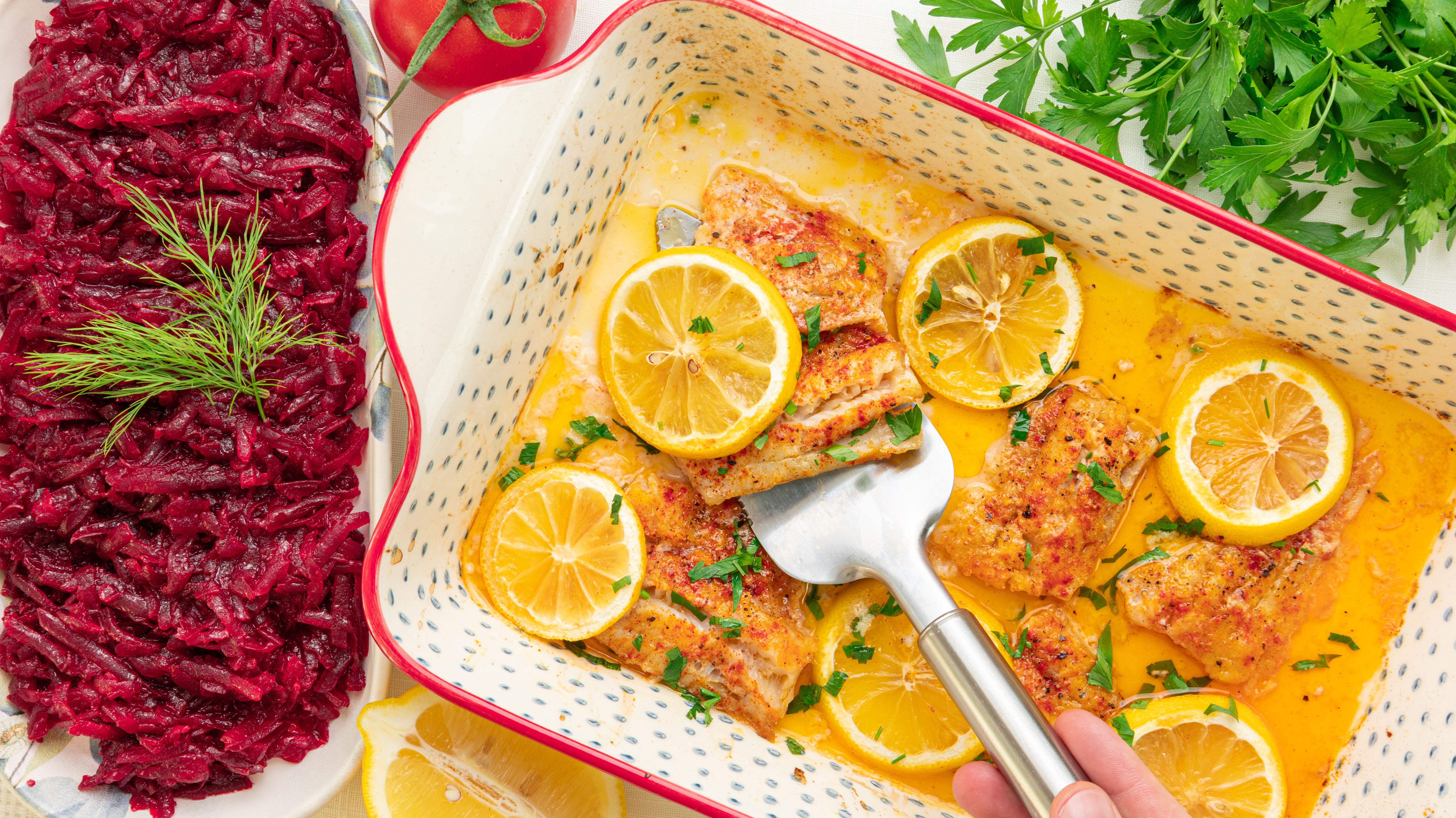 Step 5 -In a single layer, transfer the seasoned fillets to the prepared baking dish and add the butter slices and the sliced lemons to the top of the fillets.