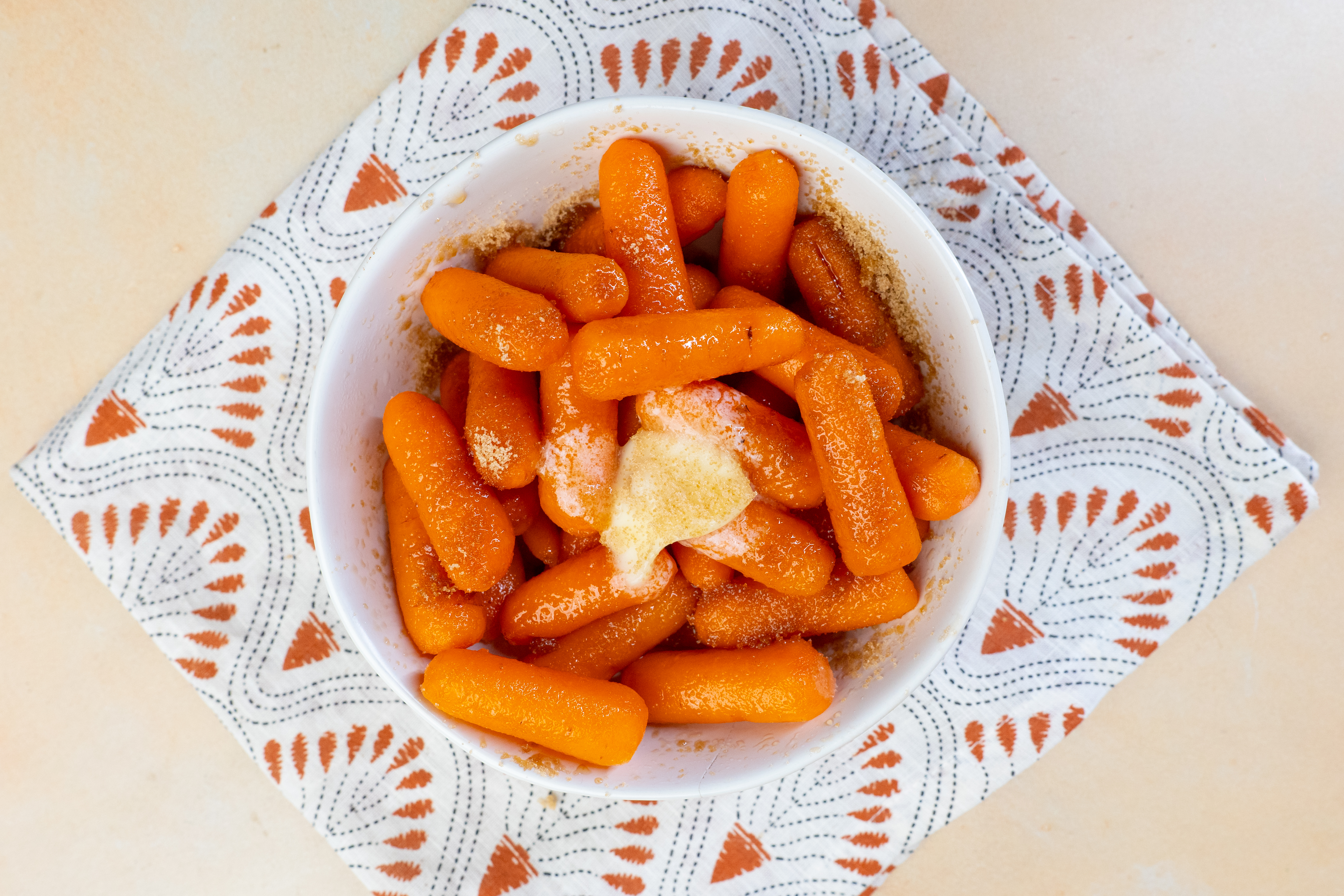 Step 5 -Add 2 tablespoons of the butter, 1 tablespoon of the sugar, and 1 teaspoon of the salt to the carrots and stir until well-combined.