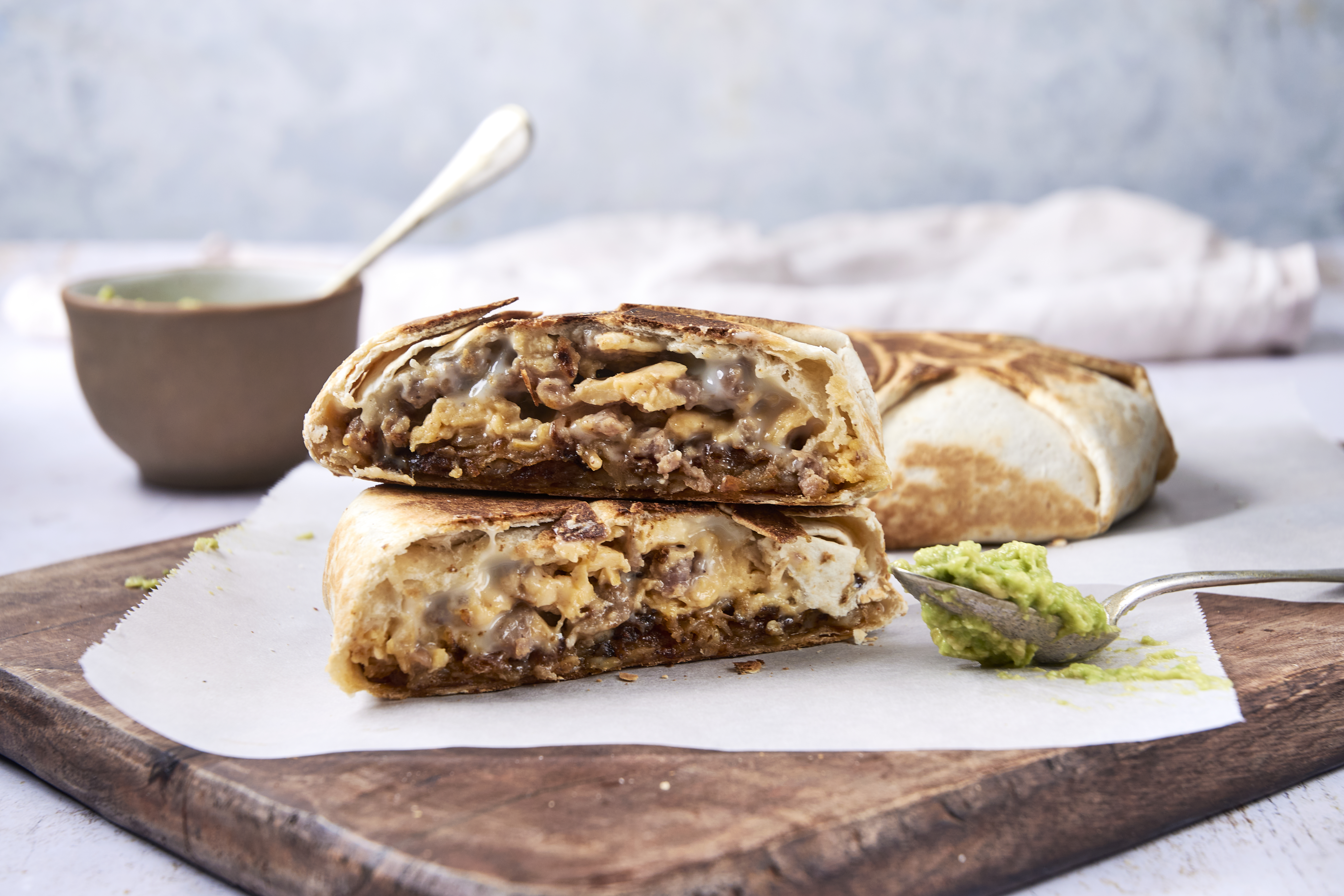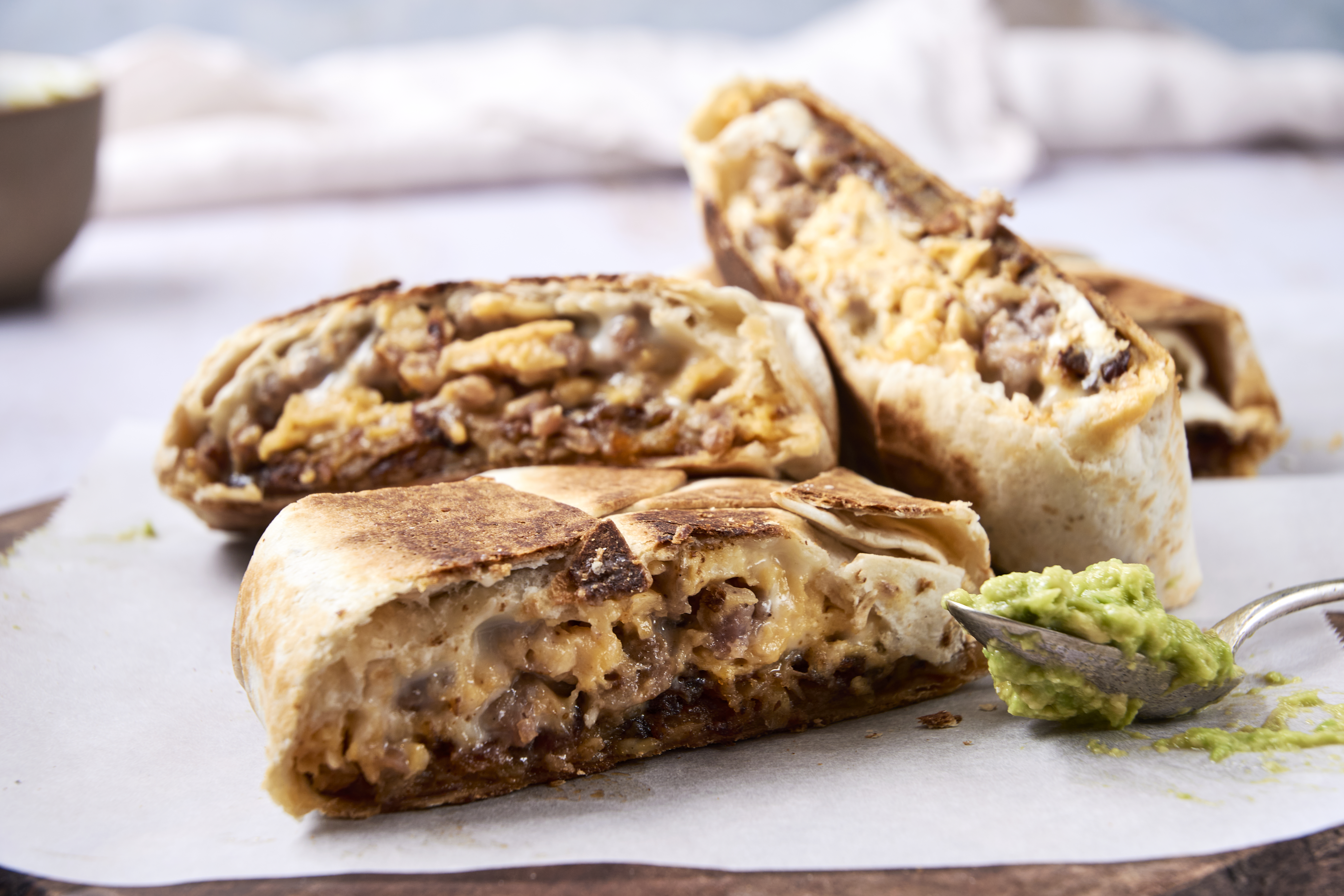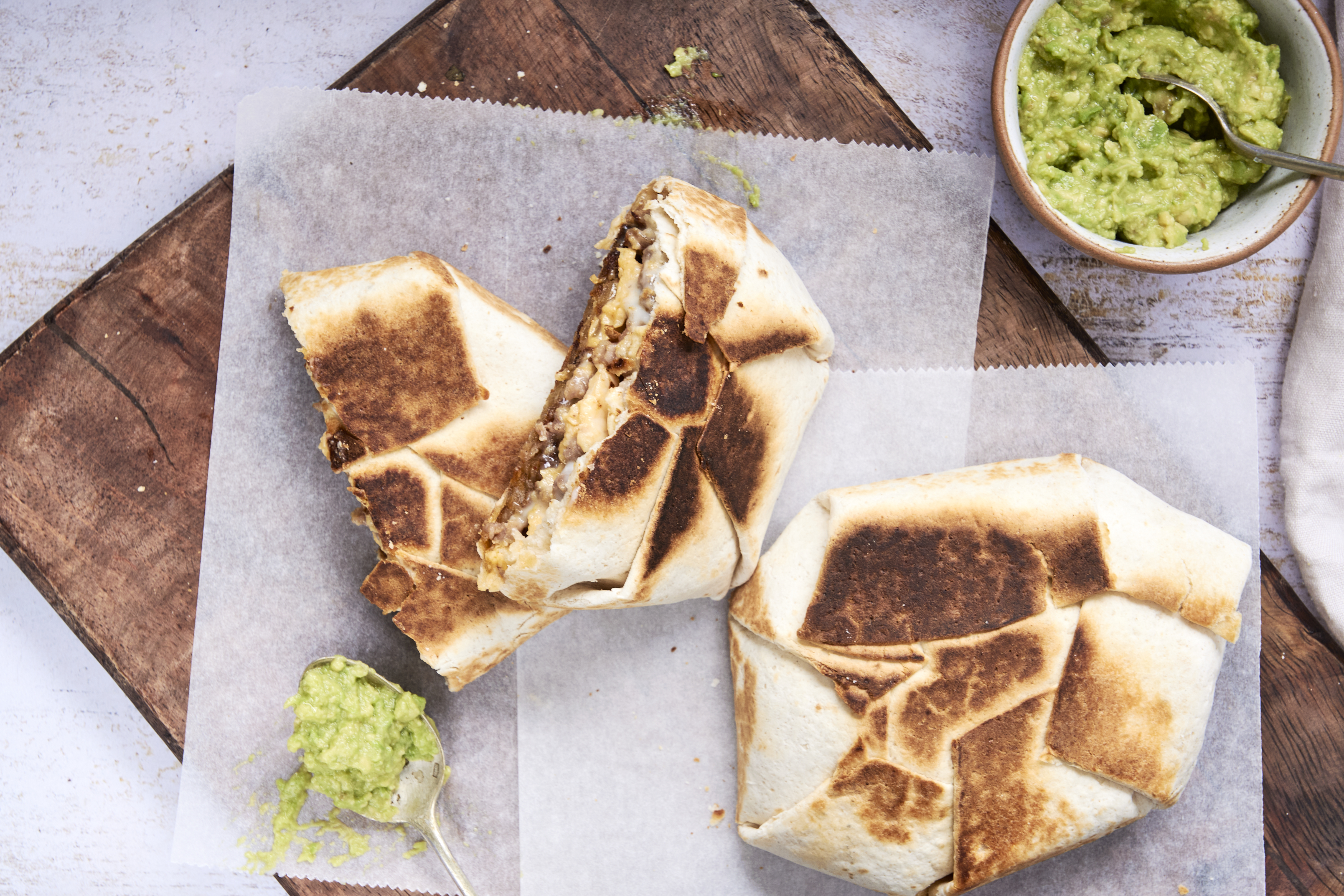 - 5 burrito-sized flour tortillas, divided