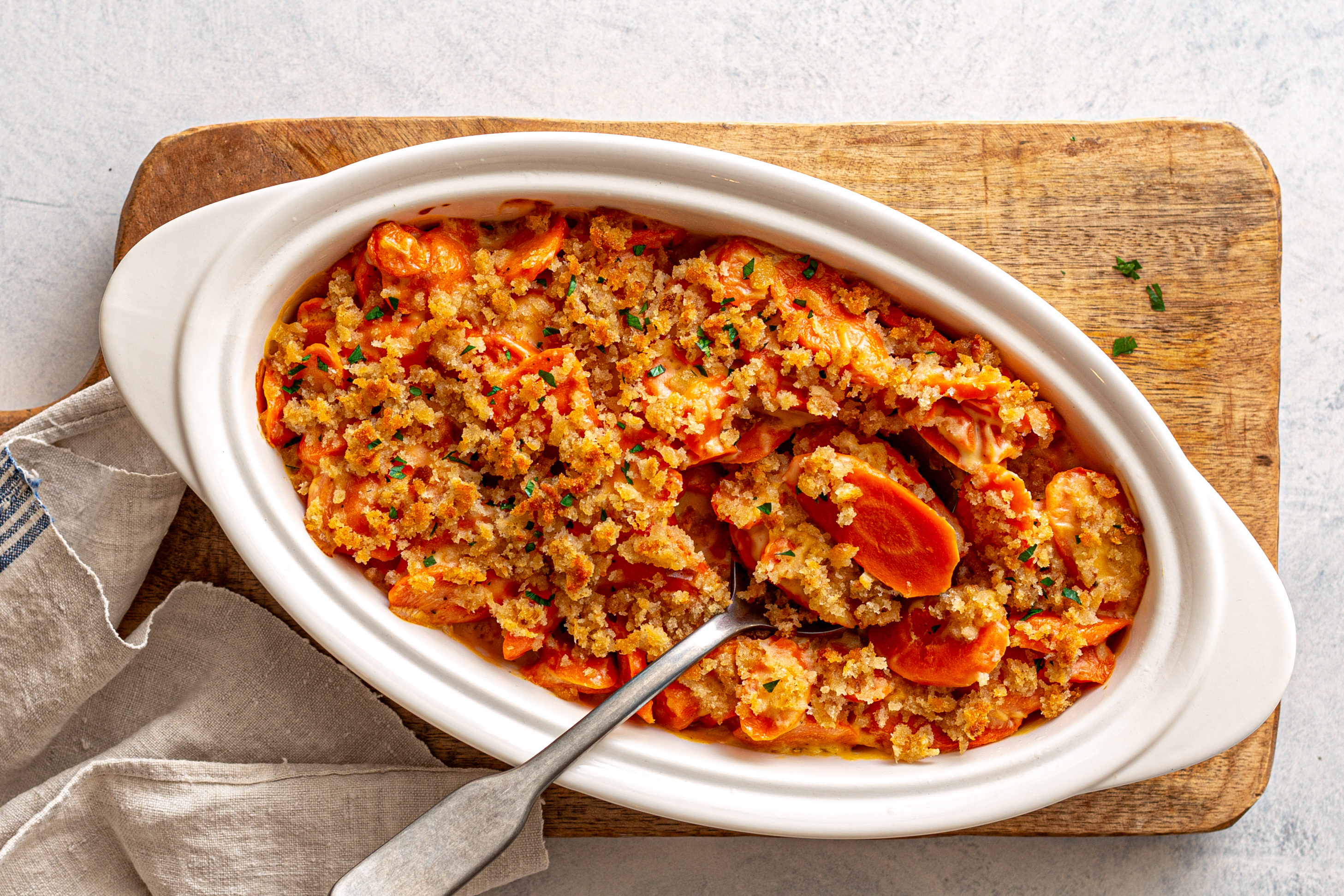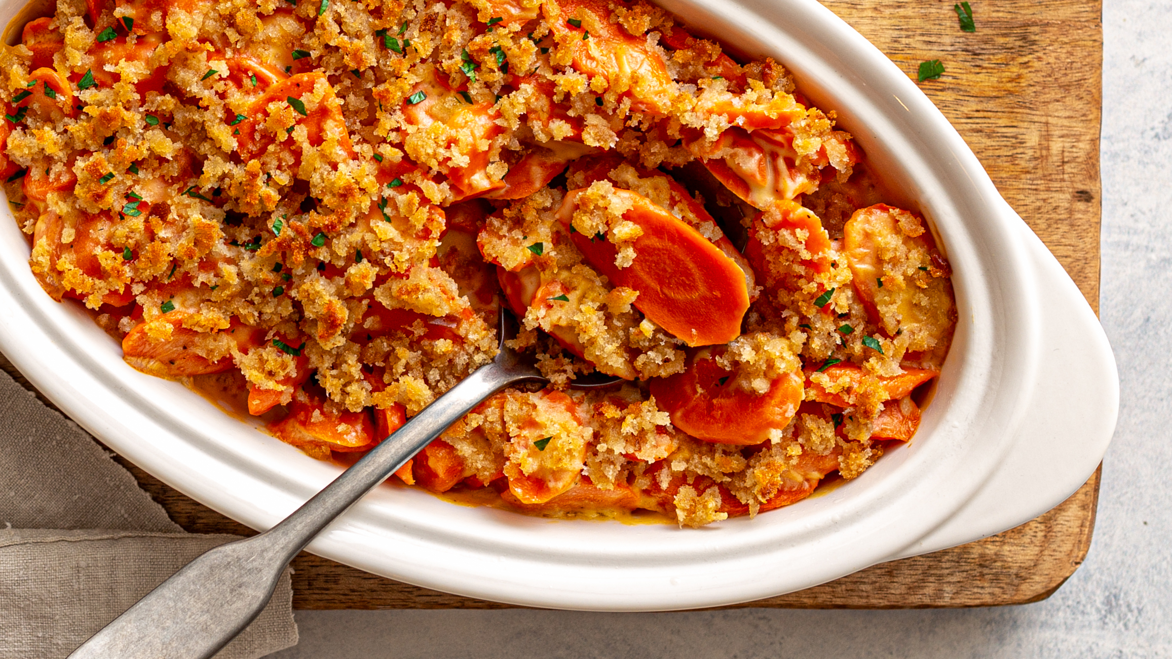 For too long we've seen carrots as bland or (gasp!) as a mere topping for salads! Carrots deserve their turn in the limelight! That's why the Cheesy Carrot Bake exists: it loads up the tender slices of bright and colorful carrots with a creamy, cheesy sauce. And on top are crunchy breadcrumbs, basically the ball gown of the culinary world. Cheesy Carrot Bake will certainly be crowned the belle of the ball at your table!