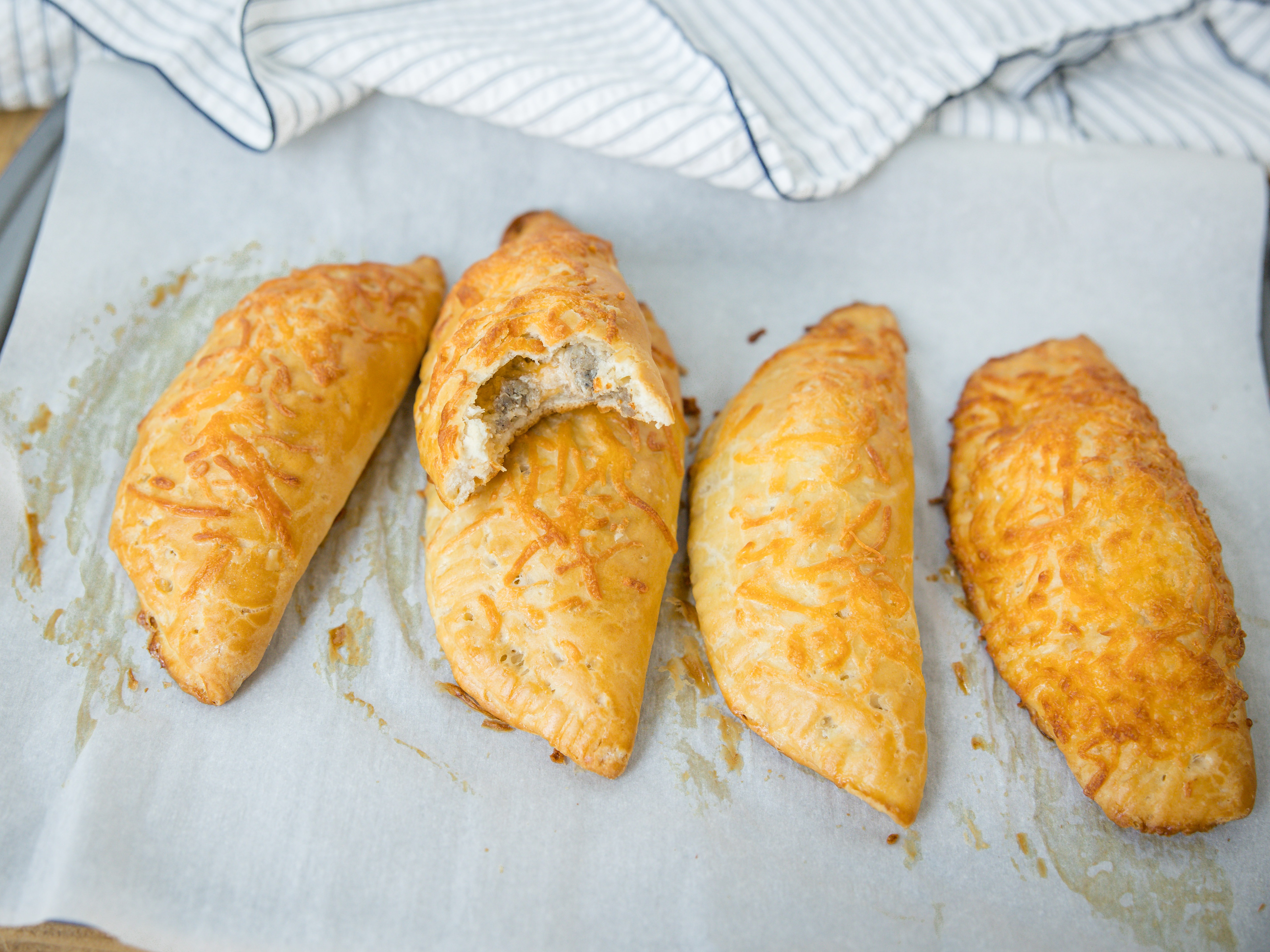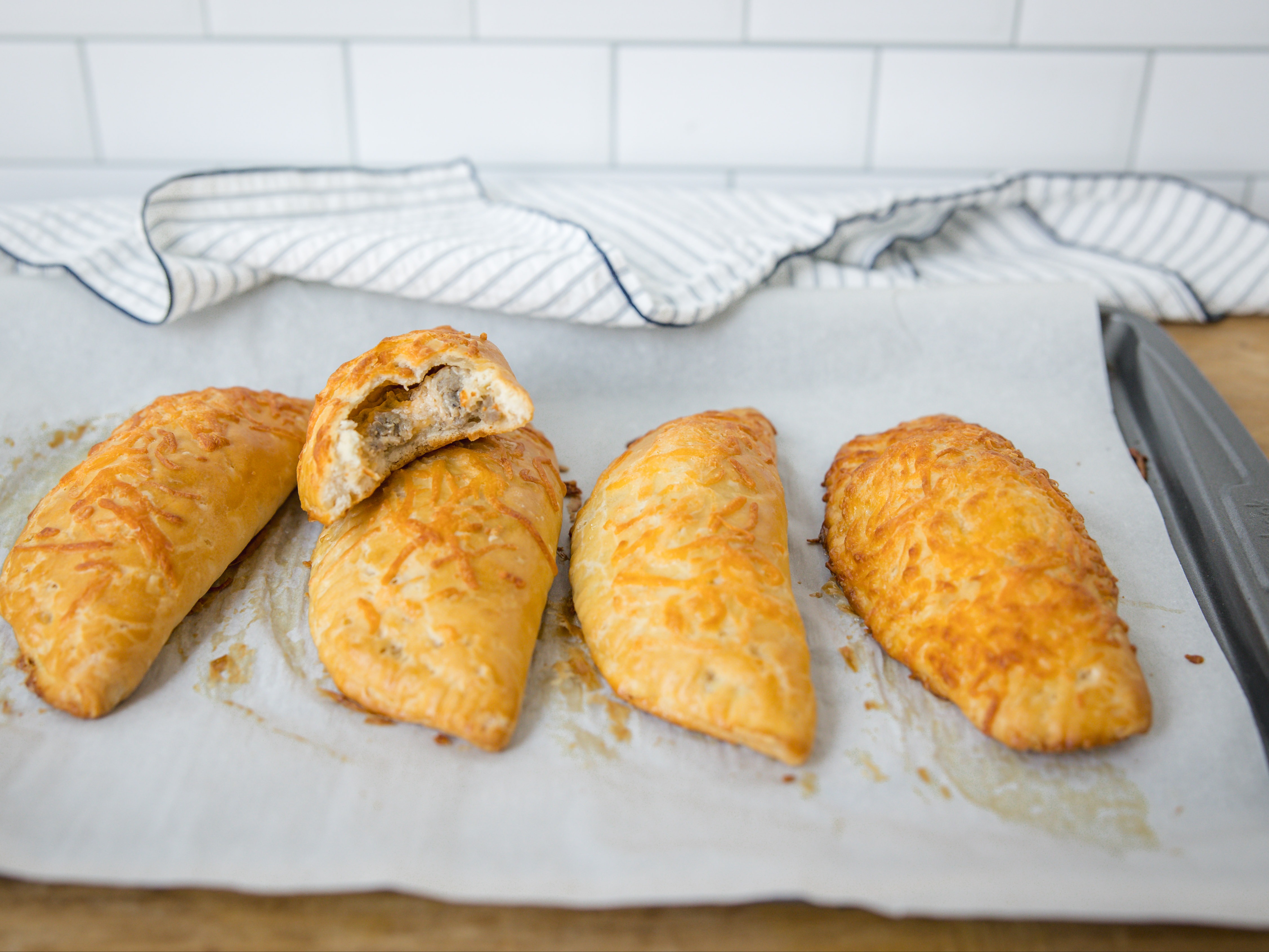 Mmm, these Cheesy Sausage Turnovers are perfect for a cozy lunch in! Sink your teeth into these beautifully golden bites that are crusted with melty cheese and oozing with a warm, creamy sausage filling and you'll feel right at home. They're super easy to make but still have that "cooked-all-day" homemade taste, which makes these Cheesy Sausage Turnovers just the best!