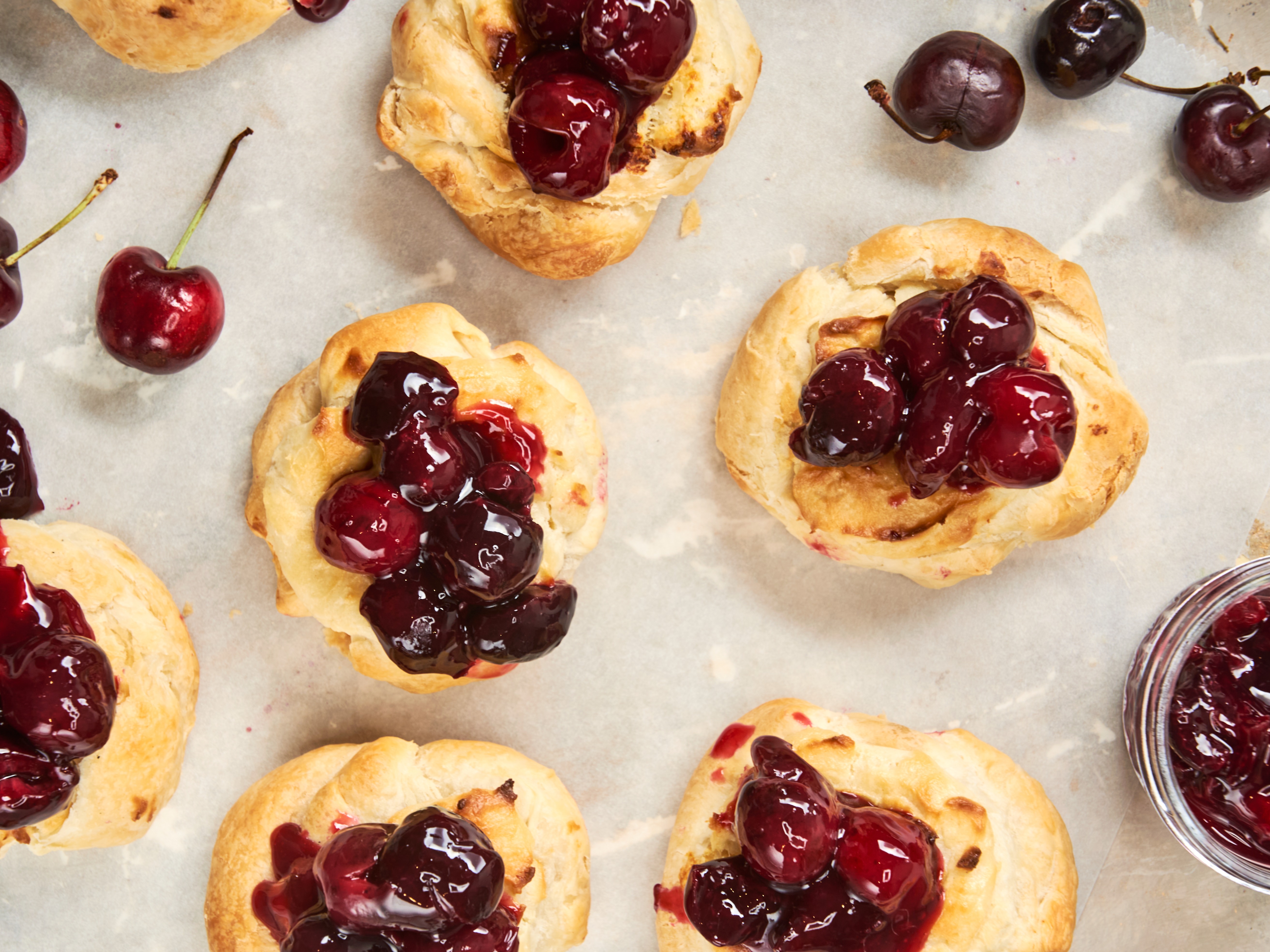 Step 10 -Transfer the baking sheet from the oven and evenly top the filled crescents with the cherry pie filling.