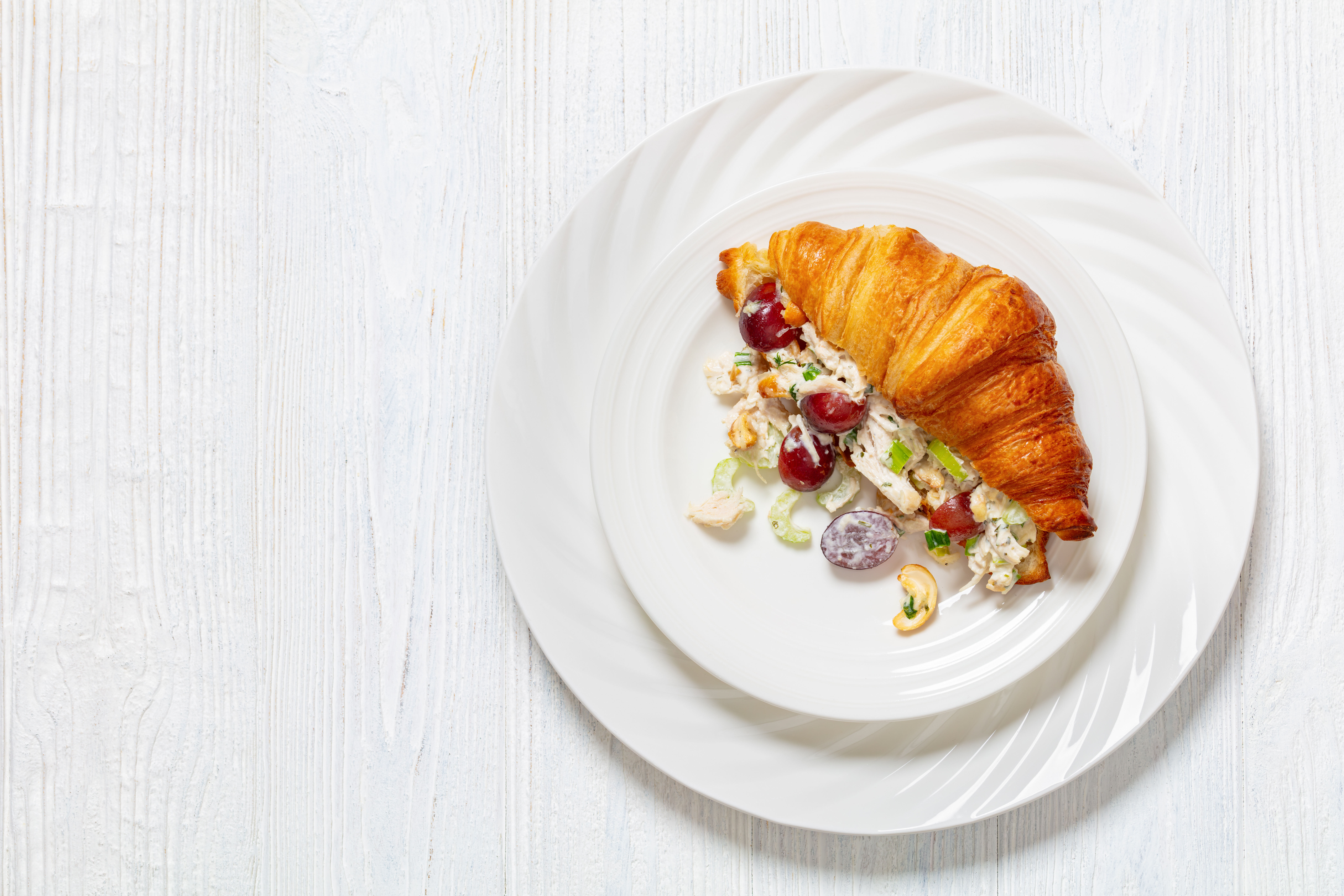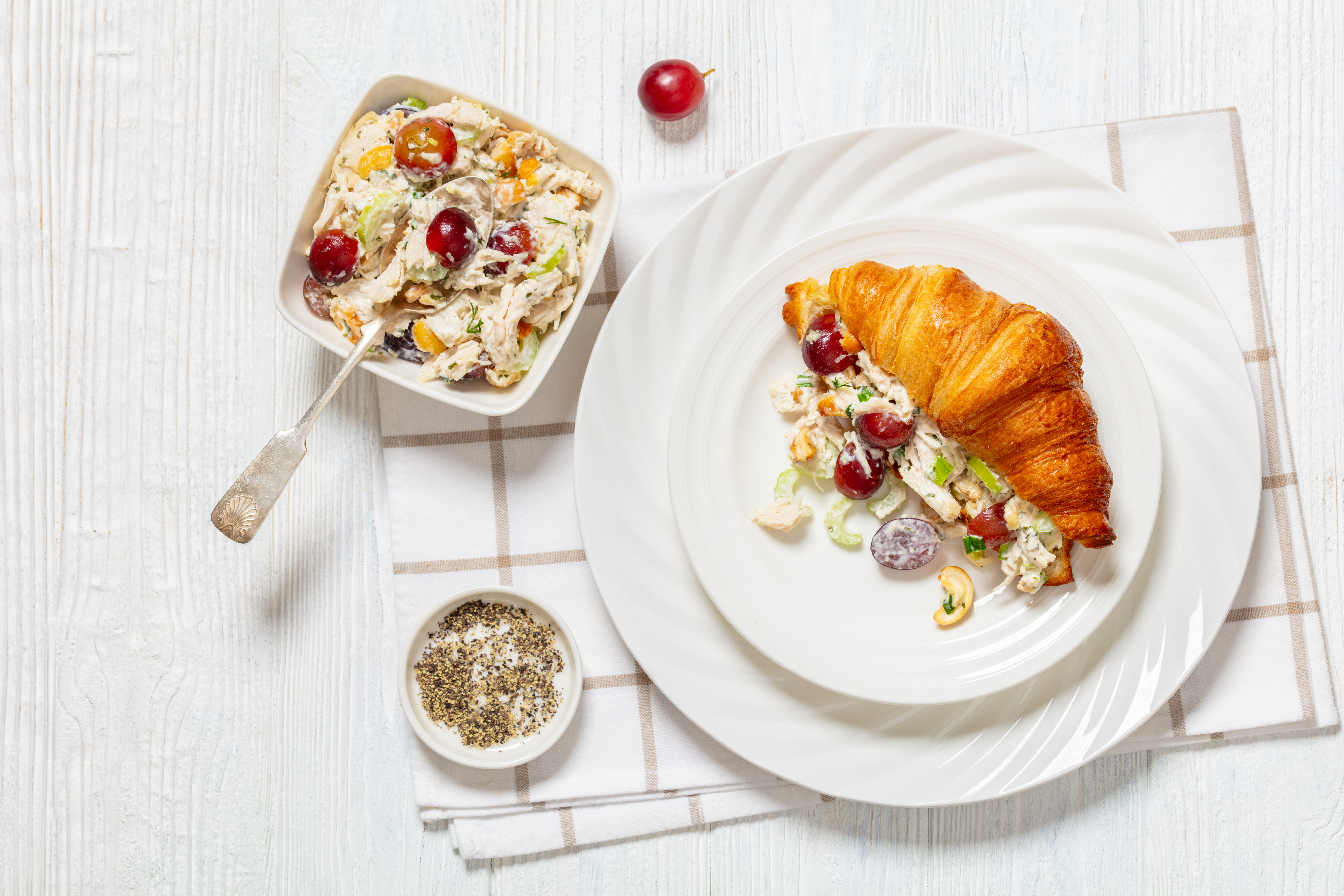 Hey! It's Chicken Salad With Grapes! How cool! Savory shredded chicken and refreshing red grapes make for a great pair already, and that's before it's coated in a tangy and beautifully seasoned mayo sauce. When Chicken Salad With Grapes is sandwiched between buttery, flaky croissants, it becomes an exceptional lunch... and such a speedy one to boot!