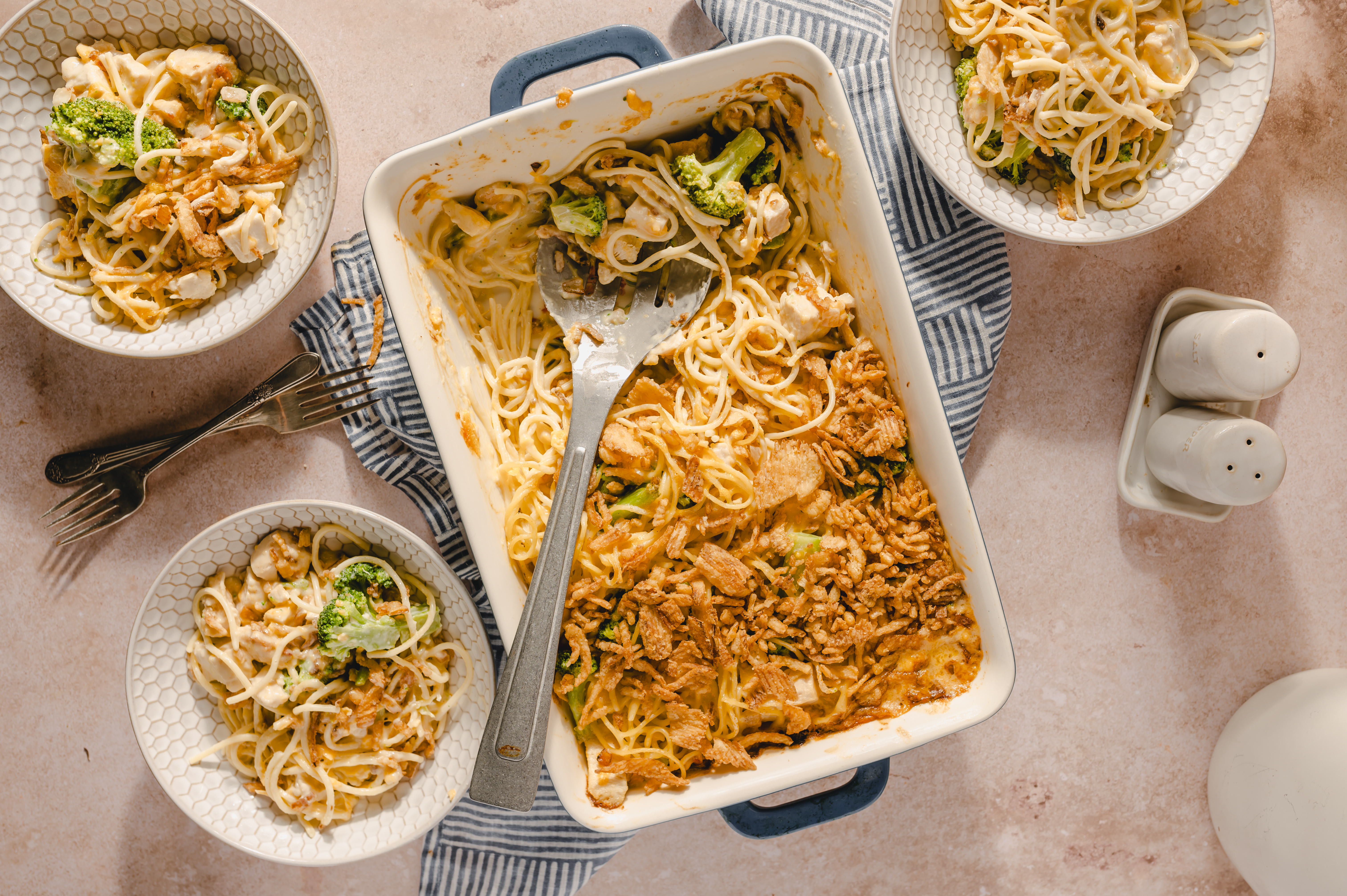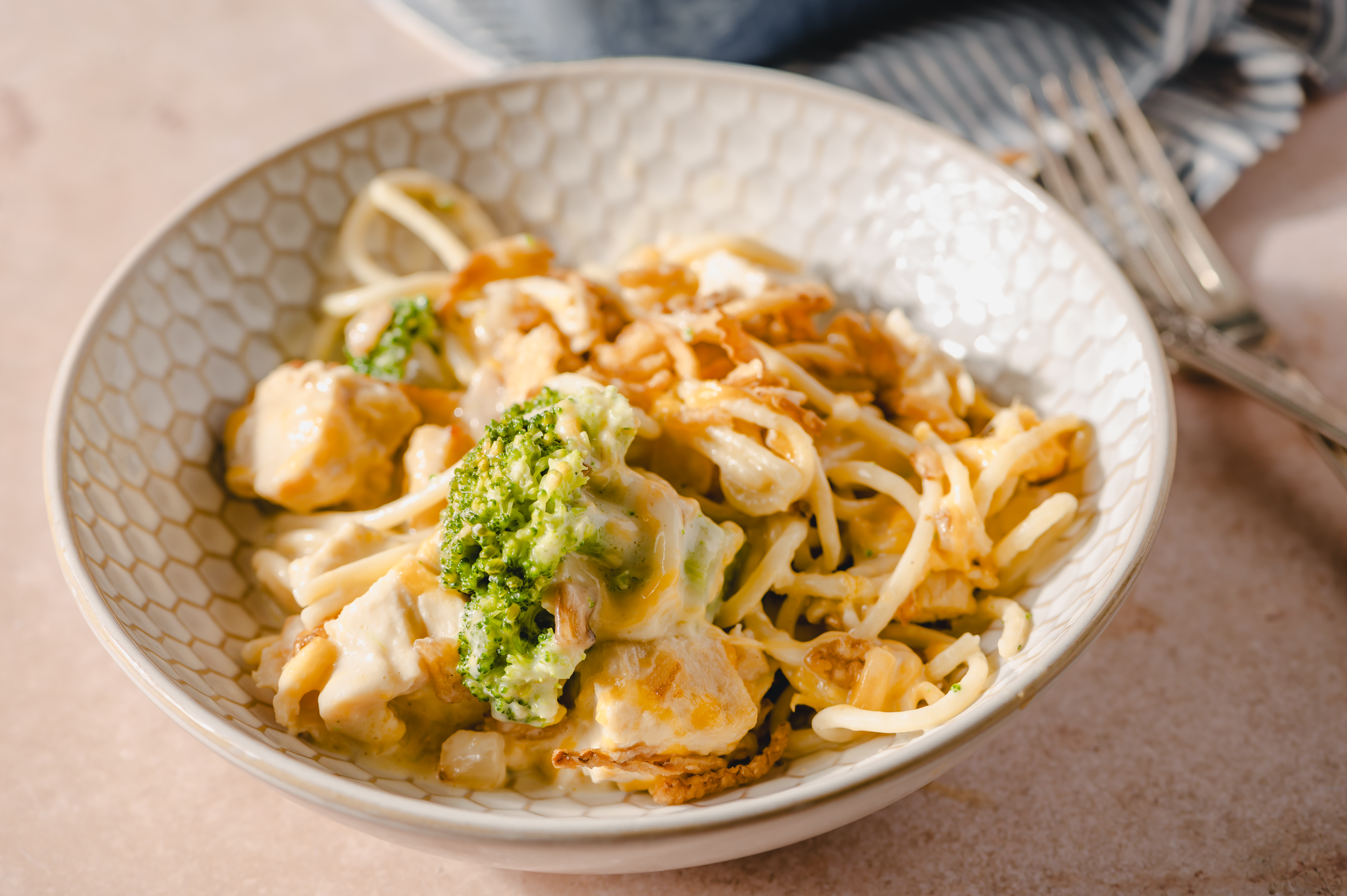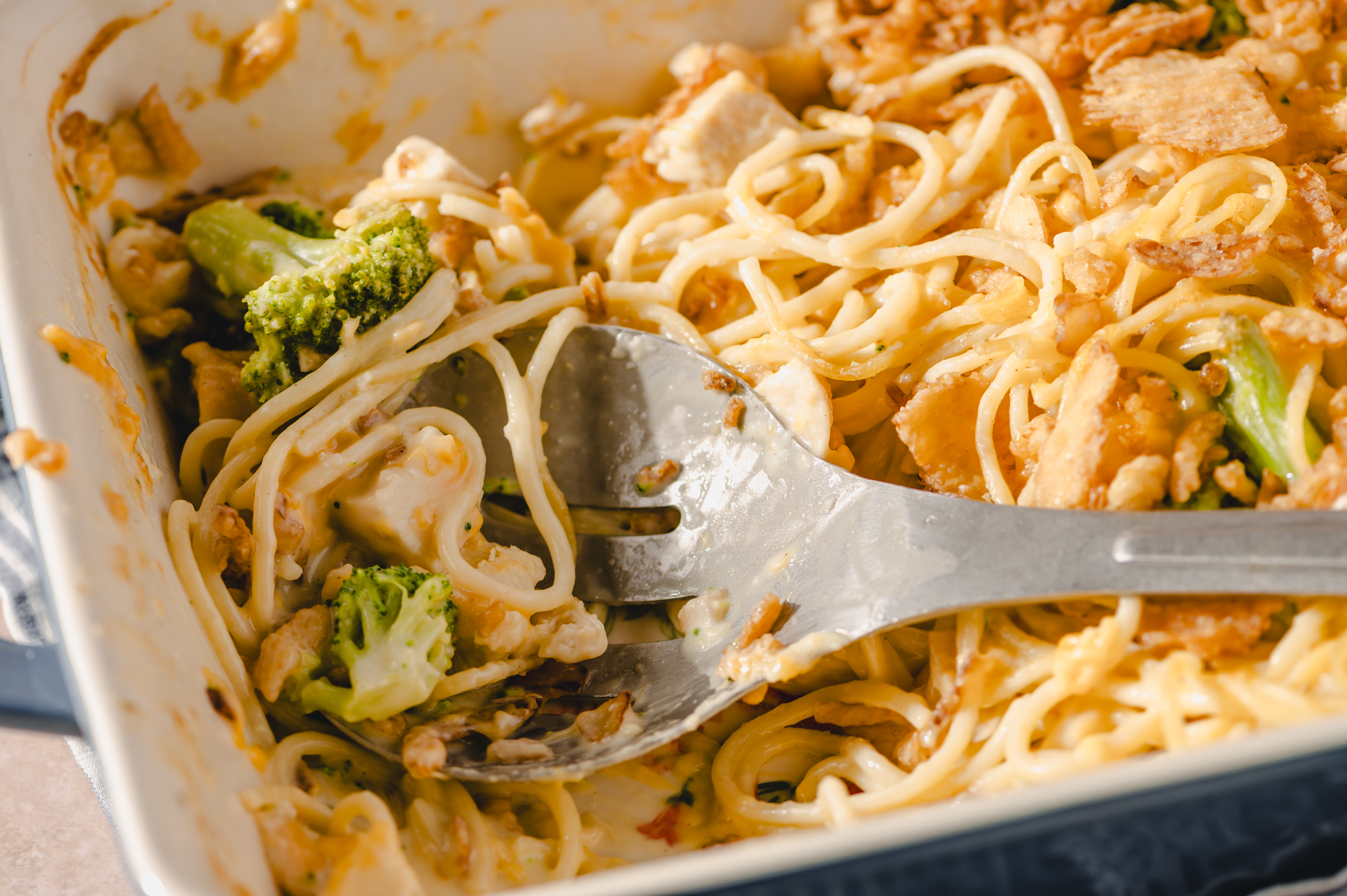 The Chicken Spaghetti Bake is simplicity in a casserole dish, but it knows that just because it is simple doesn't mean it has to be boring! It's filled with chicken, cheese, and a creamy sauce, everything getting mixed together with tender spaghetti to make a savory, hearty meal. A little broccoli adds a welcomed freshness, and a topping of crunchy fried onions really makes Chicken Spaghetti Bake something special. Let the simple (but tasty) life charm you and your taste buds!