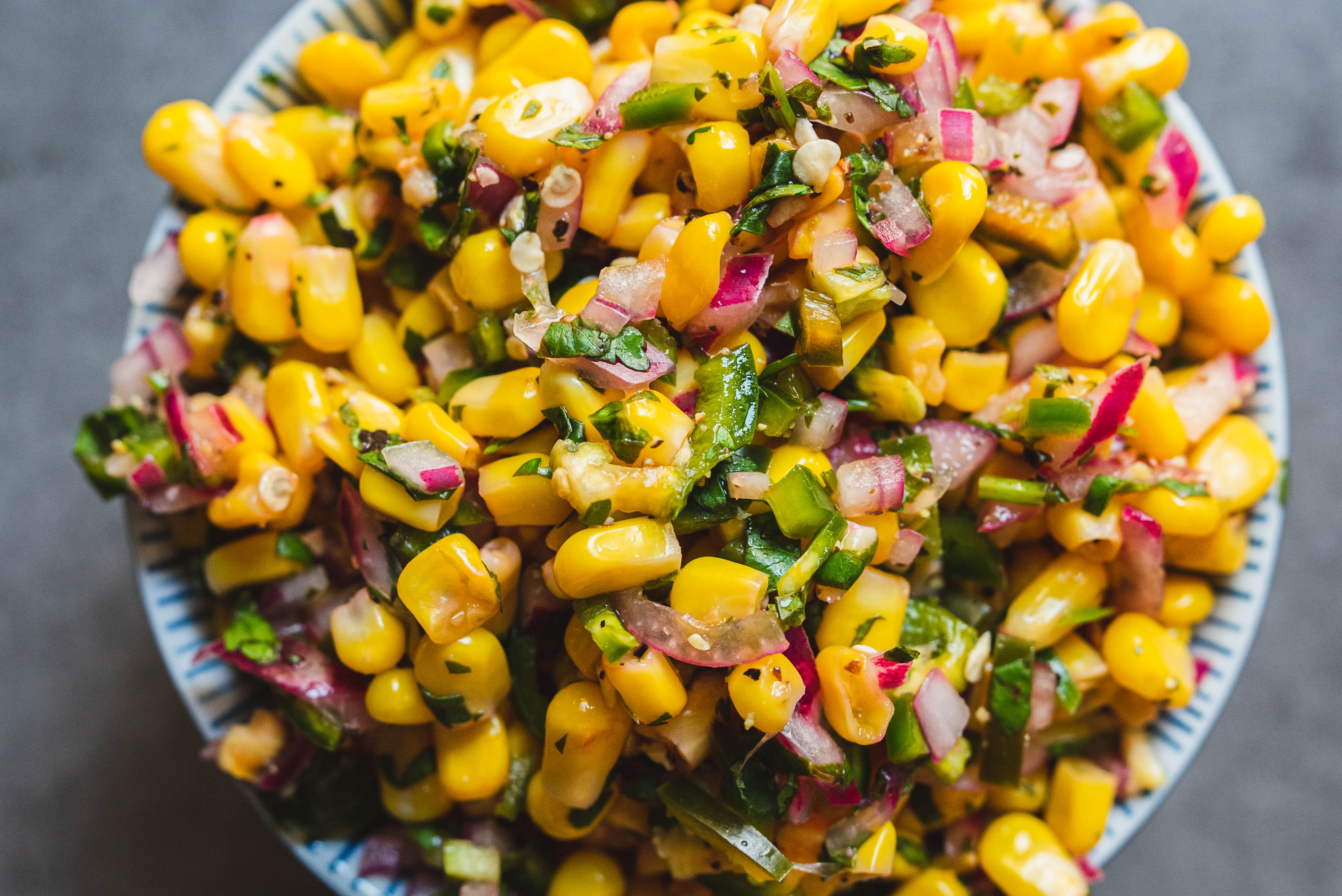 Step 1 -In a bowl, combine the corn, the jalapeños, the red onion, the cilantro, the lime juice, 1/2 teaspoon of the salt, and 1/2 teaspoon of the pepper.