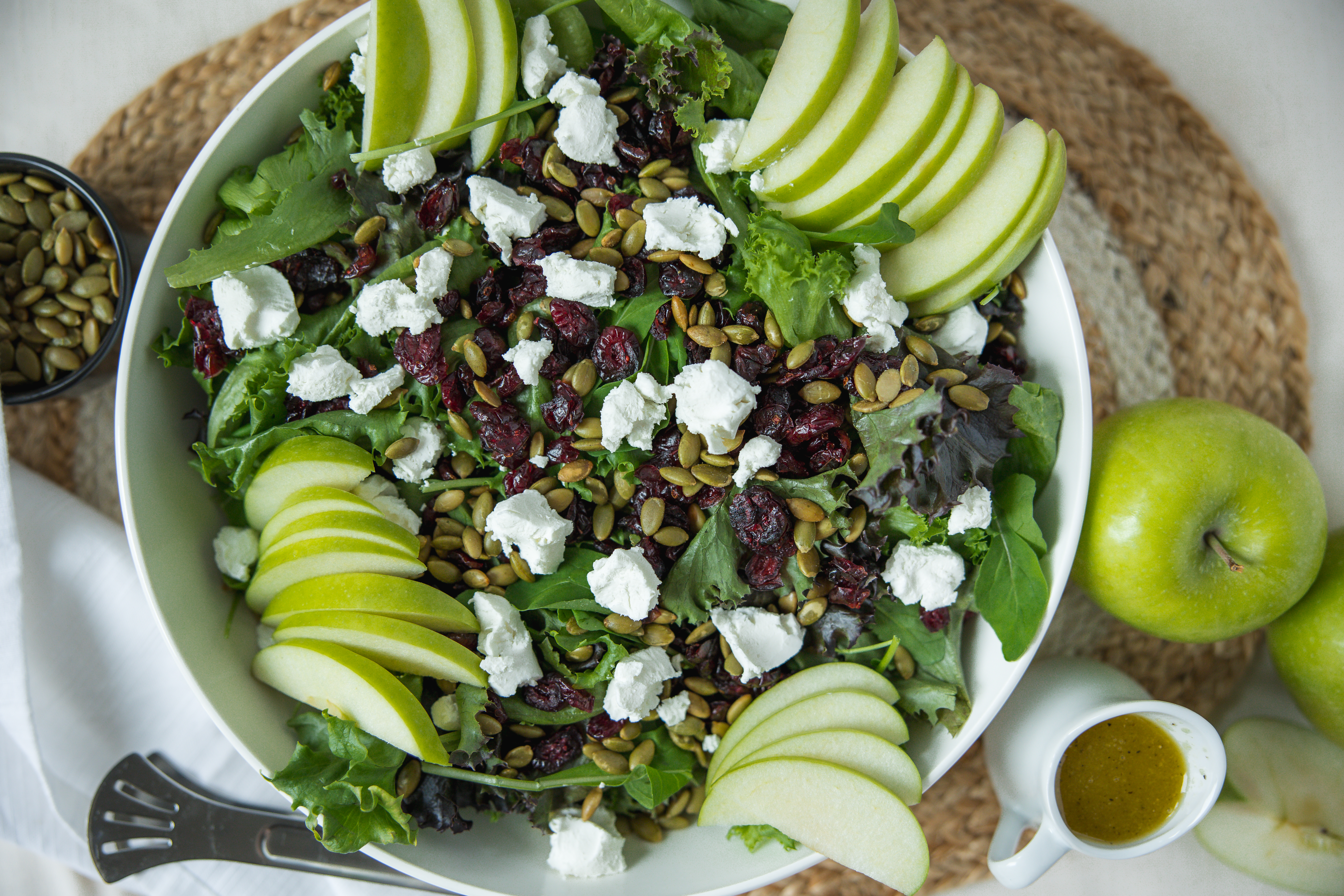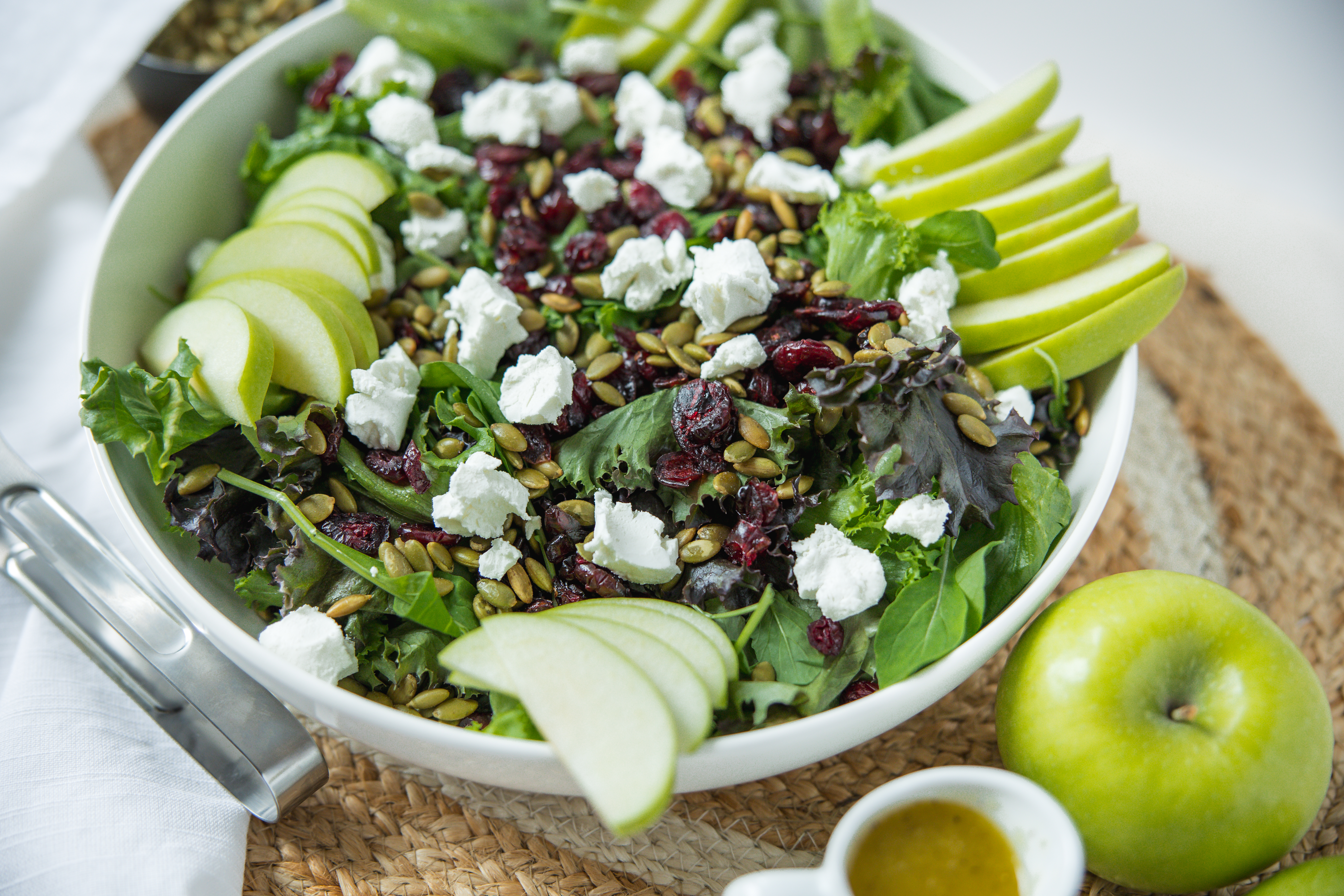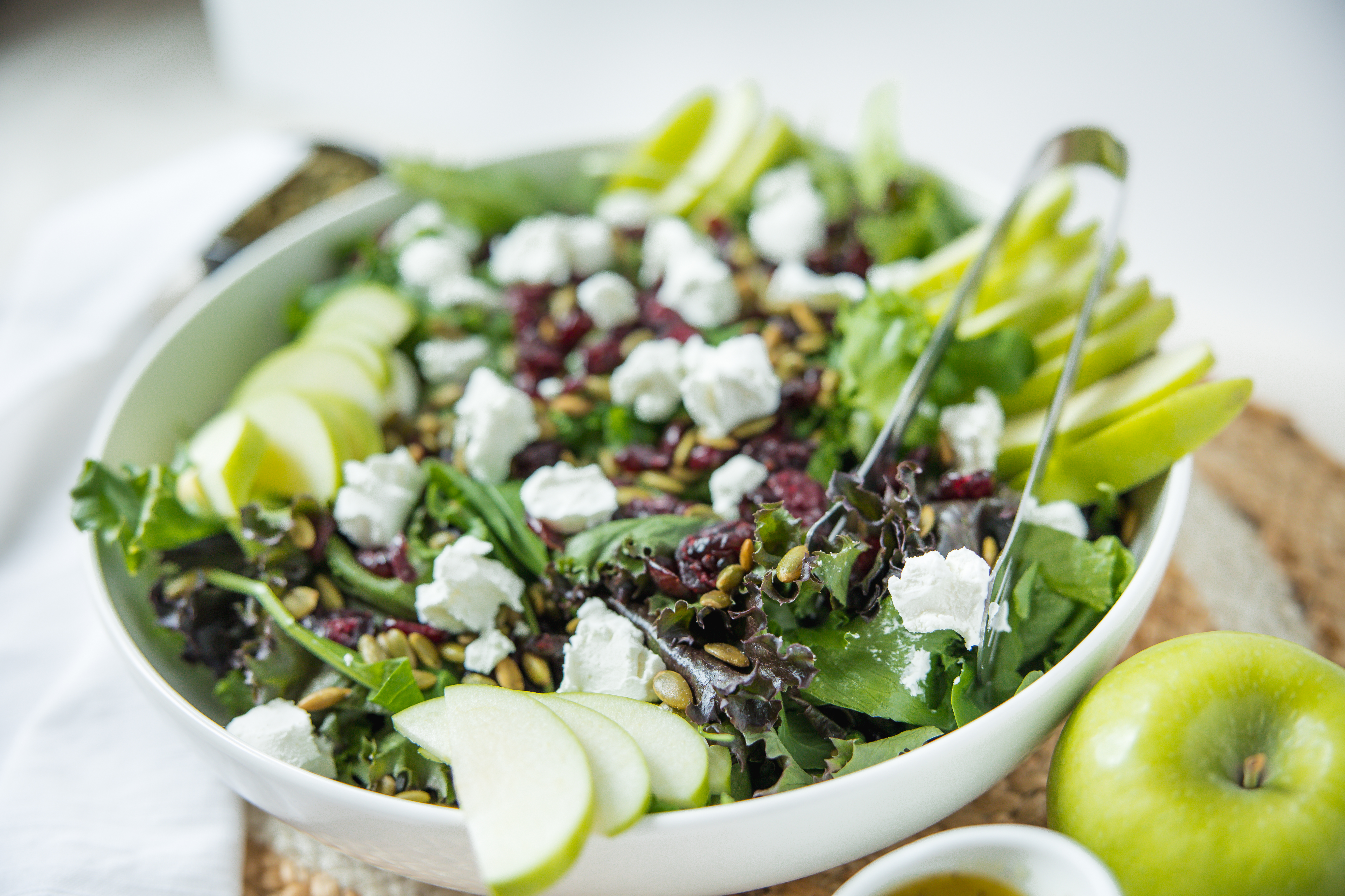 This is a delightfully simple but amazingly delicious salad! Cranberry Apple Salad is just loaded with tart dried cranberries, crisp and juicy apples, tangy goat cheese, and fresh spring greens! For crunch, Cranberry Apple Salad includes nutty pepitas and a tangy and for a little zing, a sweet homemade vinaigrette. This salad really does have it all!