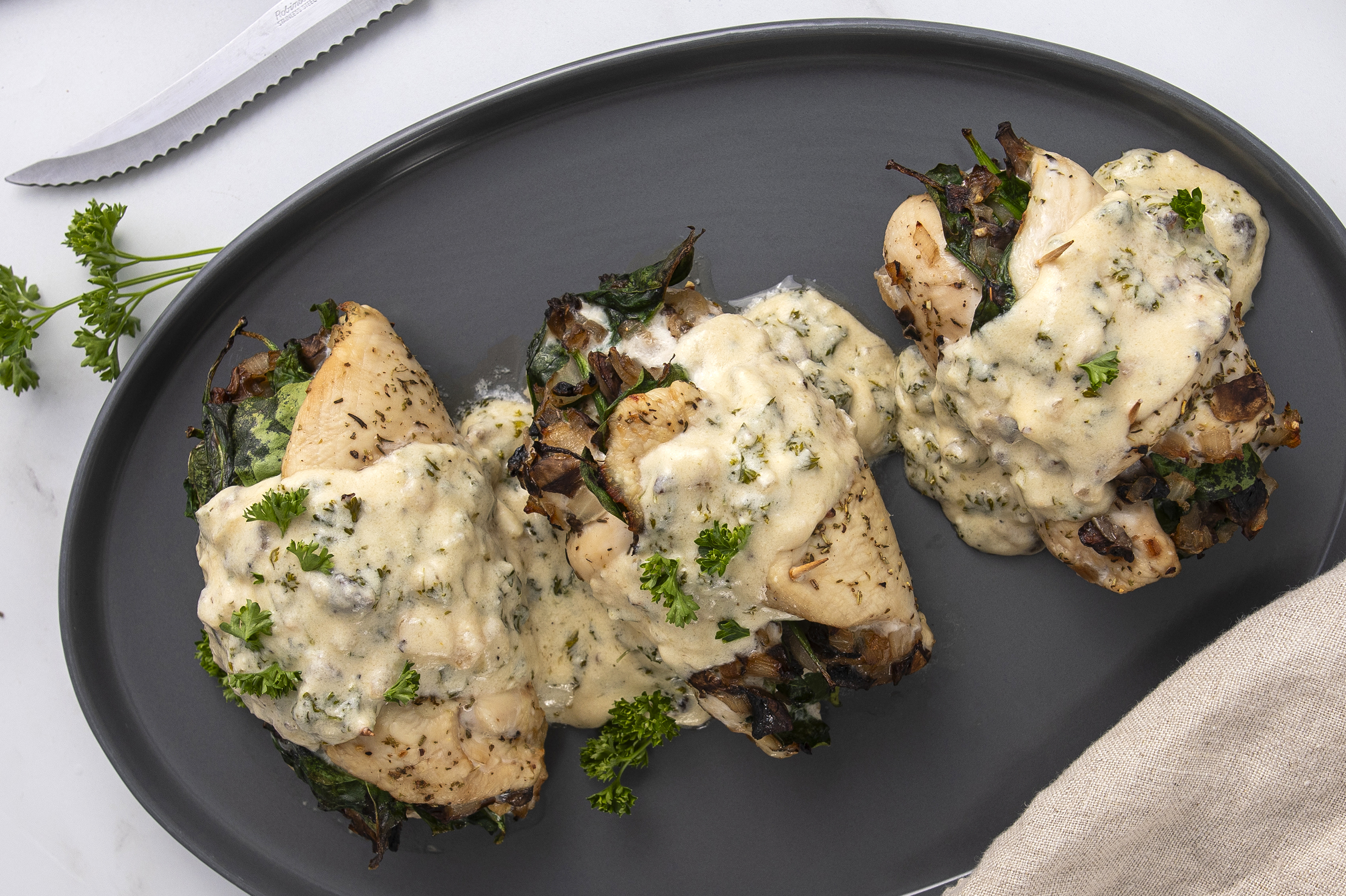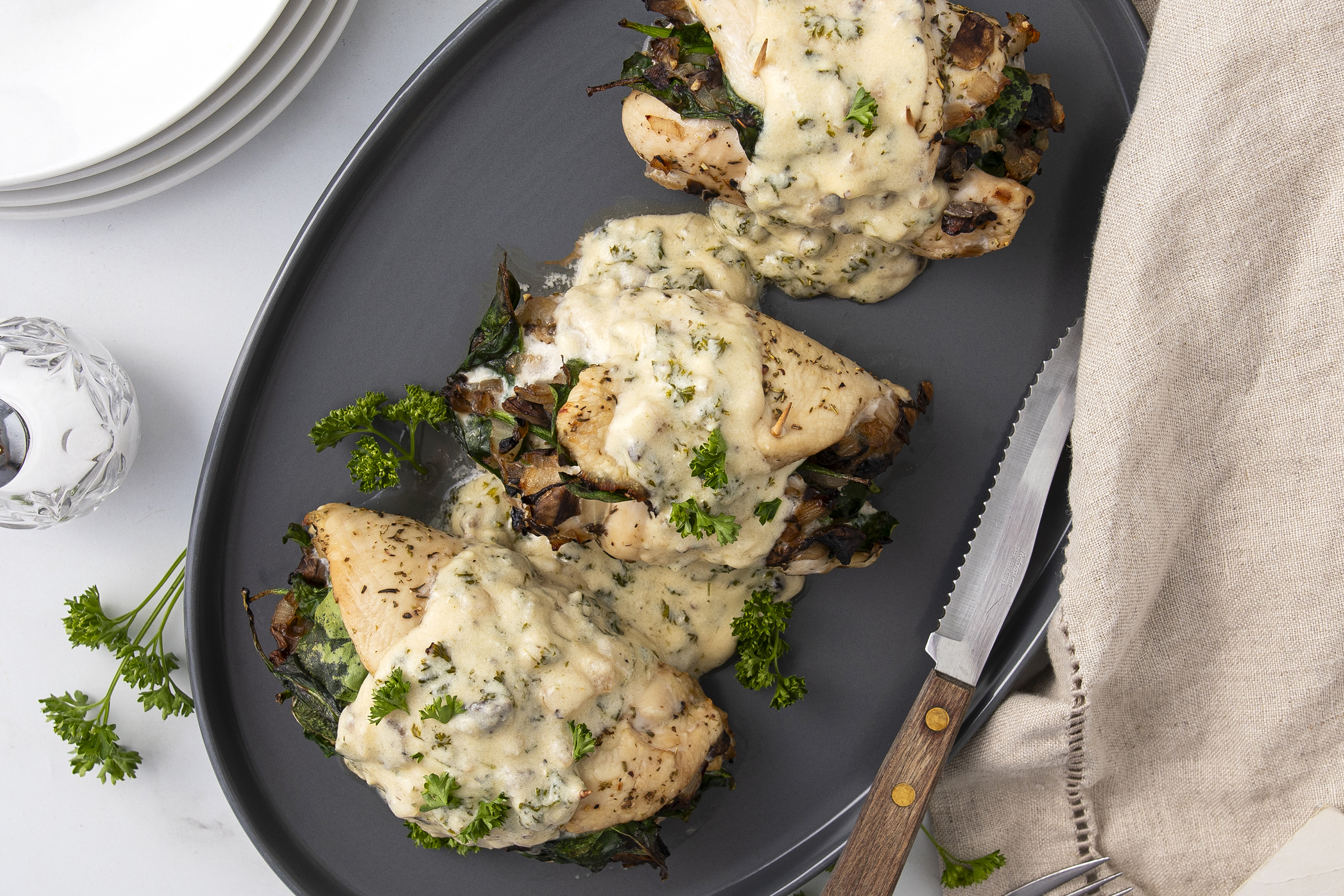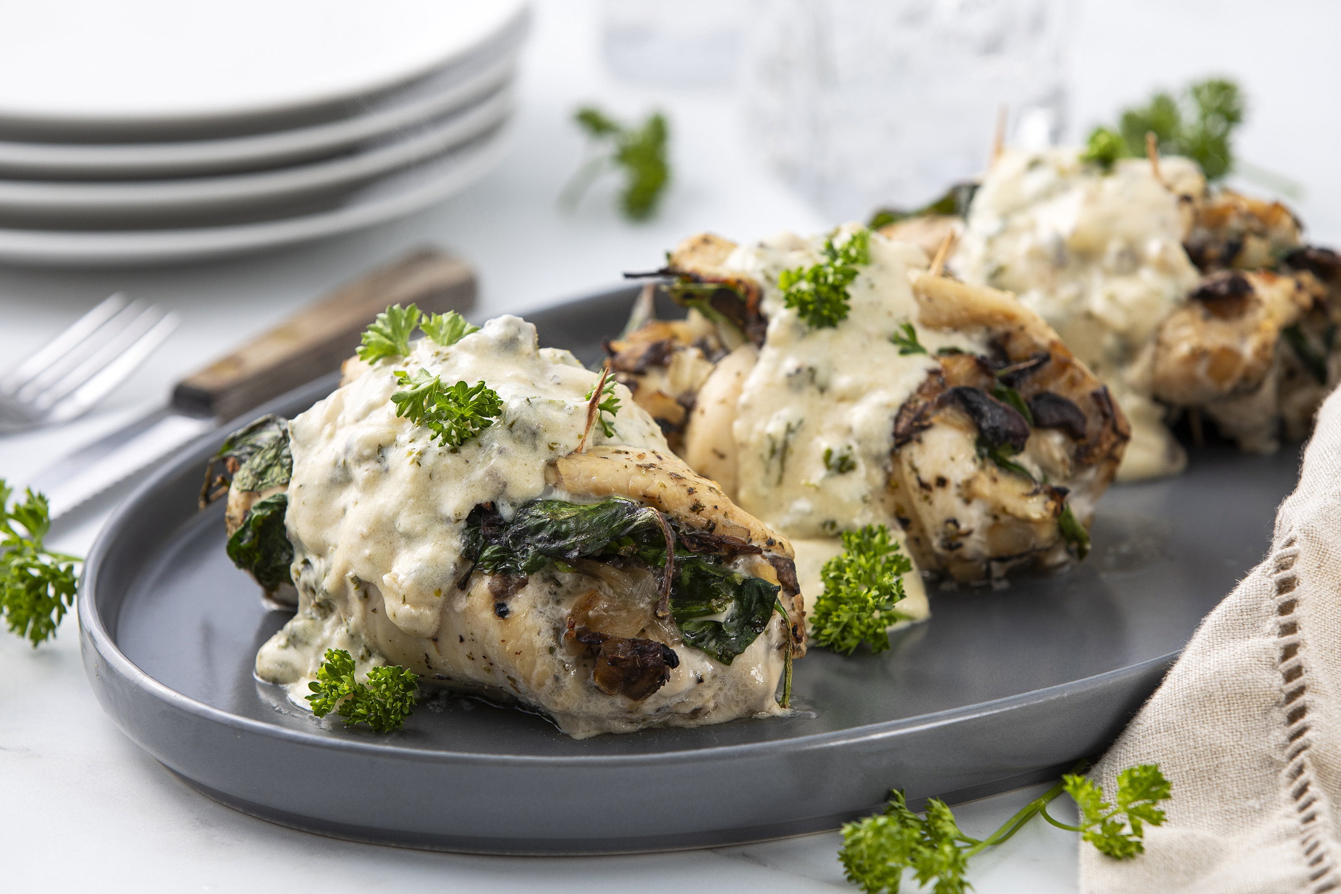 This is quite the elevated chicken dish, but doesn't your partner deserve the best? Date Night Stuffed Chicken boasts juicy, savory chicken breasts rolled up and stuffed with delicious spinach, mushrooms, and onions. A creamy Alfredo sauce drapes everything in extra flavor and luxury! You really can't go wrong with Date Night Stuffed Chicken; it's a deliciously romantic gesture!