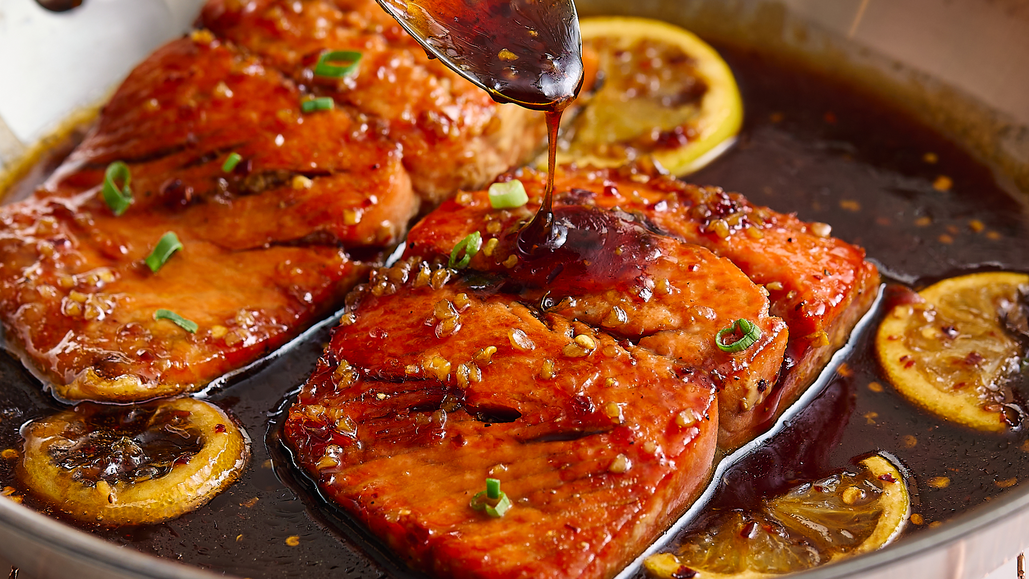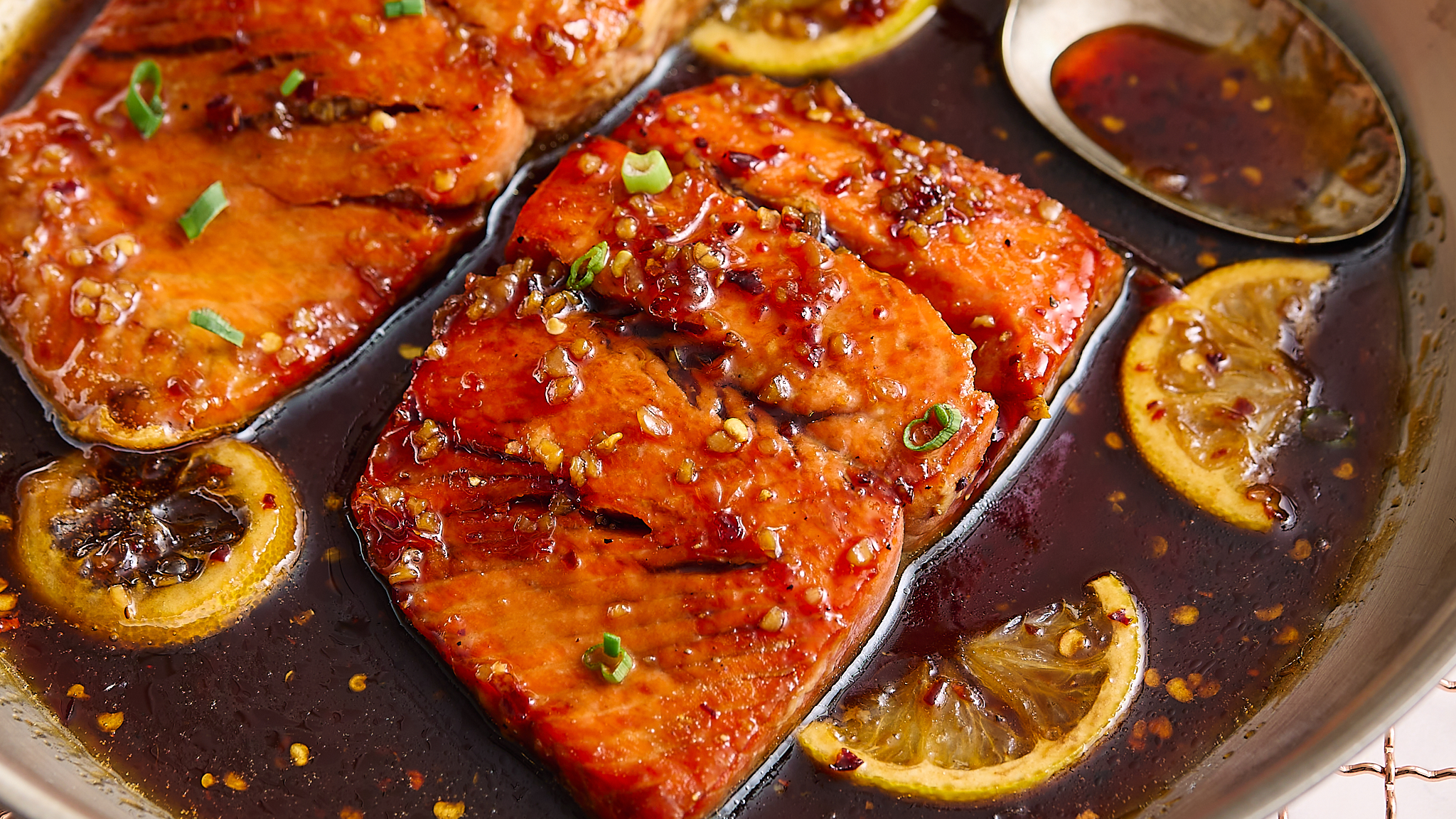Step 7 -Add the honey mixture and the lemon slices to the skillet and cook, while occasionally basting the salmon fillets , until the sauce is reduced by about 1/3 and the fillets reach an internal temperature of 145 degrees F, about 2-4 minutes.