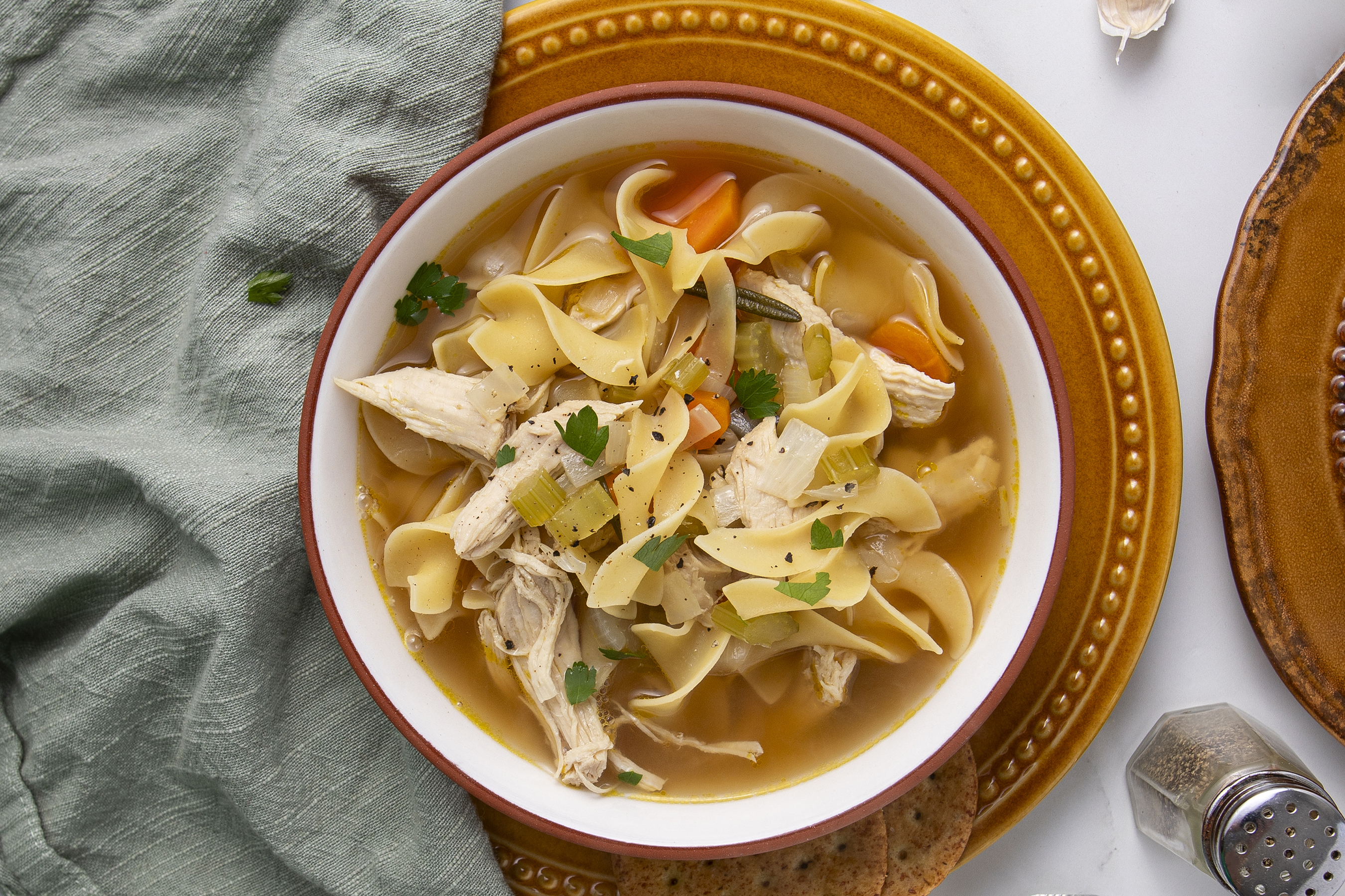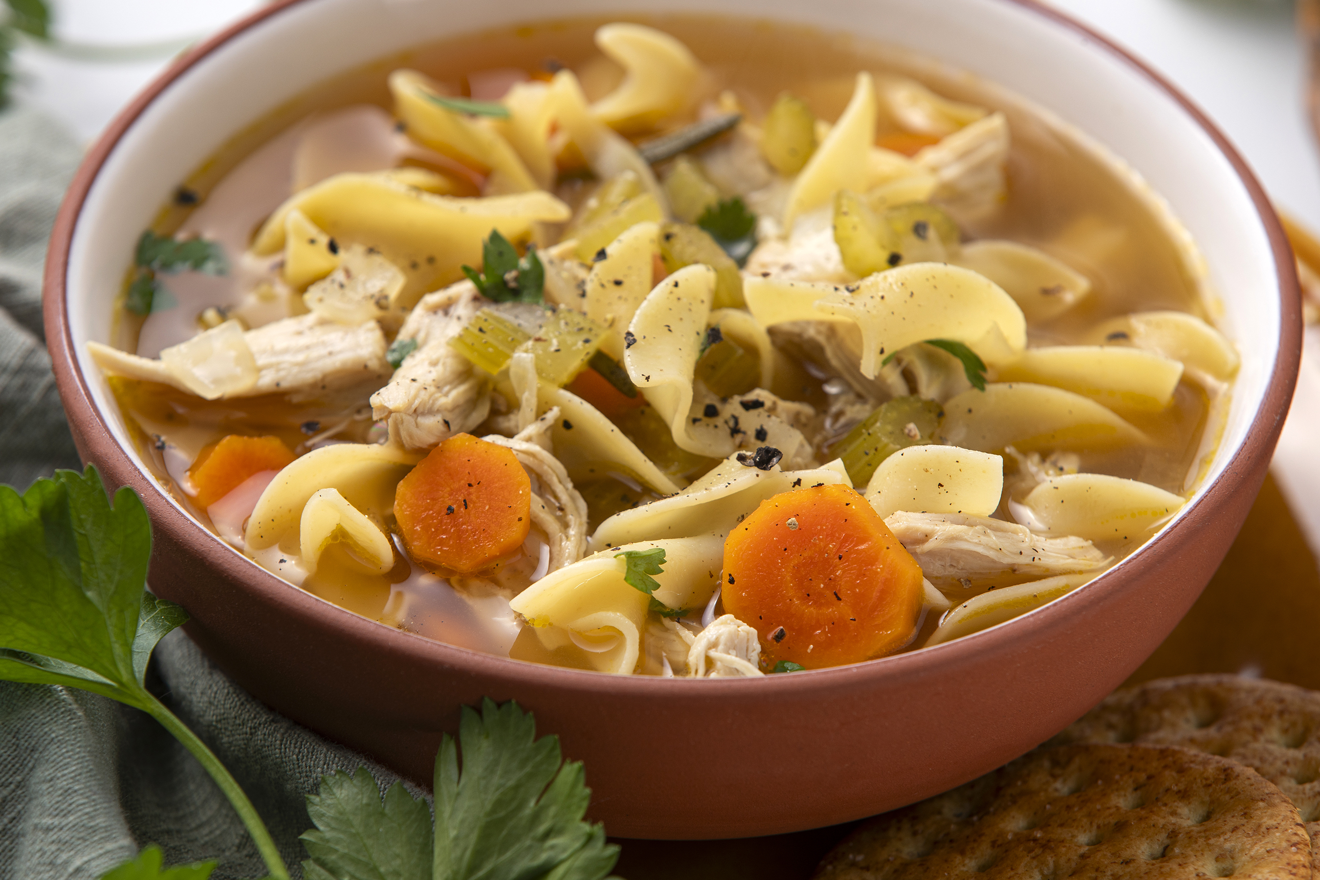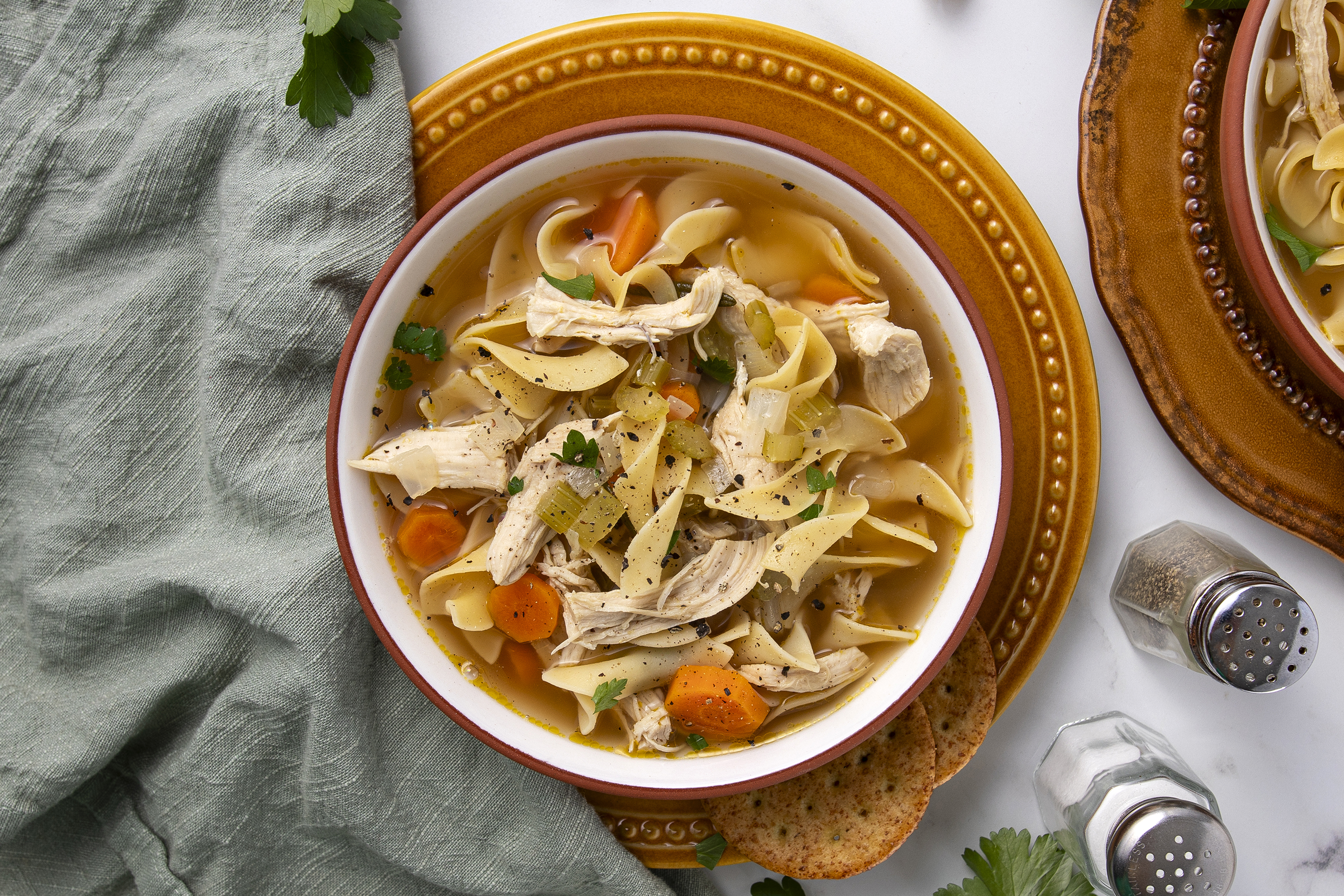 Ellen's Chicken Noodle Soup is a classic soup for when you're feeling down, feeling blue, or just feeling the need for a little comfort. Ellen knows that sometimes, you just want the basics at their best; tender veggies, savory chicken, aromatic broth, and buttery egg noodles to be more specific. They're all here and ready in half an hour or less! Take a few sips of Ellen's Chicken Noodle Soup and let this dish soothe you when you need it most!