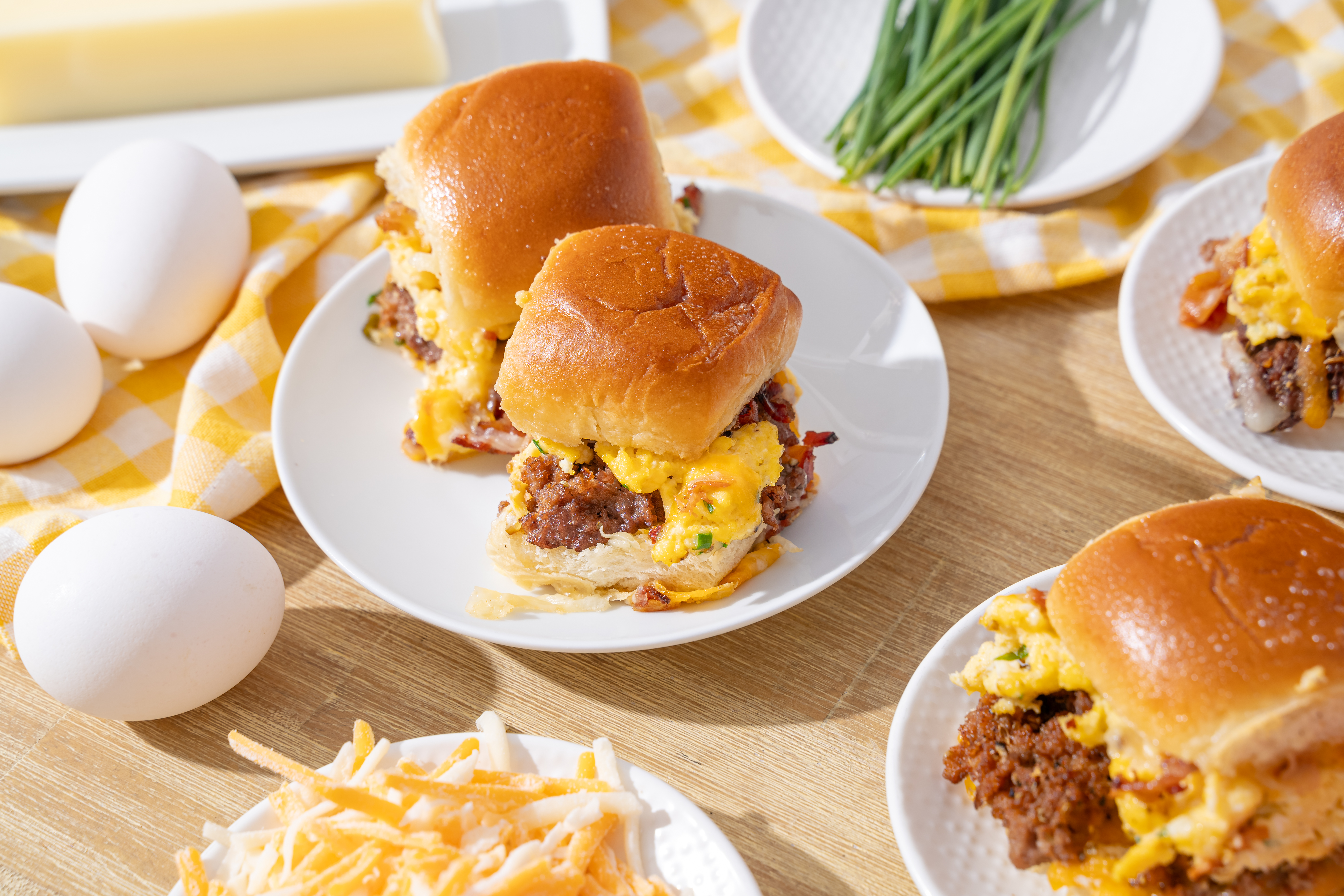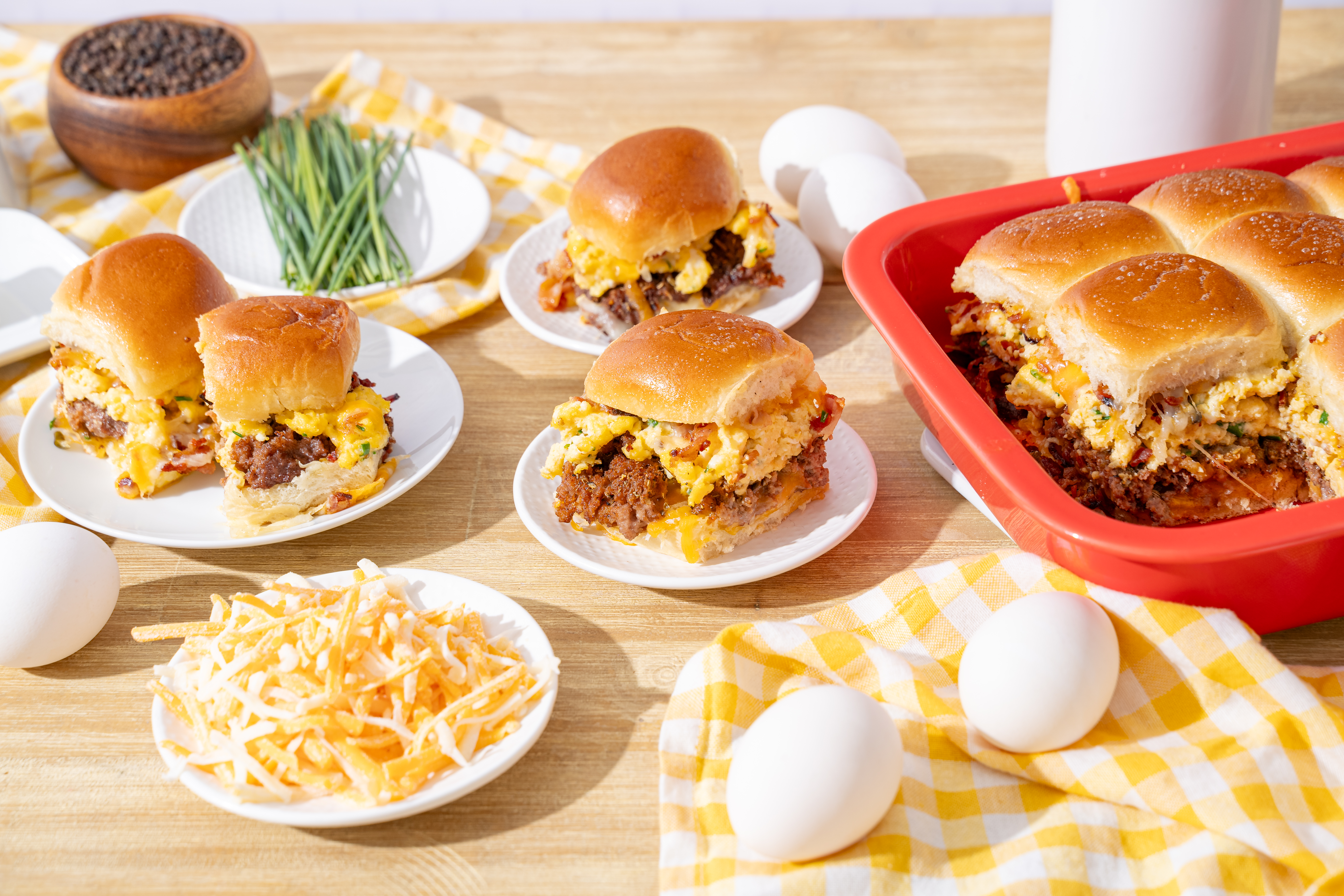 You've had breakfast sandwiches before but not like this. Trust us, you'd remember if you'd had a breakfast sandwich this good before. Farmer's Breakfast Sliders are loaded with both crispy bacon and succulent sausage, fluffy scrambled eggs, and lots of melty cheese. Extra pillowy Hawaiian rolls with a coating of rich and sweet maple-butter sandwich all the savory filling together! Farmer's Breakfast Sliders are the kind of breakfast you want when gearing up for a busy day — they're the most delicious protein boost around!