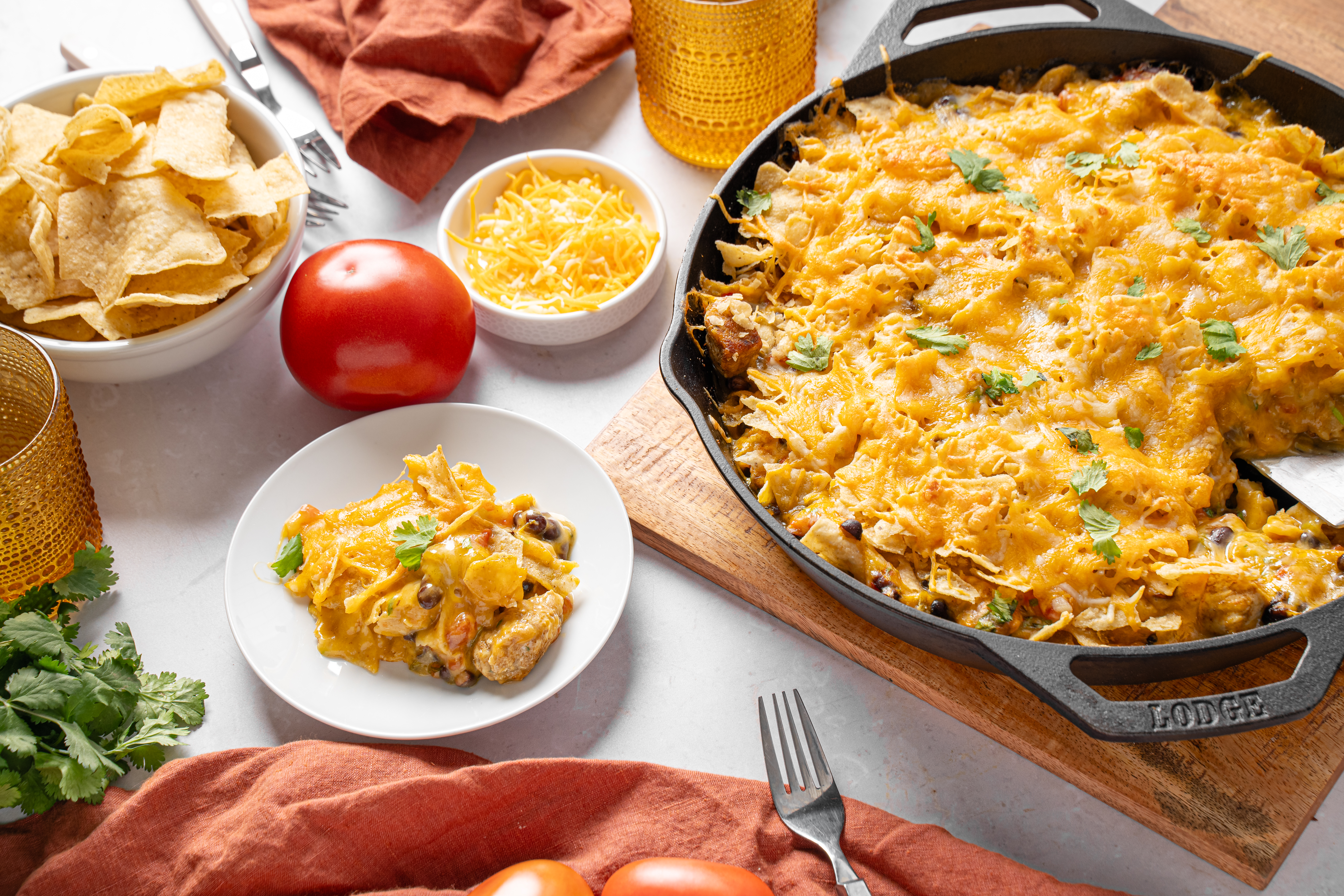 Step 9 -Spread 1/3 of the crushed chips into the prepared cast-iron and top with 1/2 of the chicken mixture. Repeat the layers once, using 1/2 of the remaining crushed chips and the remaining chicken mixture.