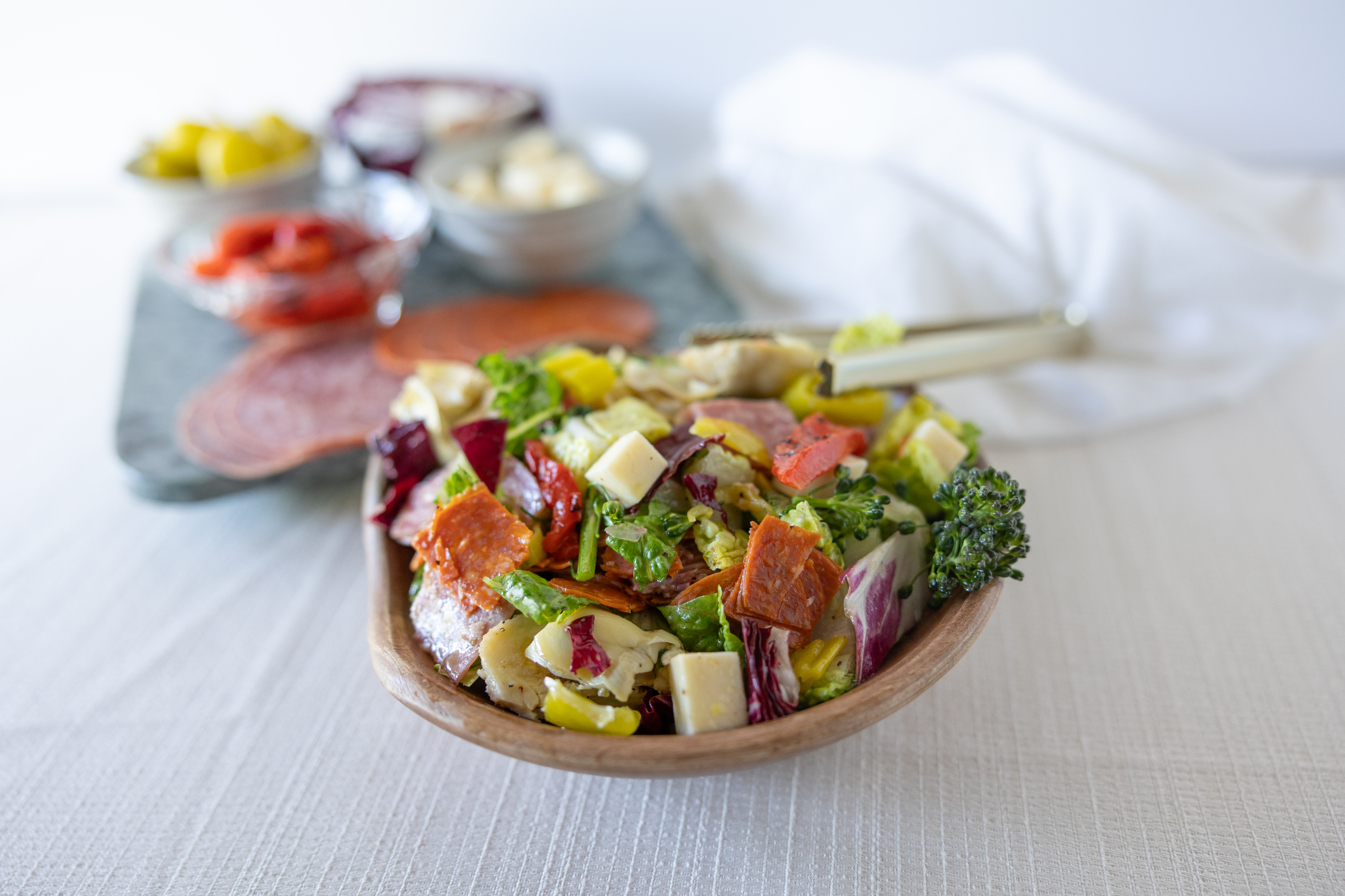 The best part of this Fresh Italian Chopped Salad is that there is no such thing as a bland or boring bite! By chopping and tossing all the ingredeints together, all of the flavors of the salad come together in unique and delicious ways! The tangy artichoke can truly mingle with the spicy pepperoncini, succulent salami and pepperoni, and the creamy, cheesy bocconcini and provolone. Dressed in a vibrant vinaigrette, Fresh Italian Chopped Salad really does have the cool, refreshing flavor that makes summer fun, and then some!