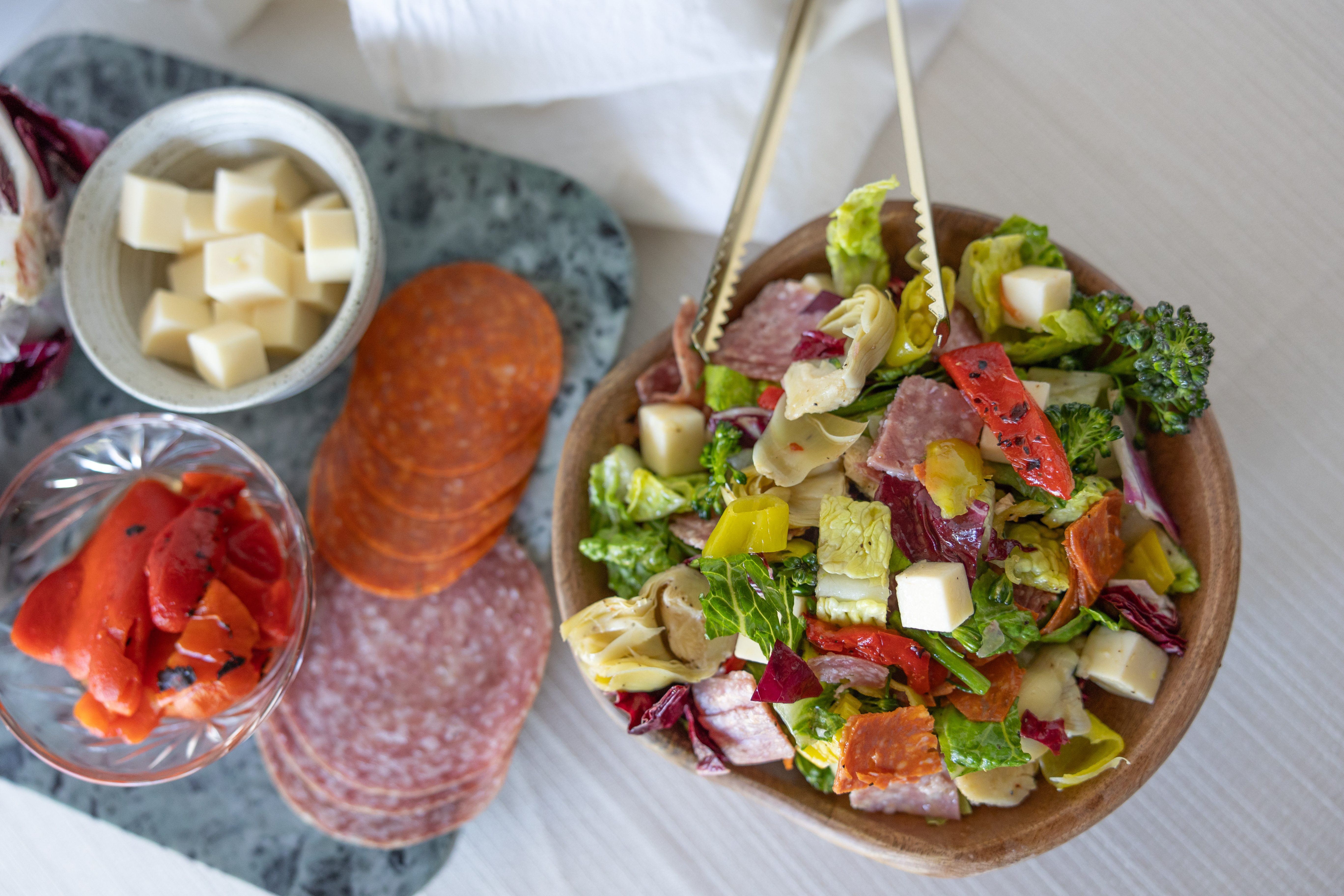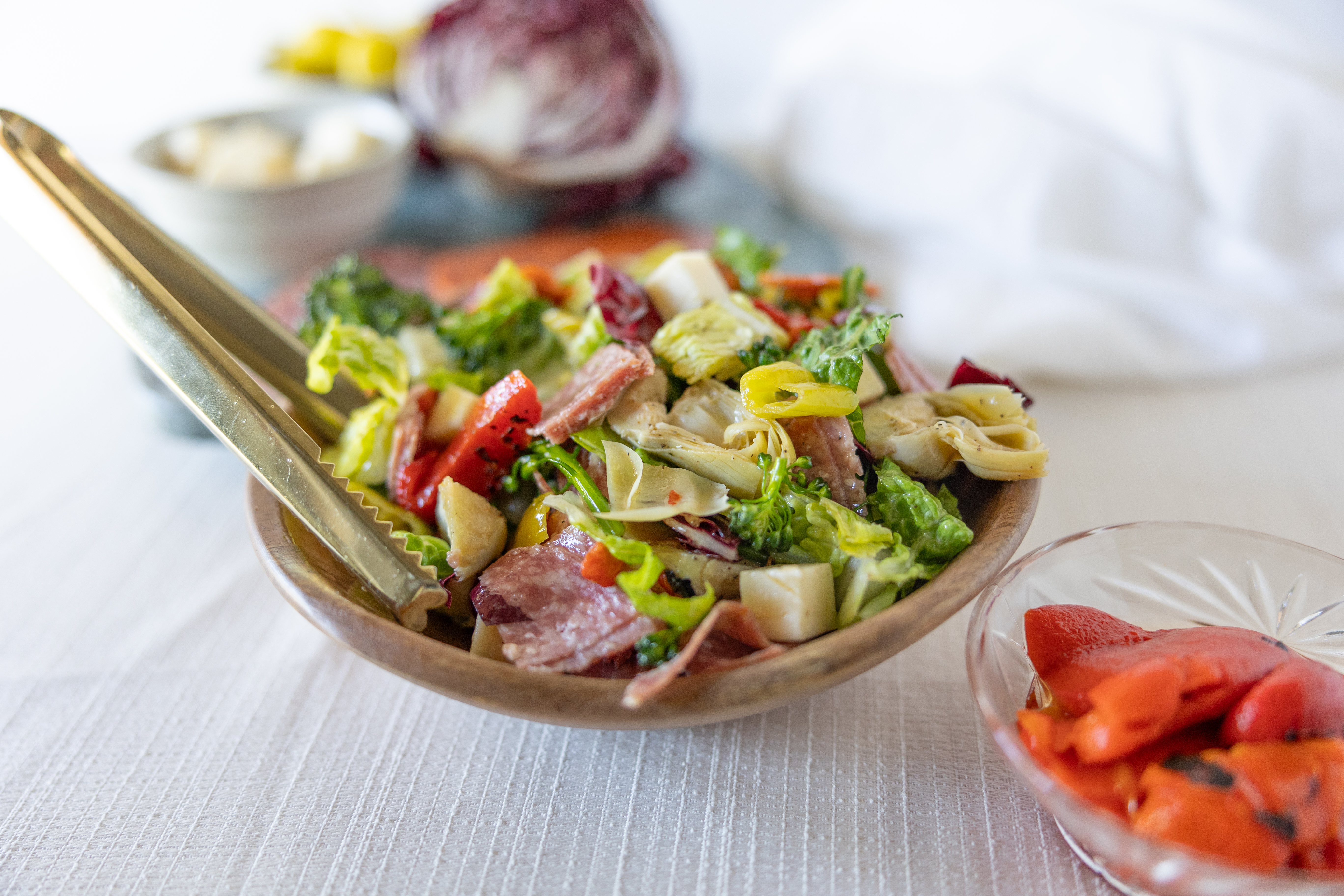 Step 1 -In a bowl, add the romaine, the radicchio, the pepperoncini, the roasted red peppers, the mozzarella, the artichokes, the provolone, the salami, the pepperoni, 1 teaspoon of the salt, and the black pepper and toss lightly to combine.