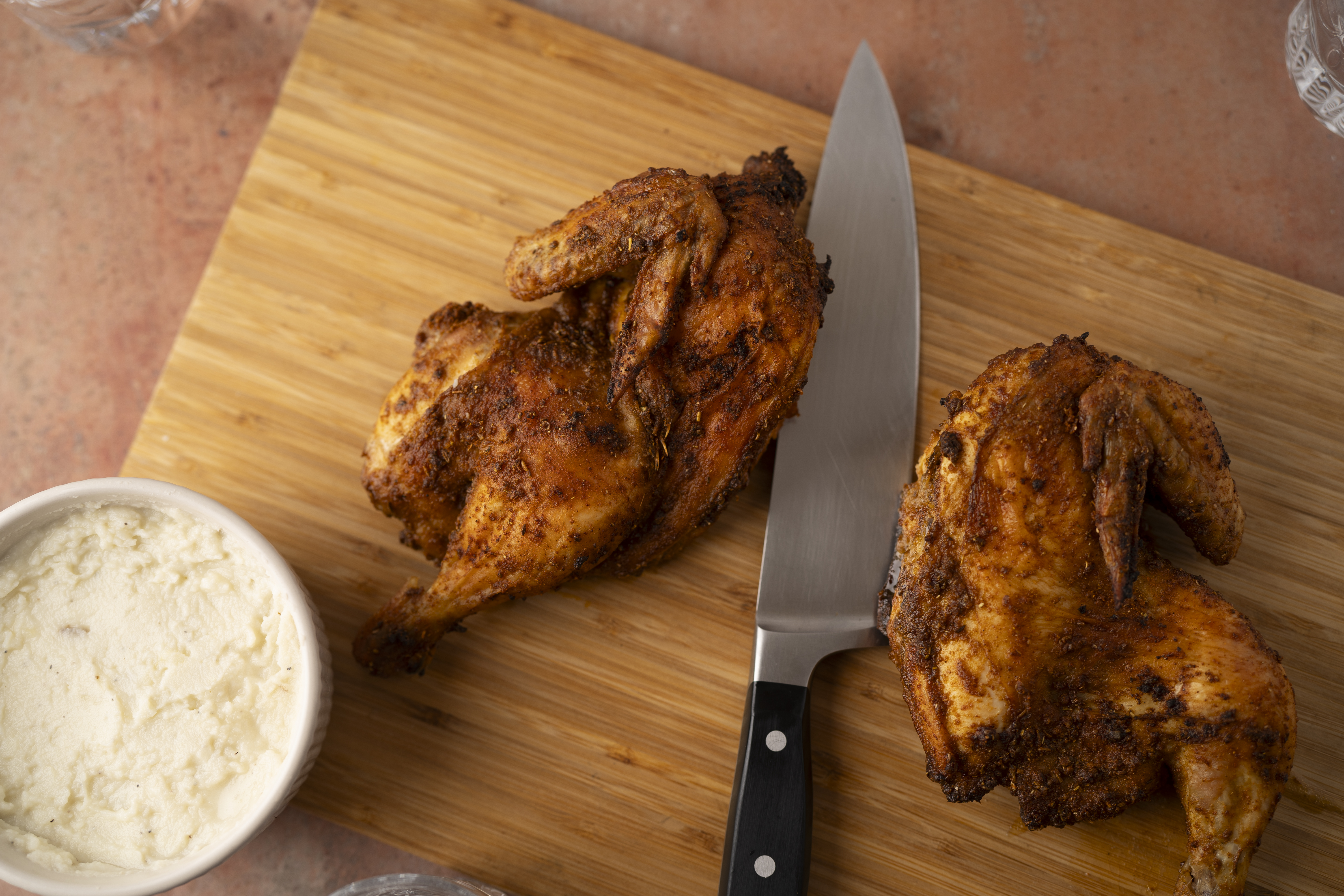 • 1 (4-pound) broiler-fryer chicken, cut in half lengthwise