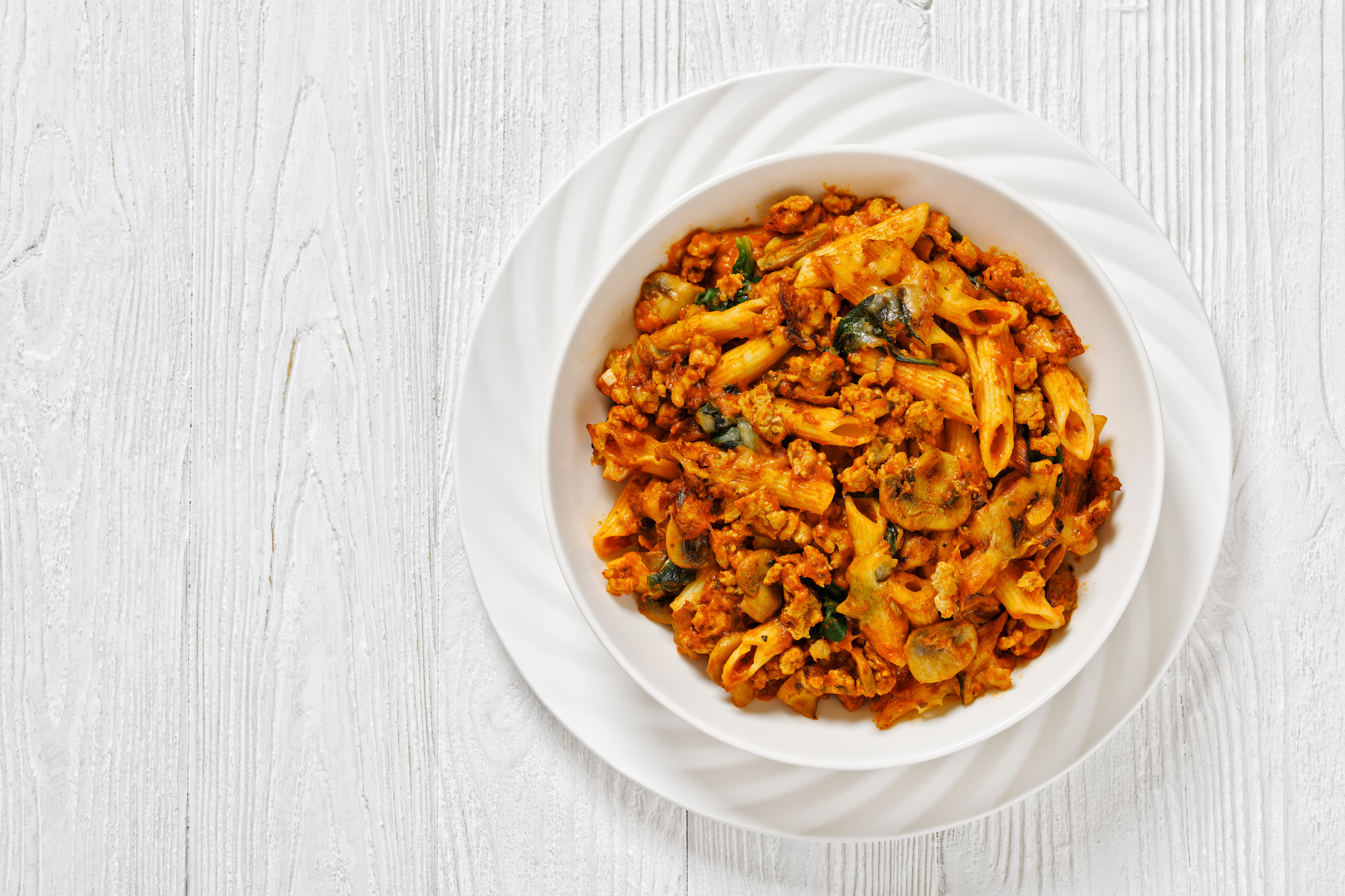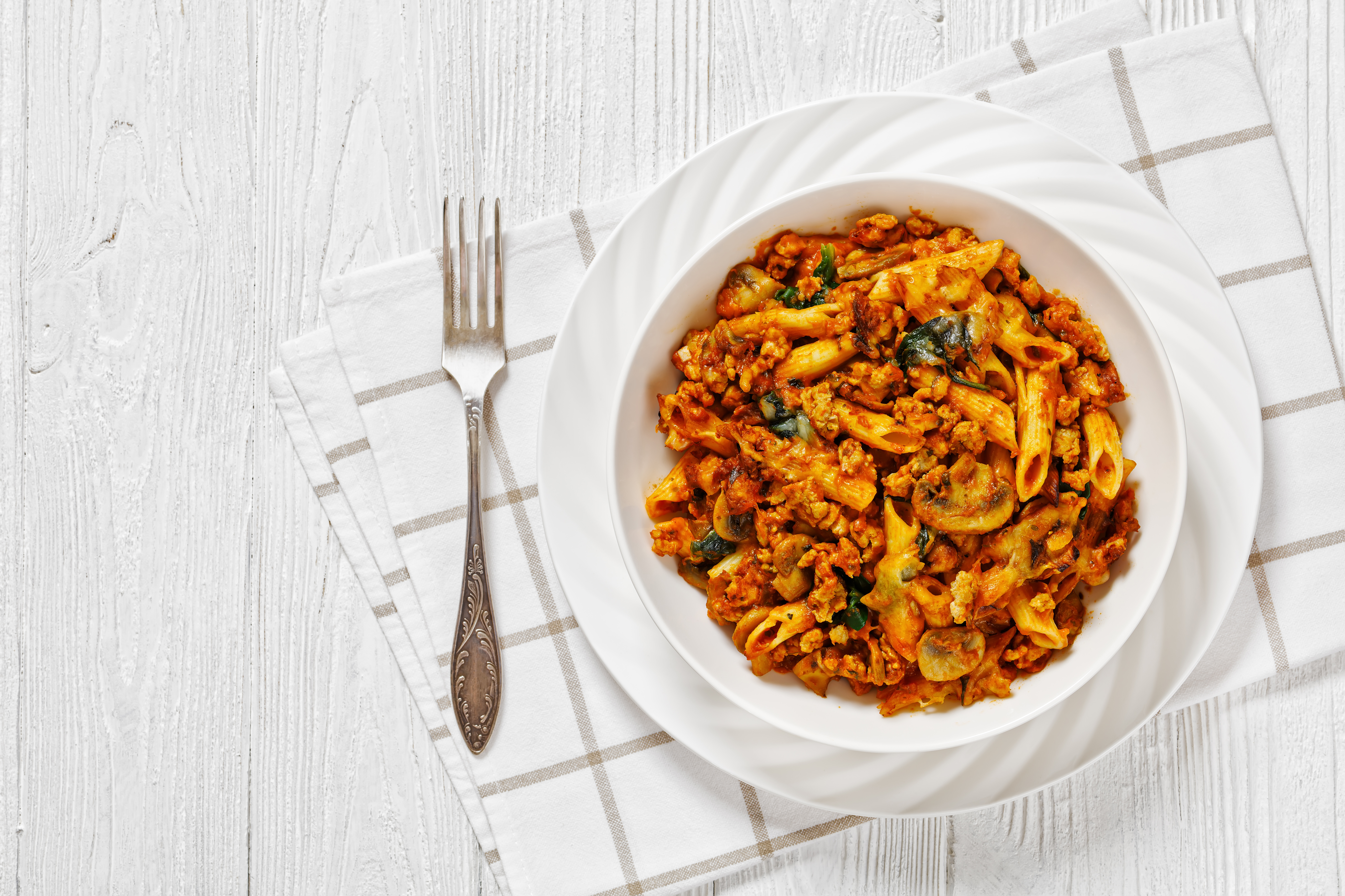 It's called the Gobbler Bake for two reasons. Firstly, it features juicy ground turkey. Secondly, it makes you want to gobble it up! Tender pasta, beefy mushrooms, rich tomato sauce, and melty cheese help to highlight and uplift the turkey, so you'll be ready to scoop even more onto your plate! Gobbler Bake is a gobbling great time!