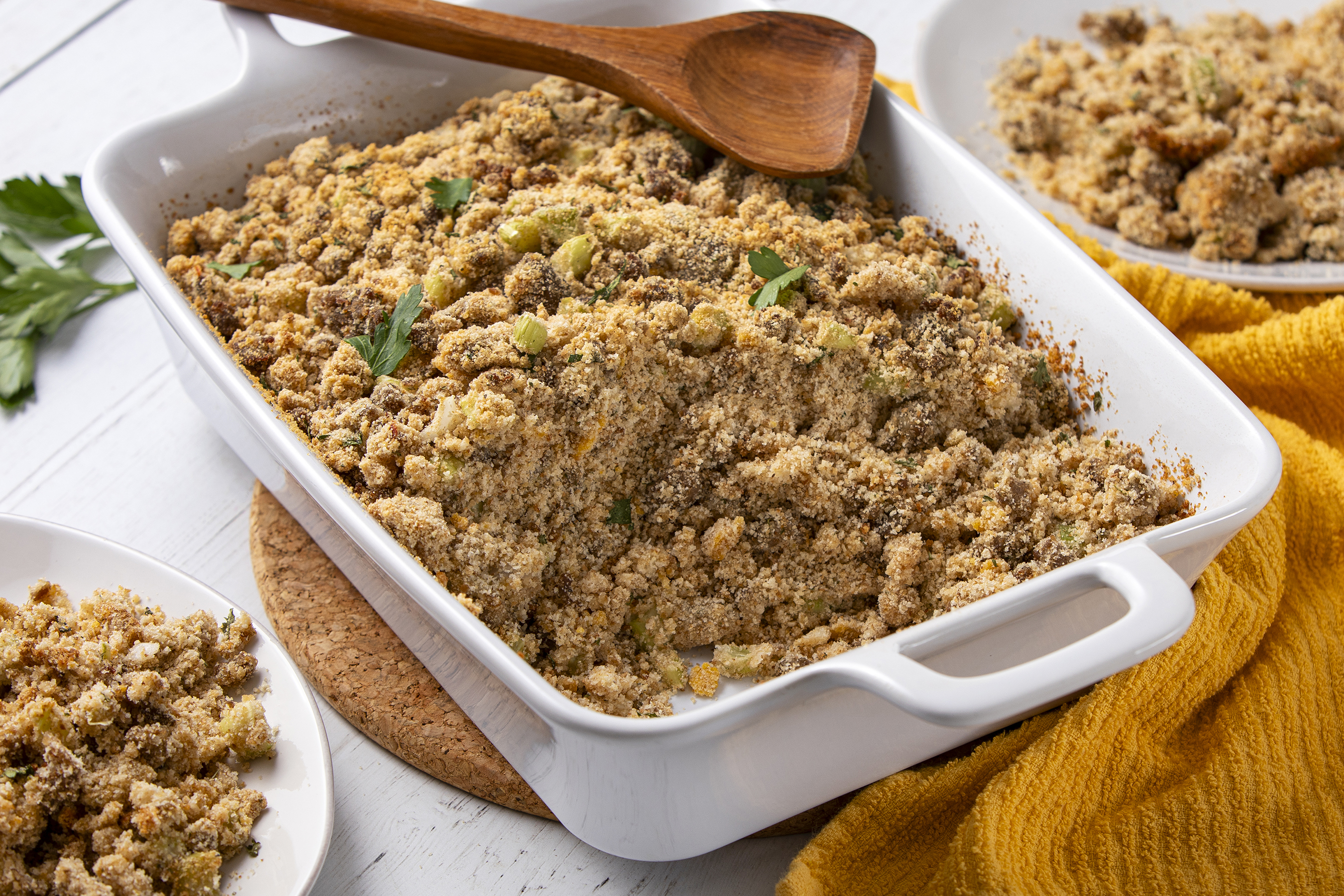 Step 6 -In a large bowl, combine the cooked sausage, the heated milk, the breadcrumbs, the celery, the eggs, 2 tablespoons of the parsley, the onion, and the salt.