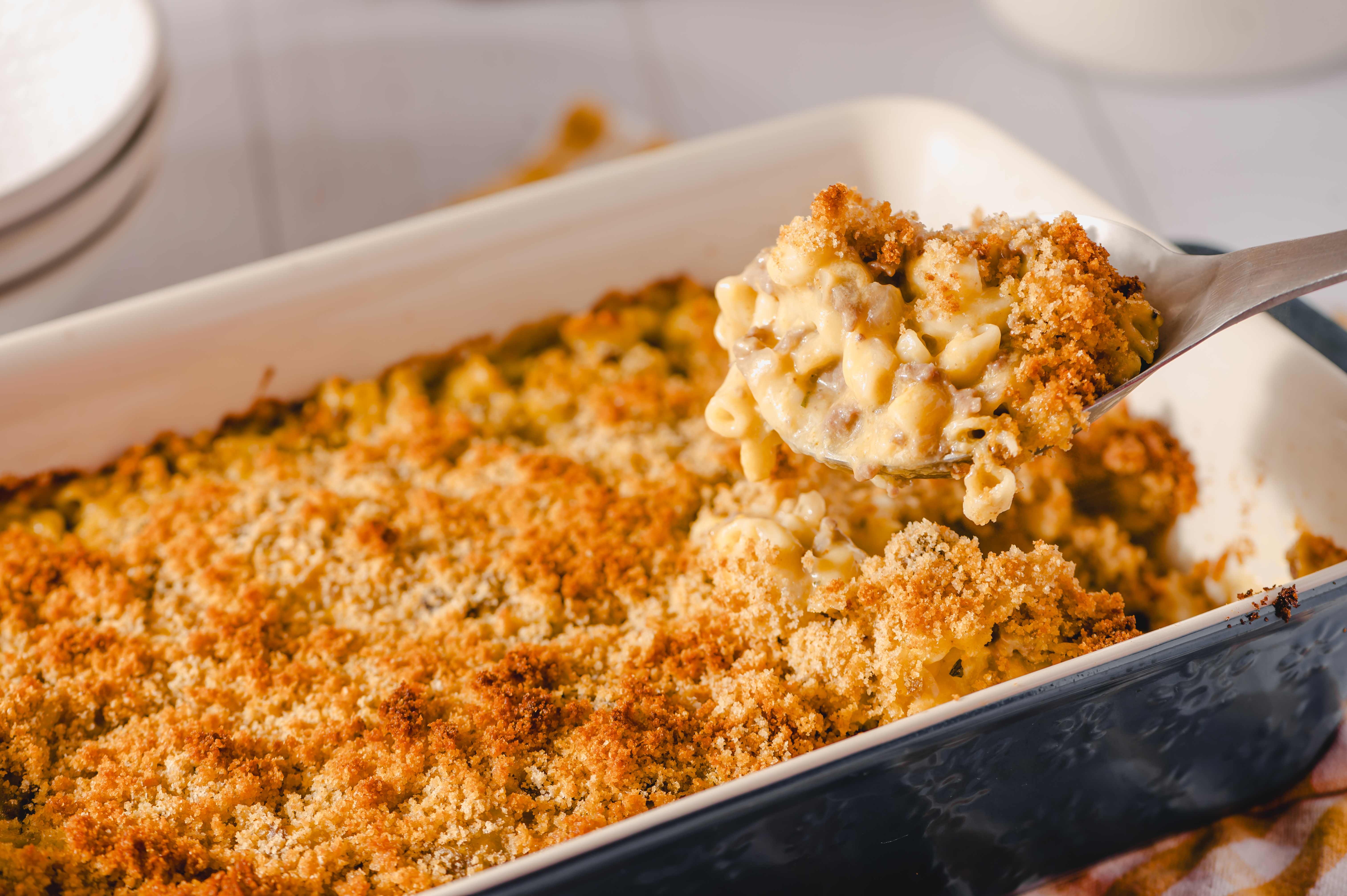 Step 7 -In a medium bowl, add the breadcrumbs and the melted butter and stir to combine. Evenly sprinkle it over the macaroni mixture.