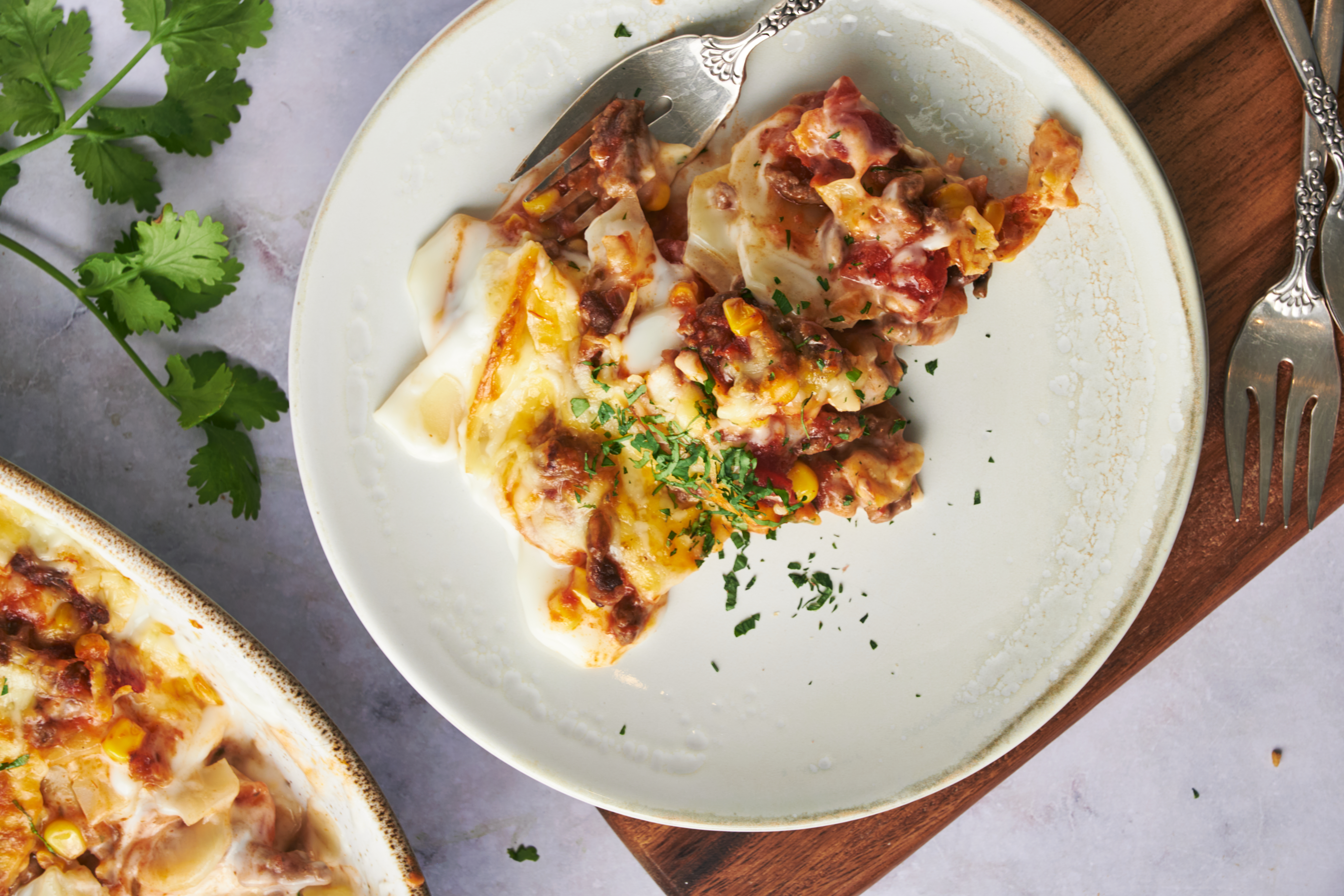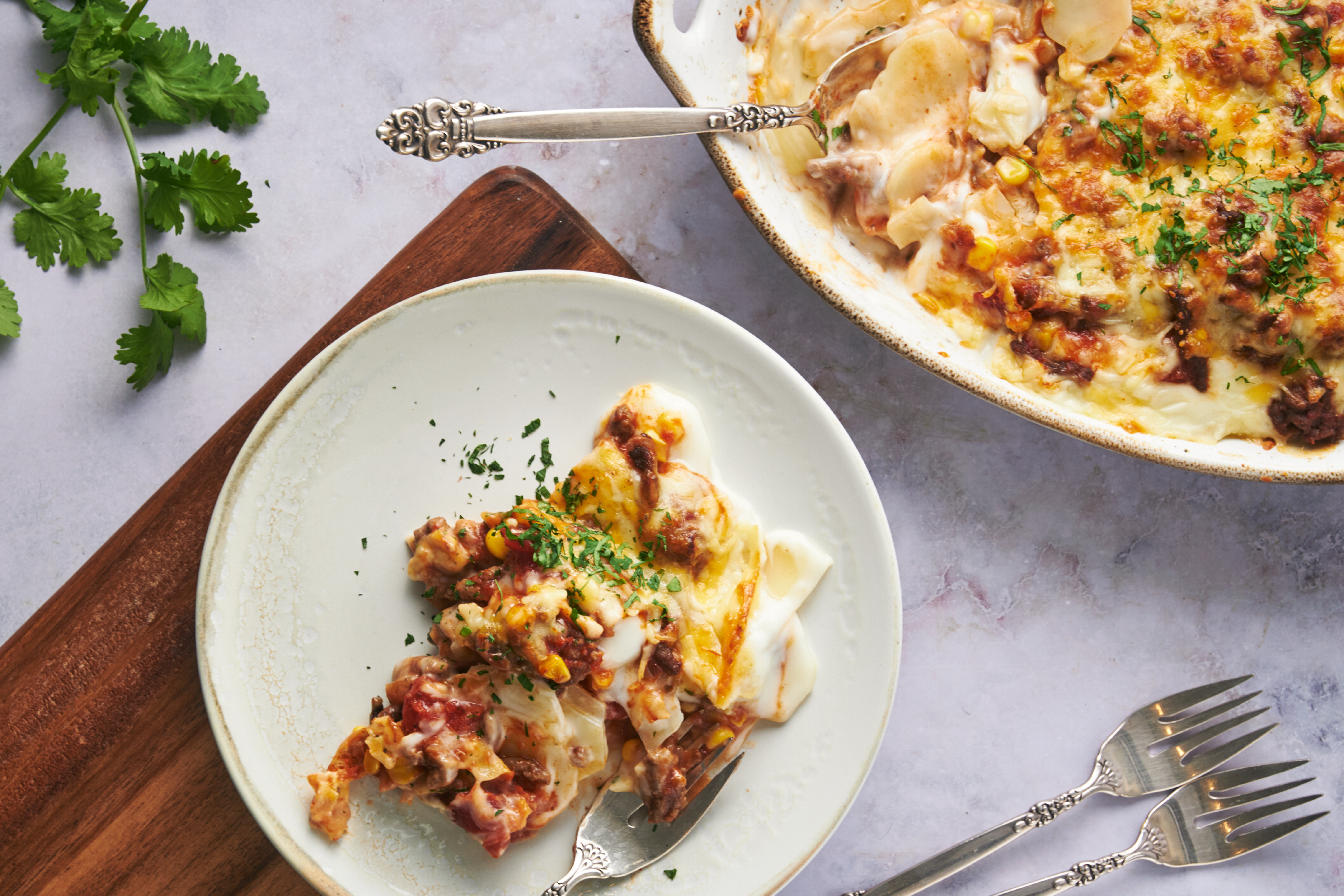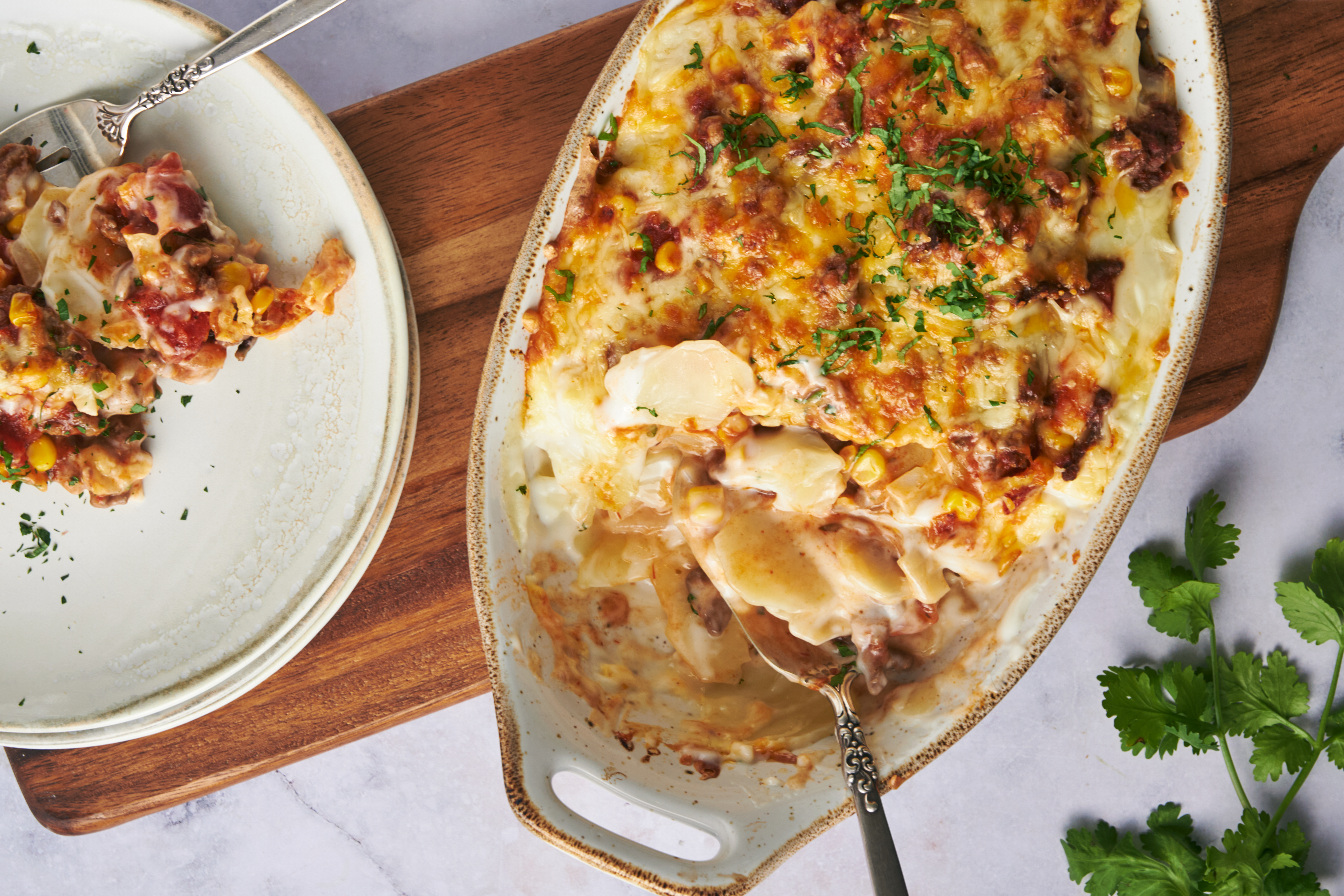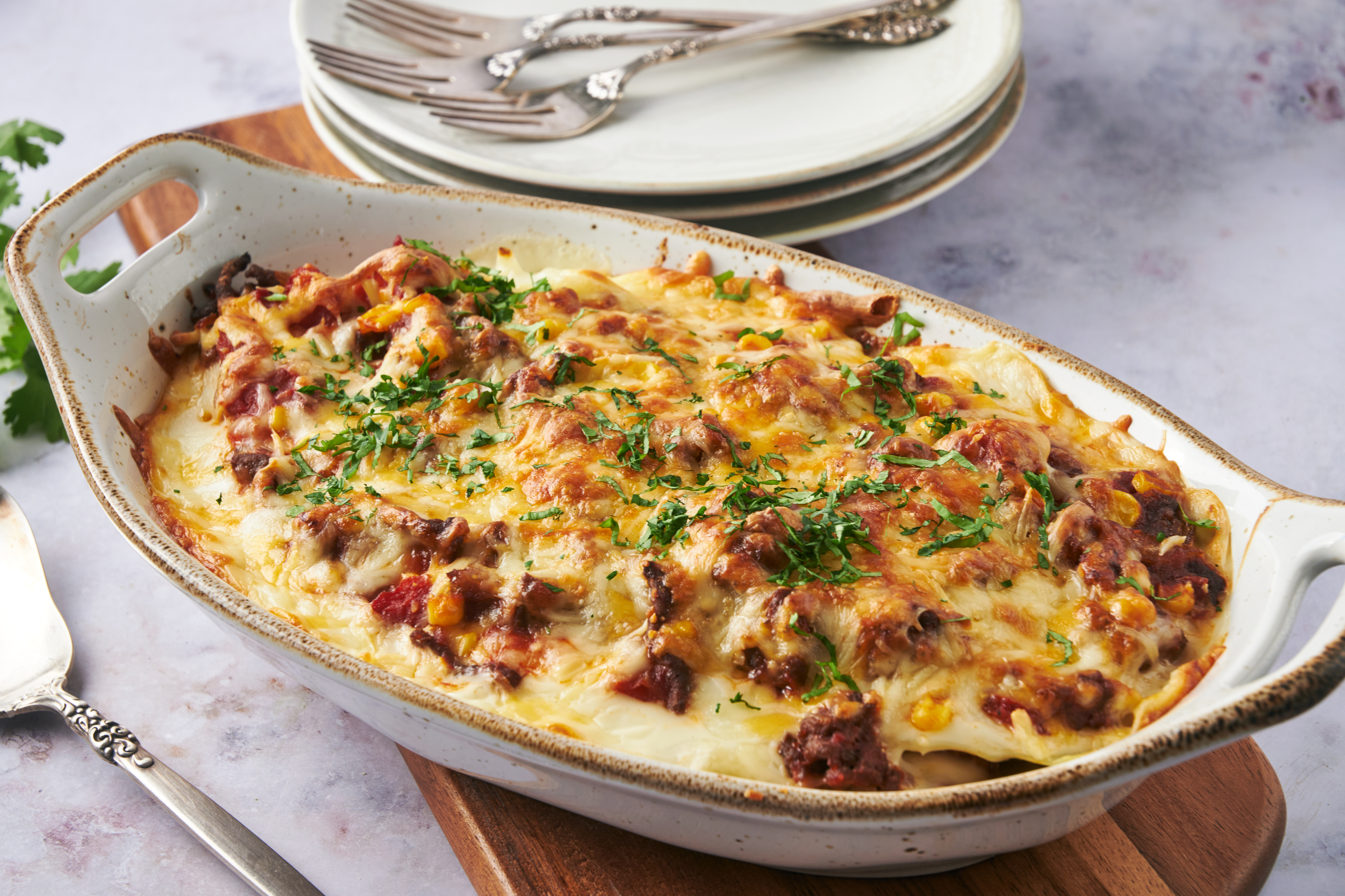 This is a casserole that will be remembered for a long time to come! The Hall-of-Fame Bake piles on tons of delicious, savory, and zesty taco meat invigorated with vibrant salsa! Better yet, it sandwiches all that tasty beef with tender potatoes in a rich and creamy Alfredo sauce and melty cheese. It's got layers of goodness from two beloved cuisines all packed into a single casserole dish! Place the Hall-of-Fame Bake in your most revered cookbooks!