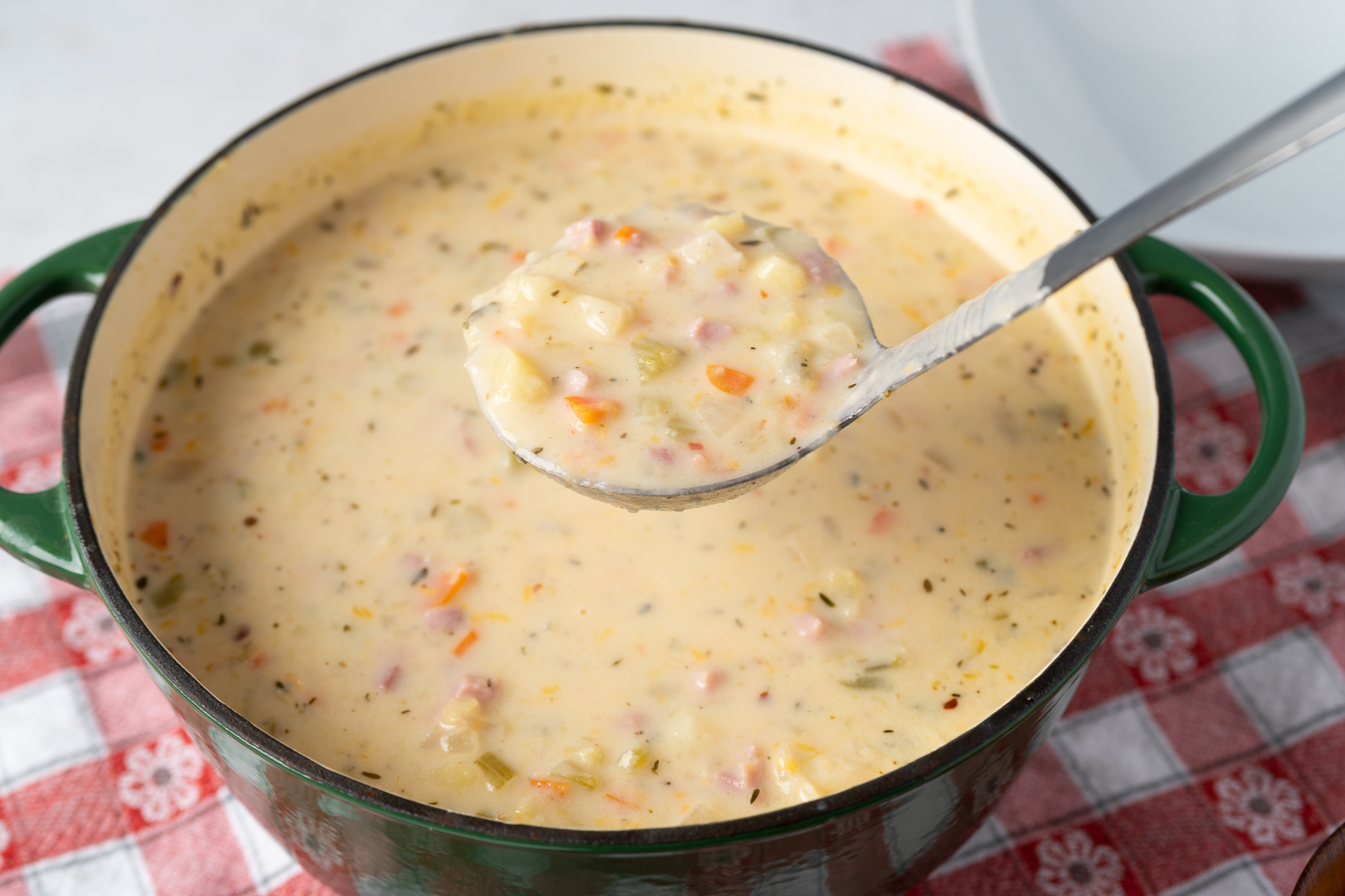 There isn't a soup out there that's as immediately comforting or as recognizably homemade with love as this Ham & Potato Soup. The broth is creamy and savory, with a little extra body thanks to the mashed potatoes mixed right in! Succulent ham, fresh vegetables, and even more potatoes take a leisurely swim in the poultry-infused comfort of the soup, tempting you to indulge in sip after sip and bite after bite! You'll know this soup will make you warm and happy as soon as you hear the name Ham & Potato Soup!