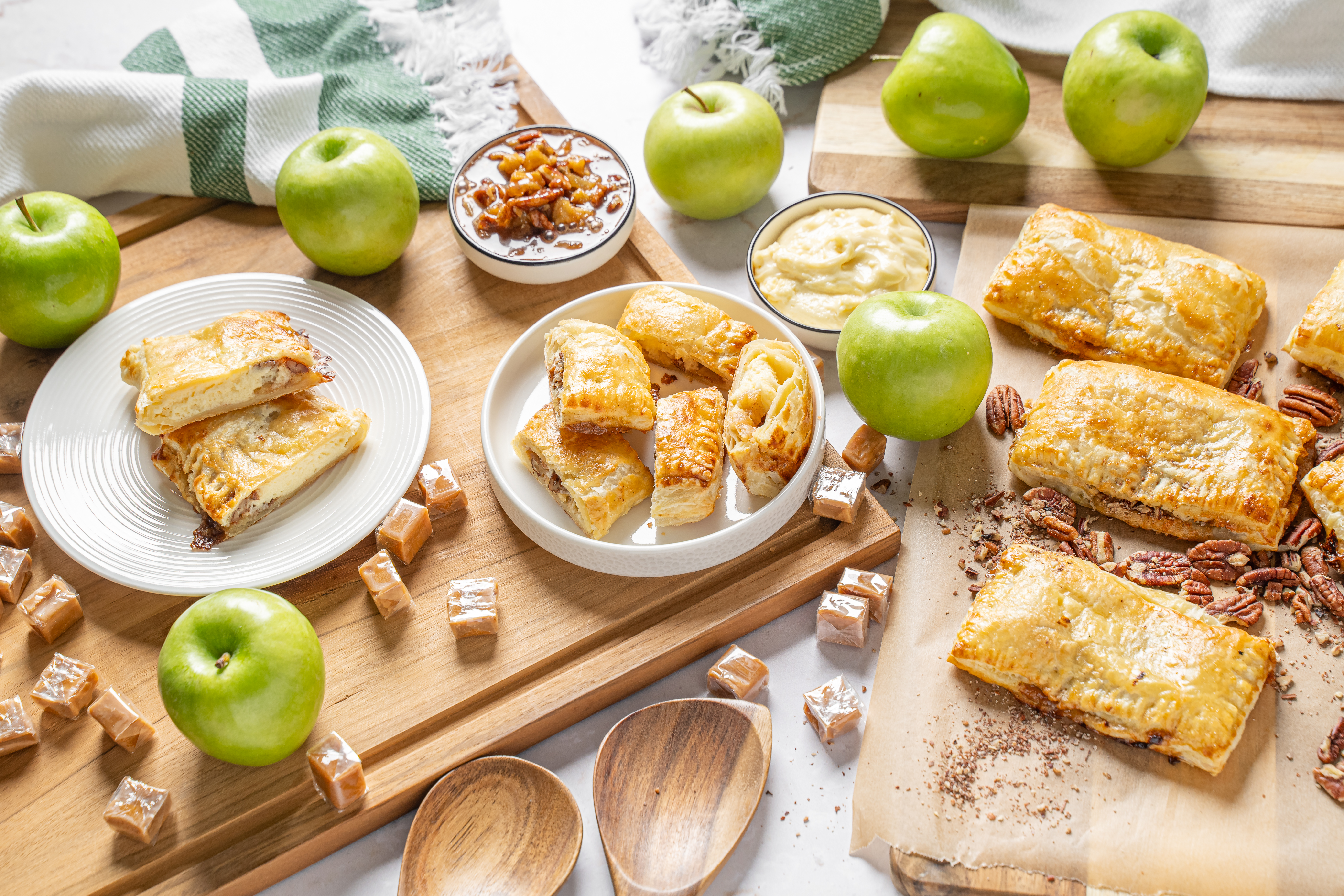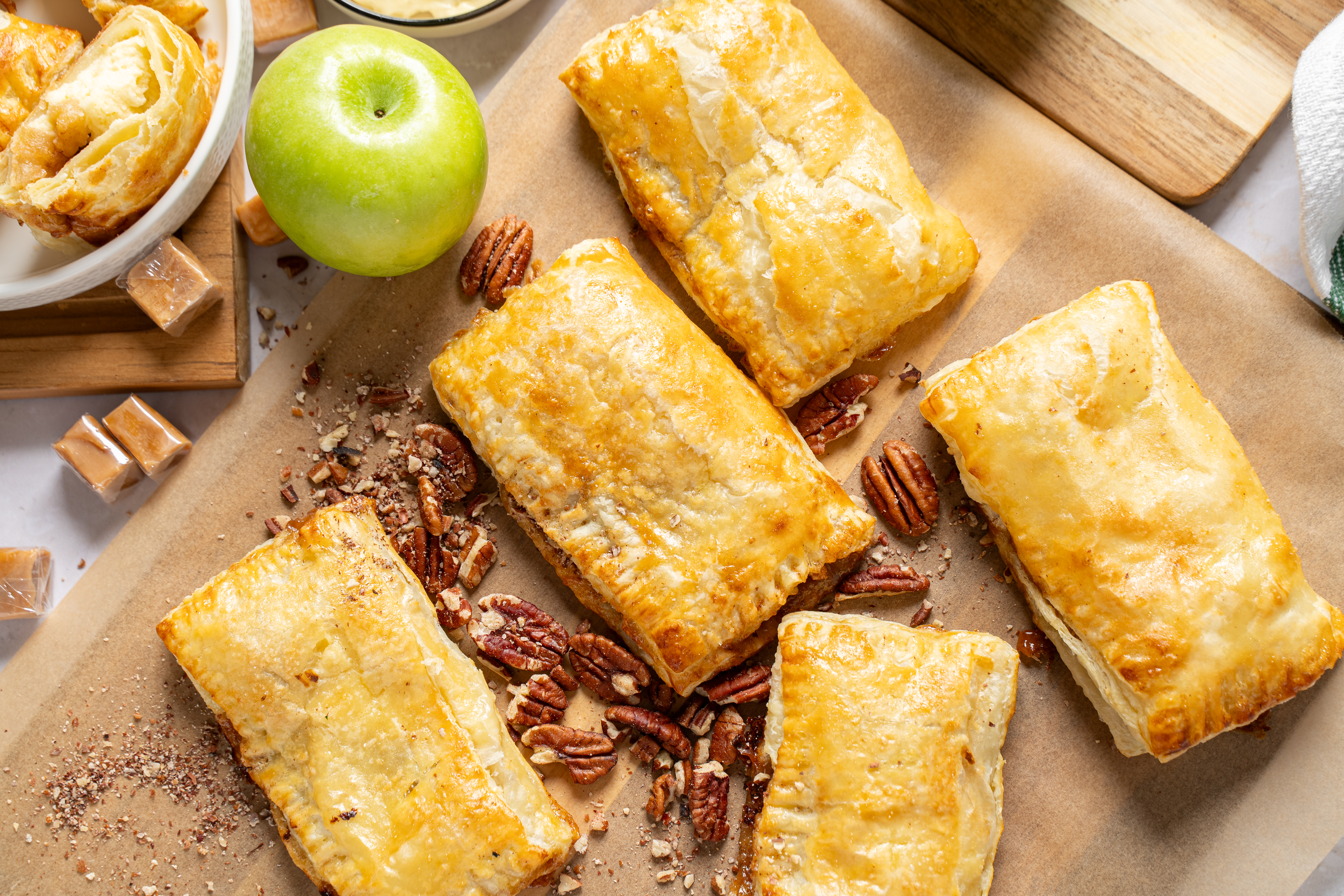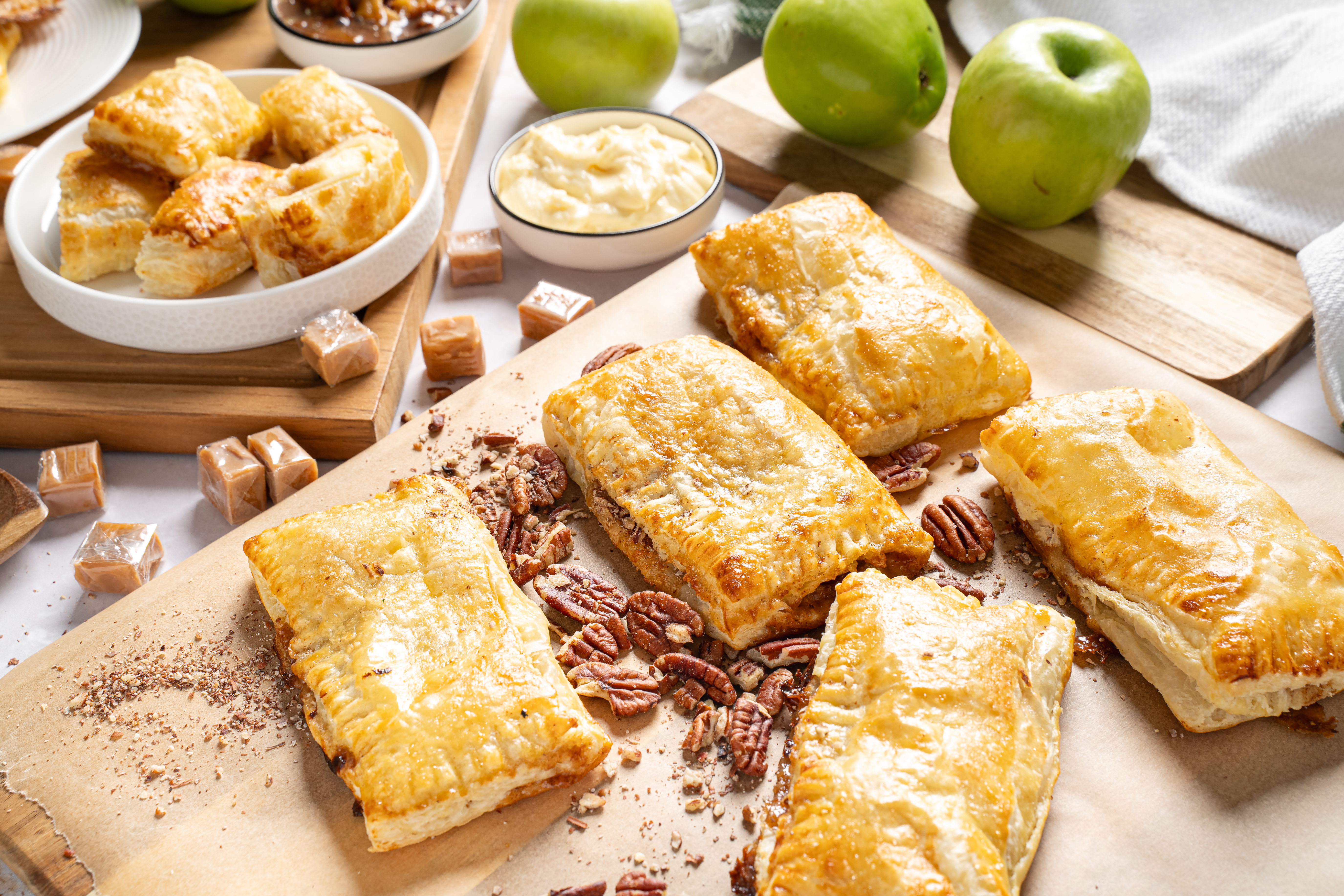 These are Harvest Favorite Turnovers and, by coincidence, happen to our favorite turnovers as well! Within each golden-brown and buttery puff pastry is a flood of jammy, cinnamon-infused apples, crunchy pecans, and a luscious cream cheese filling. It's perfect for enjoying the fall evenings or as a snack for apple-picking! Autumn has never tasted better than with Harvest Favorite Turnovers!