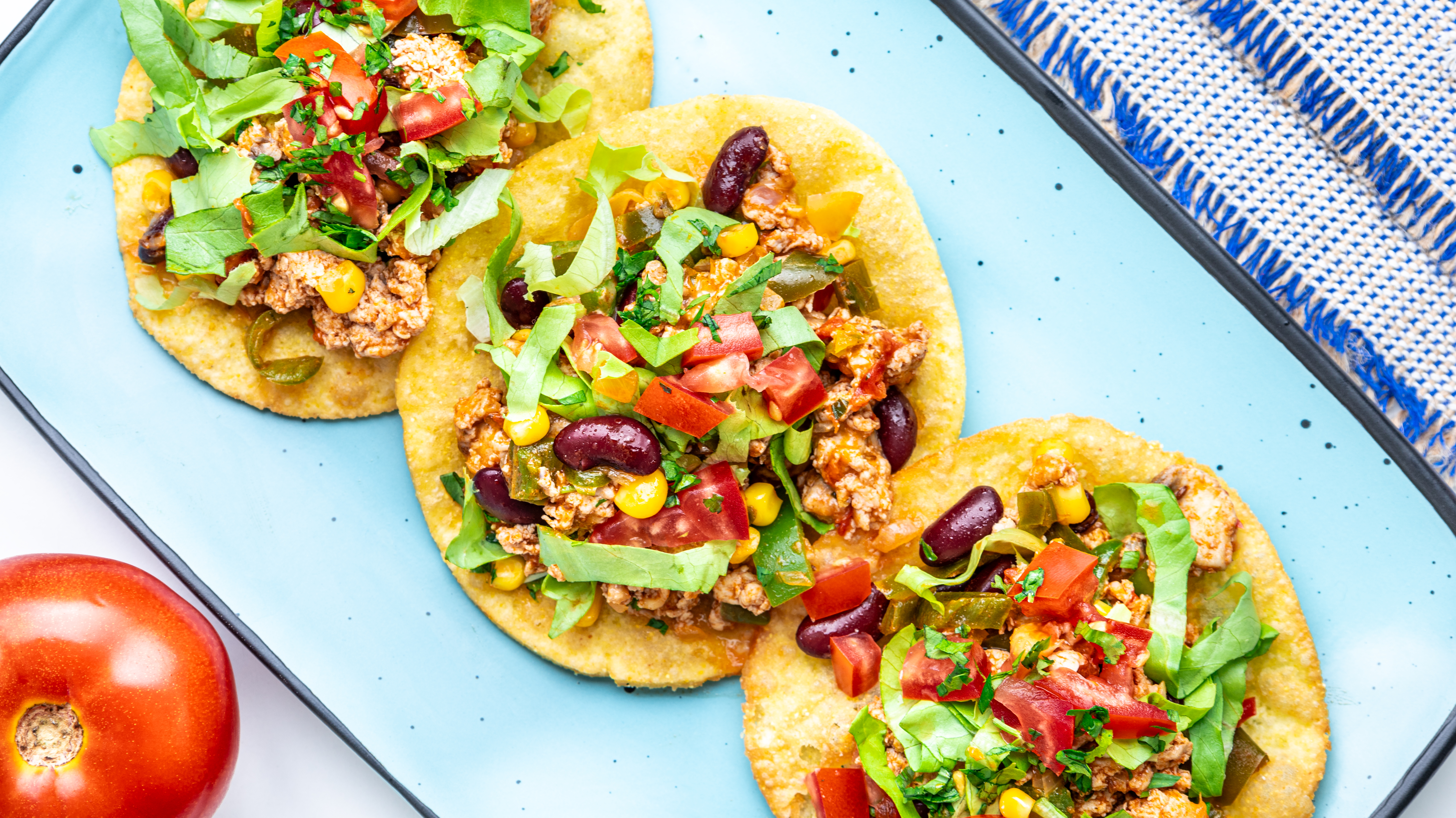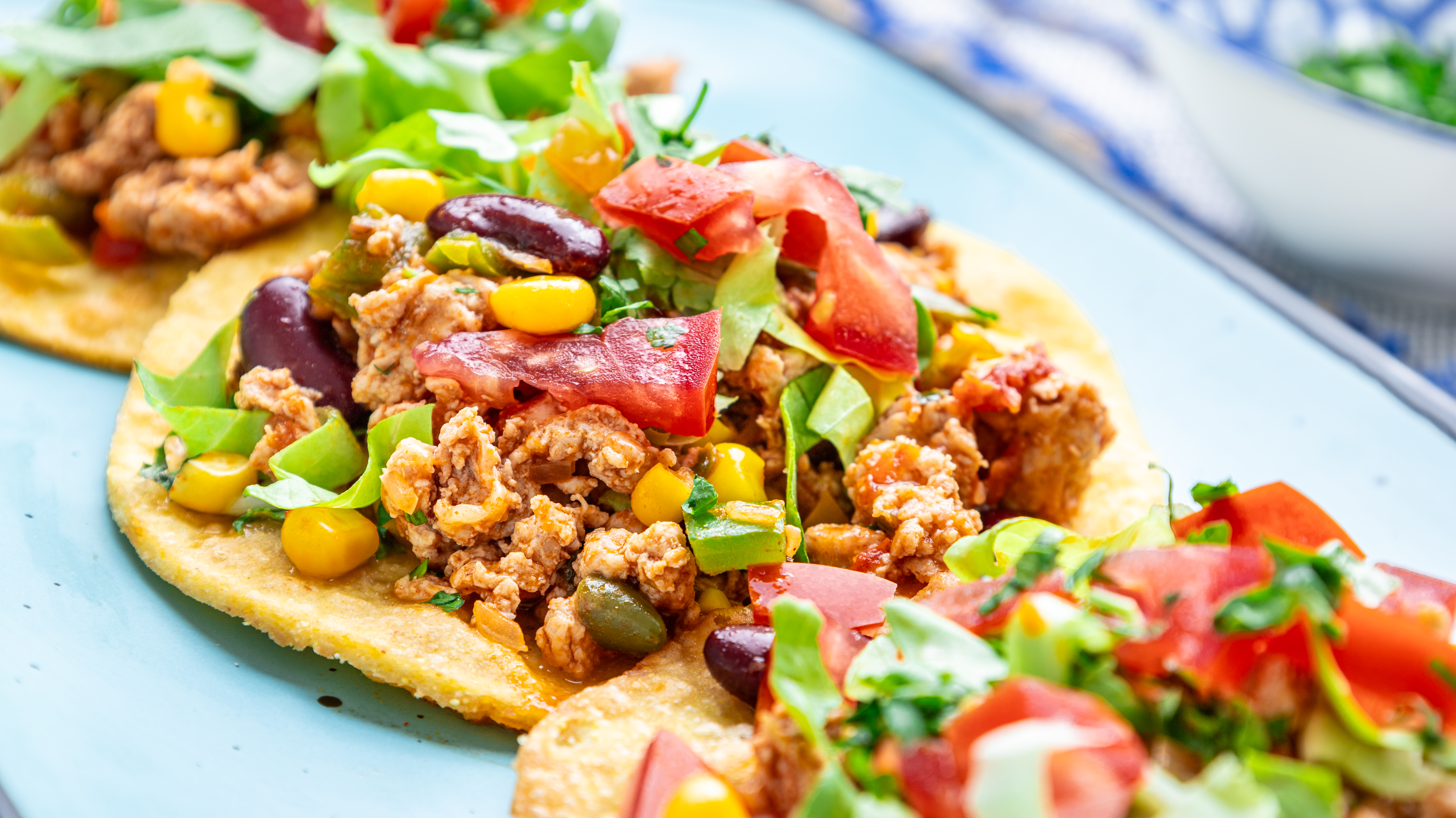 Lighten things up with this delicious twist! Healthier Mexican Tostadas are packed with lean ground turkey and all the expected yummy flavors! Yes, all the Mexican spices party with this mixture of beloved protein, fresh mushrooms, sweet corn, and kidney beans all atop crunchy tostada that's stacked with nonstop gusto! Fresh lettuce, tomatoes, and cilantro take Healthier Mexican Tostadas over the finish line to a satisfying, guilt-free meal! Let this one help lighten the load!