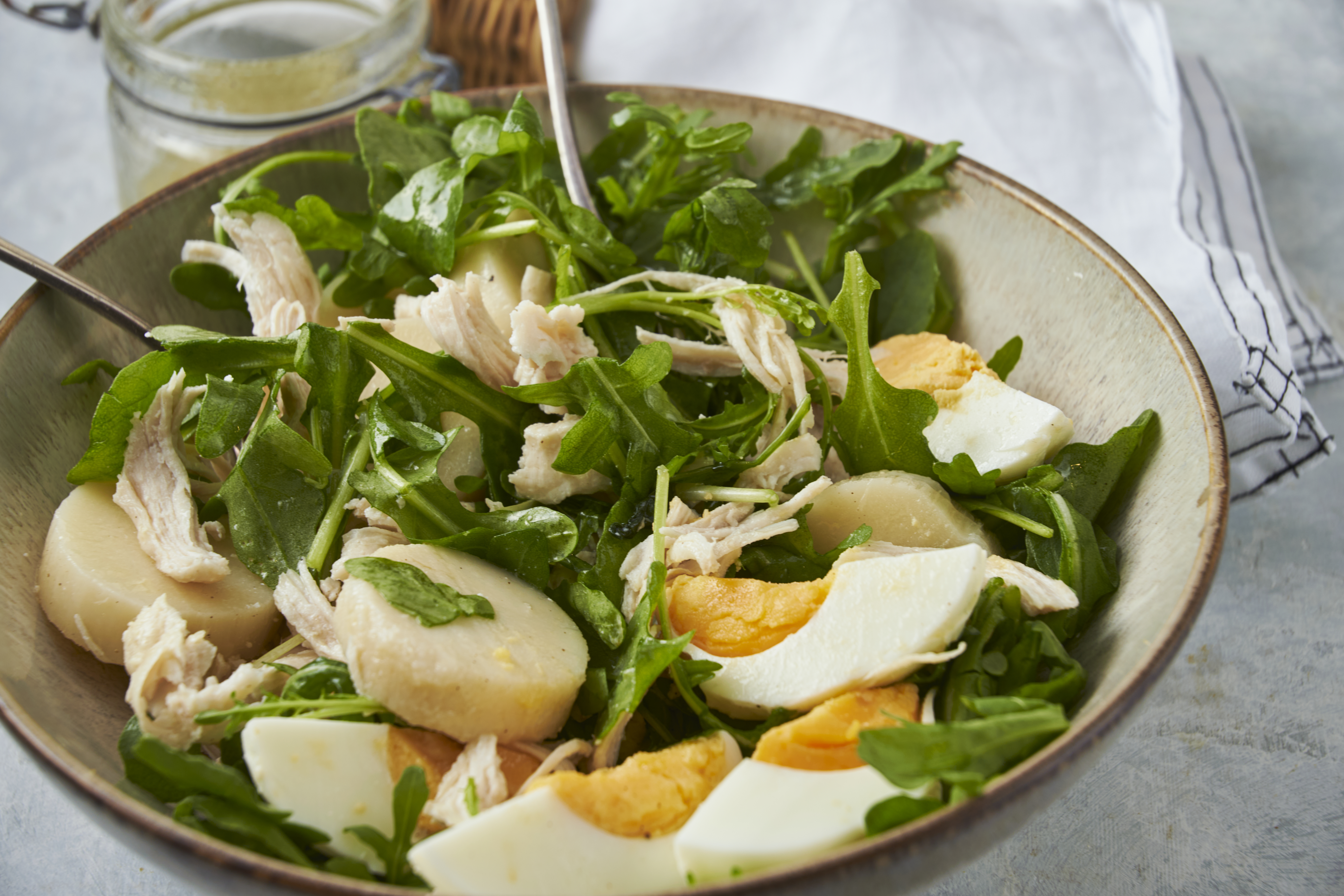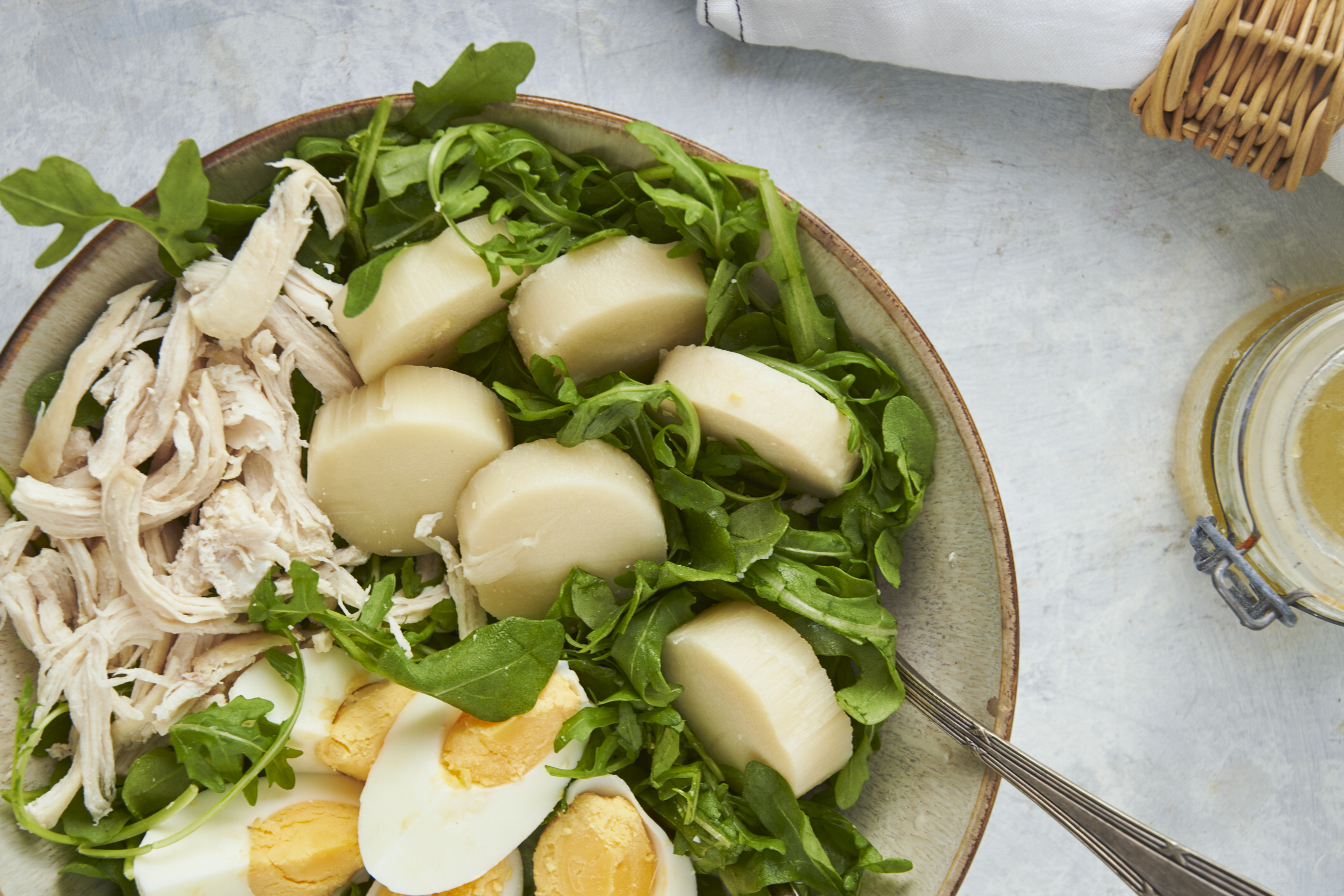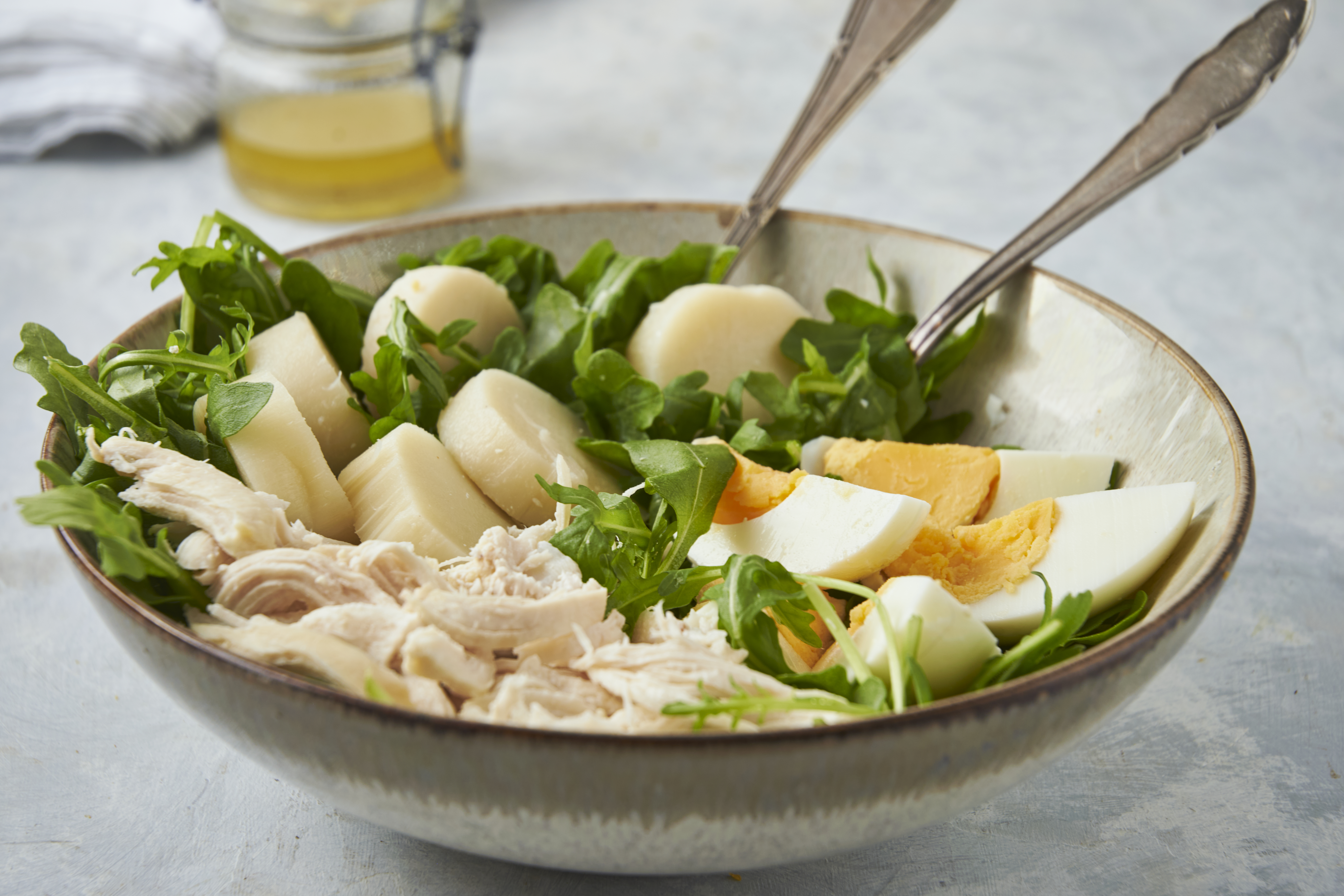 Freshness is abounding in every bite! Heart-of-Palm Salad is a wonderful addition to any meal, and we know you're going to fall in love. Fresh arugula, hard-boiled eggs, shredded chicken breast, and the unique vegetable heart of palm are piled up and drizzled with a lemon vinaigrette to all come together and give this salad a great name. Heart-of-Palm Salad will become a new love for everyone. It's certainly dear to our hearts!