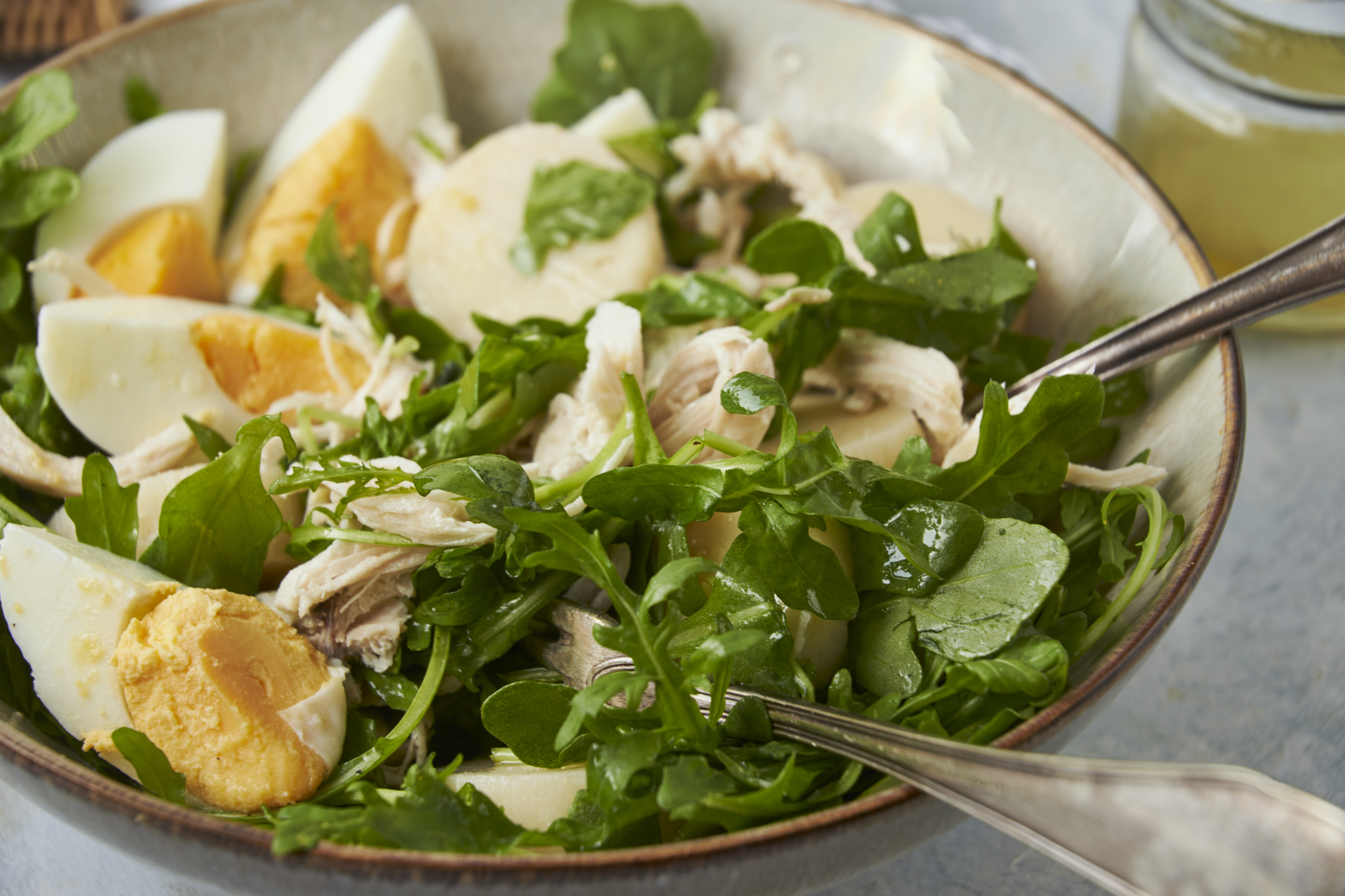 Step 1 -In a large serving bowl, arrange the arugula, the hard-boiled eggs, the shredded chicken breast, and the heart of palm.