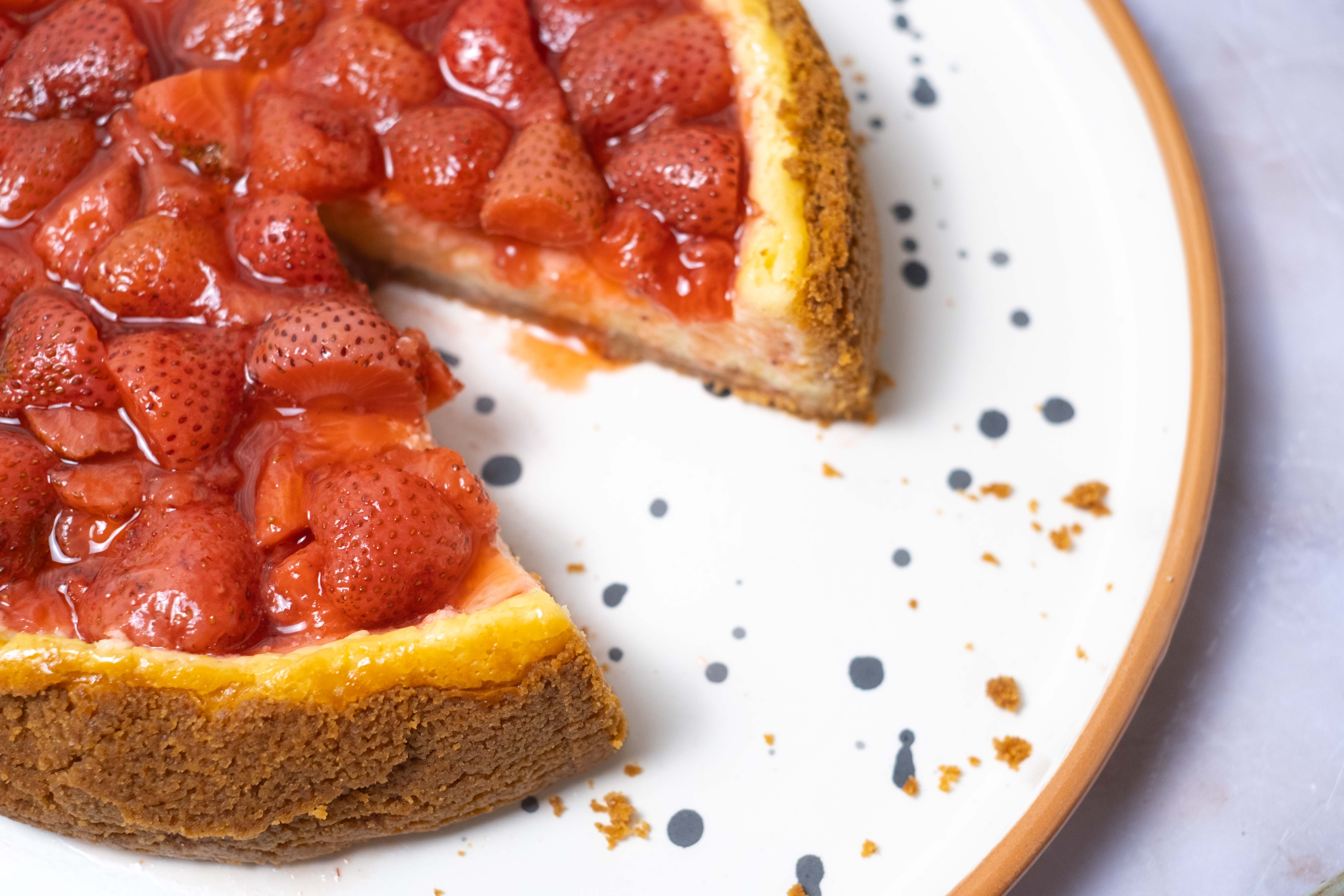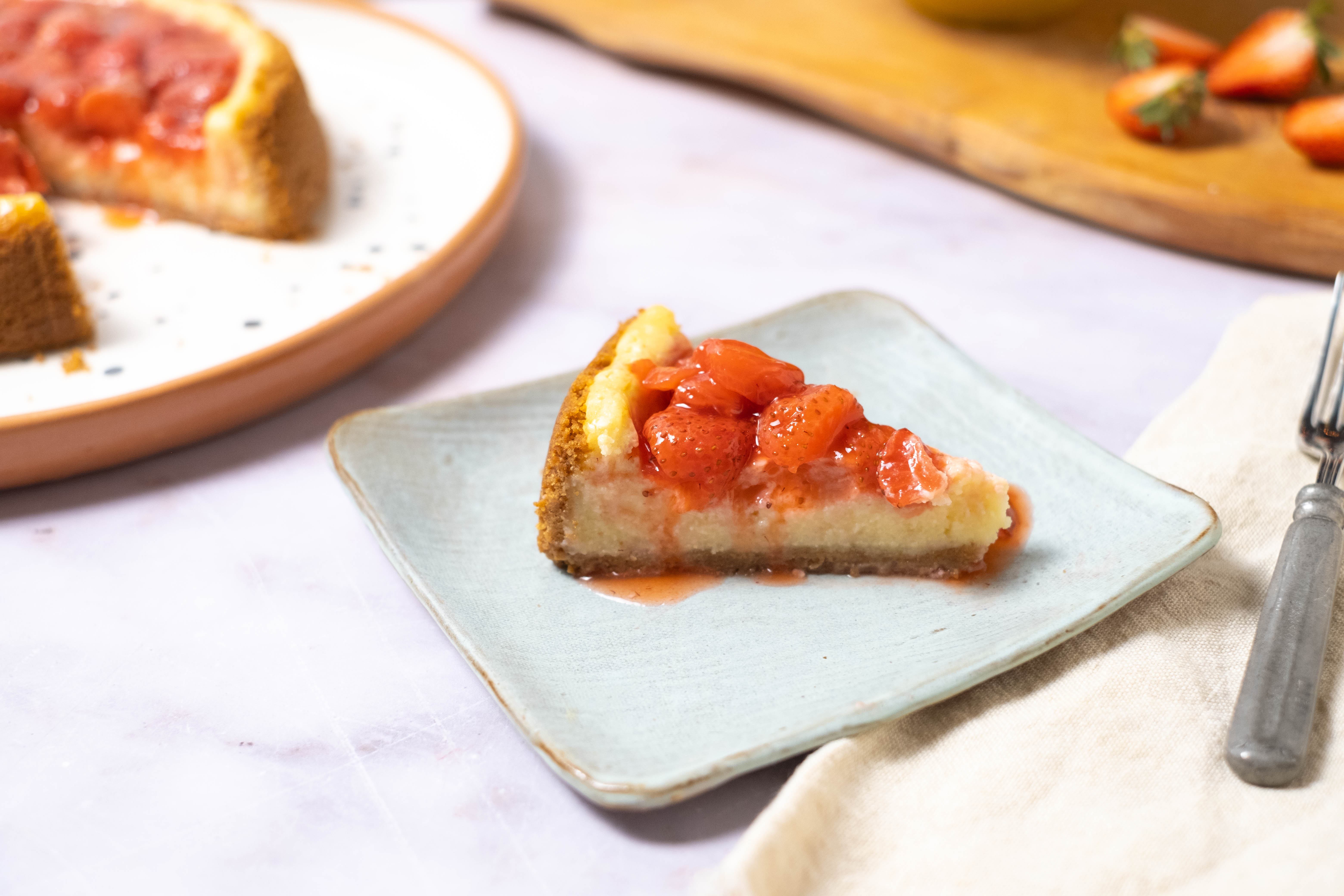Step 26 -Slice the strawberry cheesecake and serve it drizzled with the remaining strawberry topping.