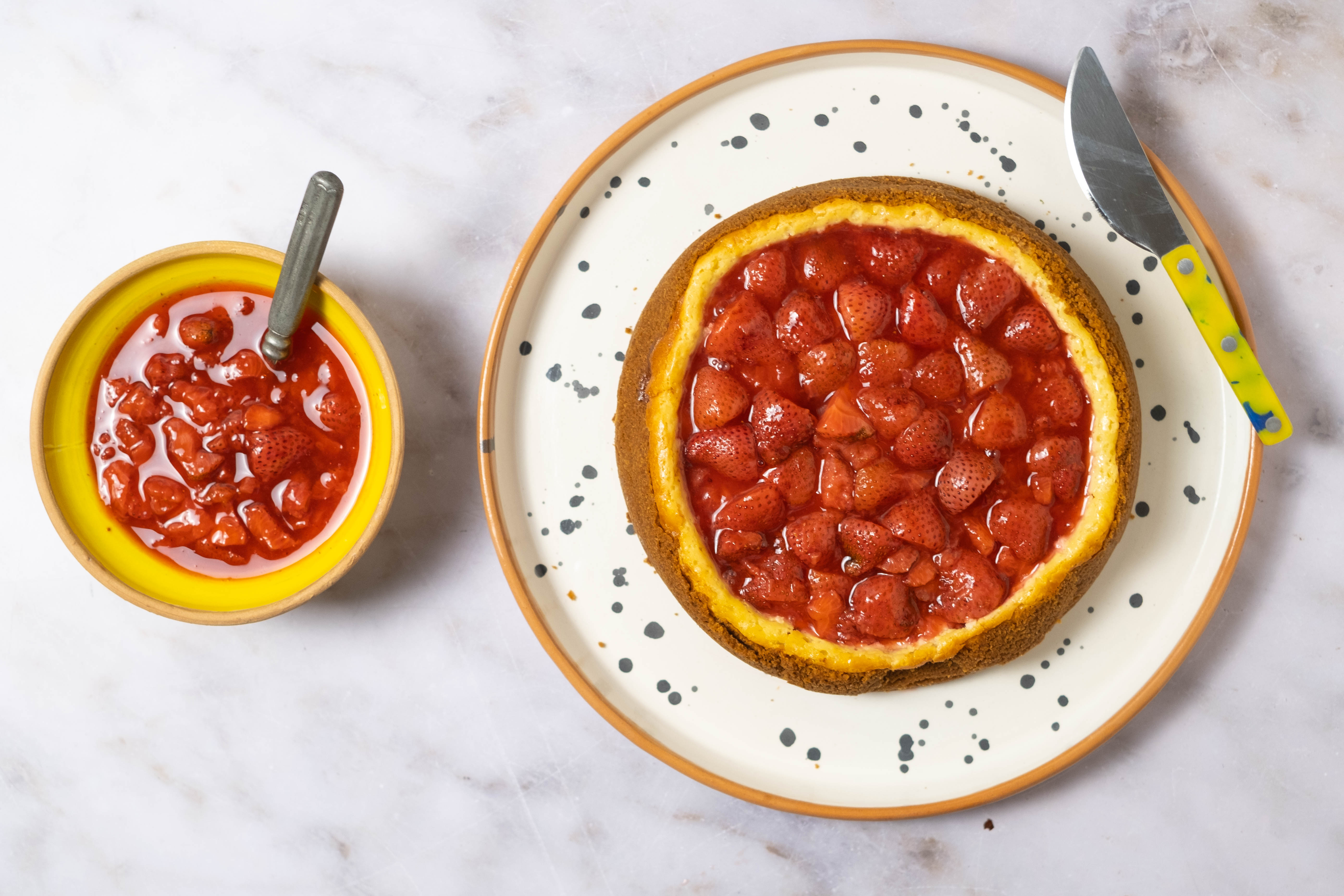 Step 24 -Spoon the strawberry topping onto the cheesecake so it's covered with a single layer of the halved strawberries. Flip the berry halves over so that they are face down. Reserve any of the remaining strawberry topping.