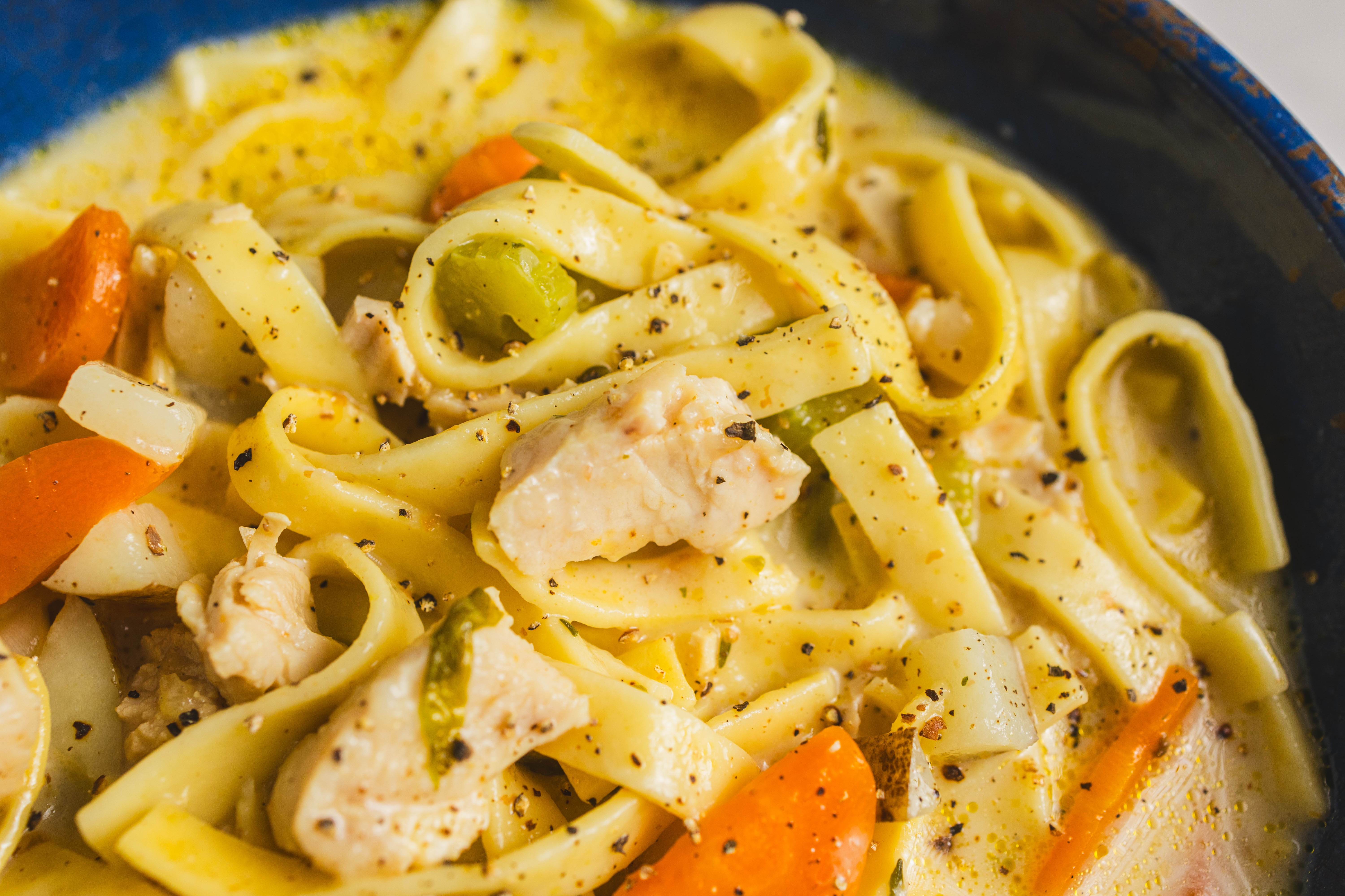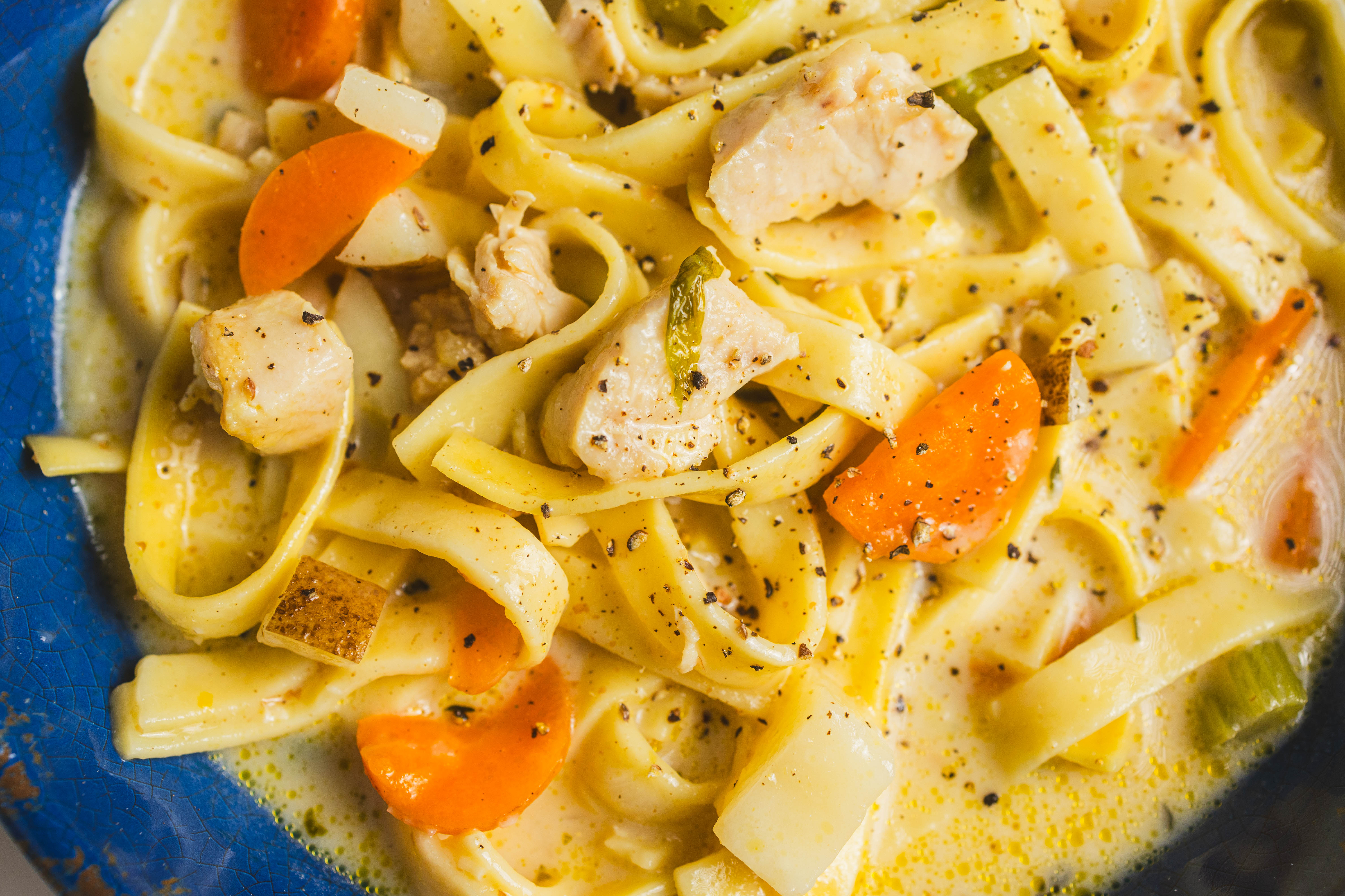 Step 8 -Add the chicken, the half-and-half, and the noodles to the soup mixture and cook, while stirring occasionally, until the noodles are tender, about 10 minutes.