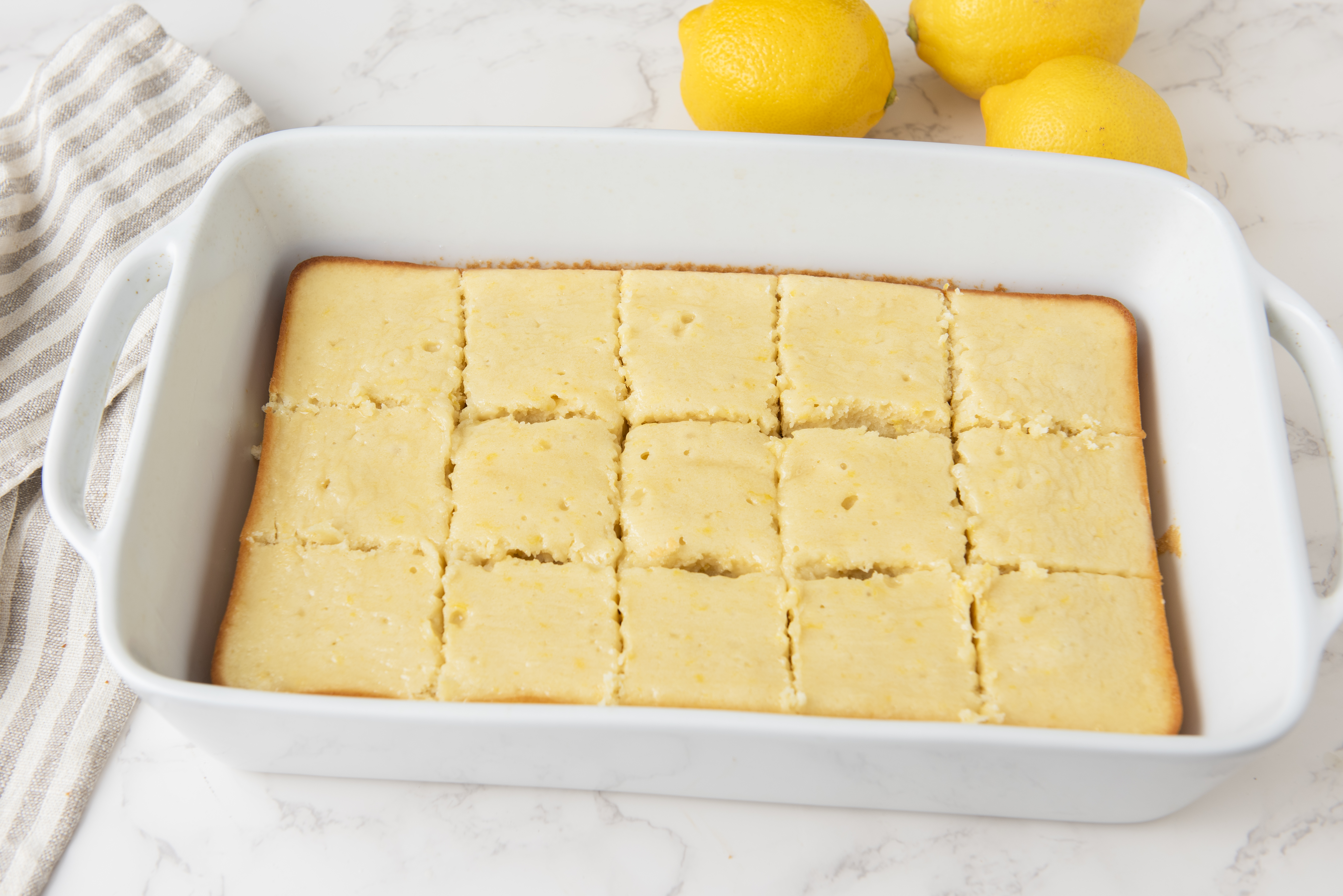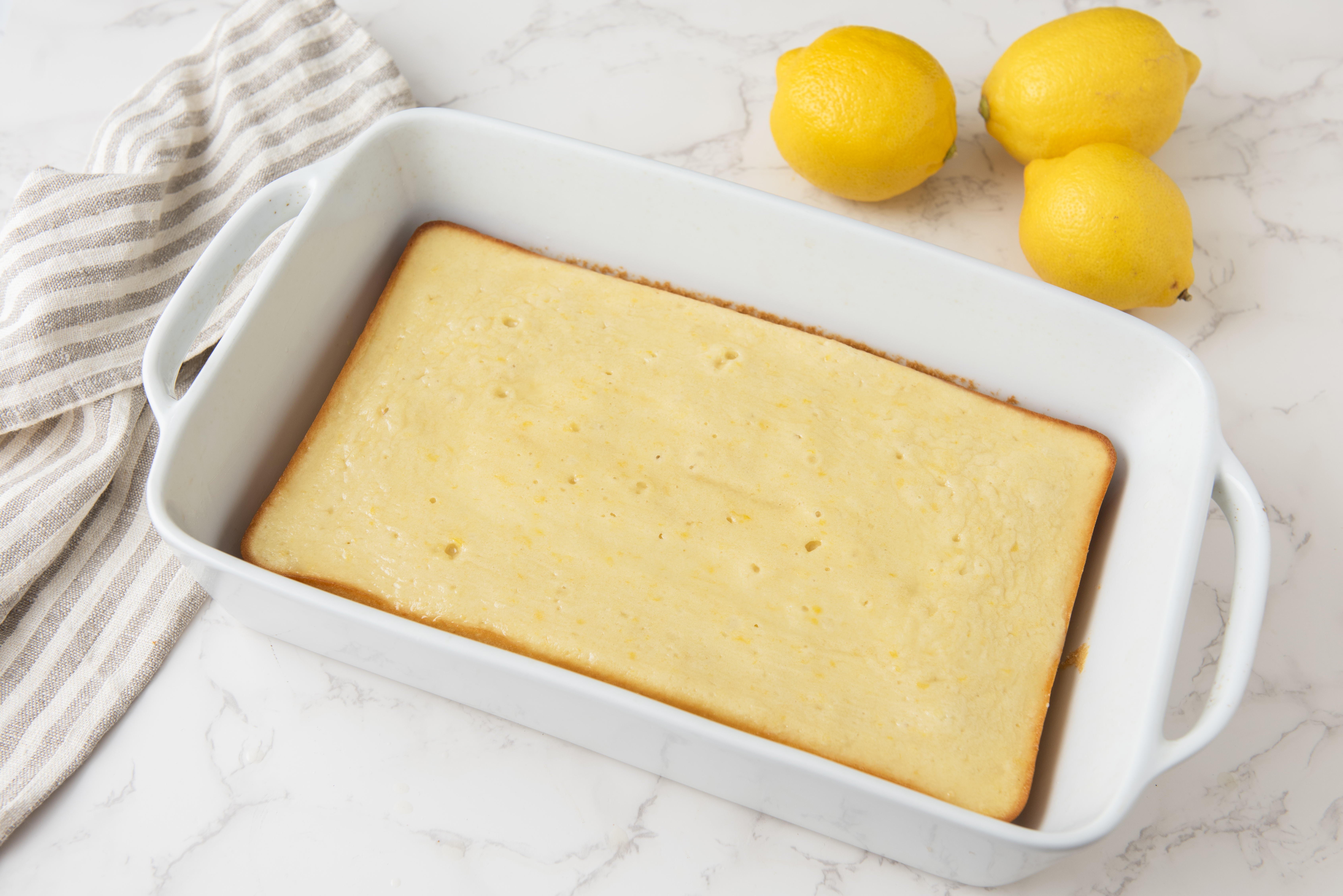 Step 13 -Immediately brush the lemon syrup over the lukewarm cake and allow it to soak in, continuing to brush and dab the cake with the lemon syrup until it has all soaked in.