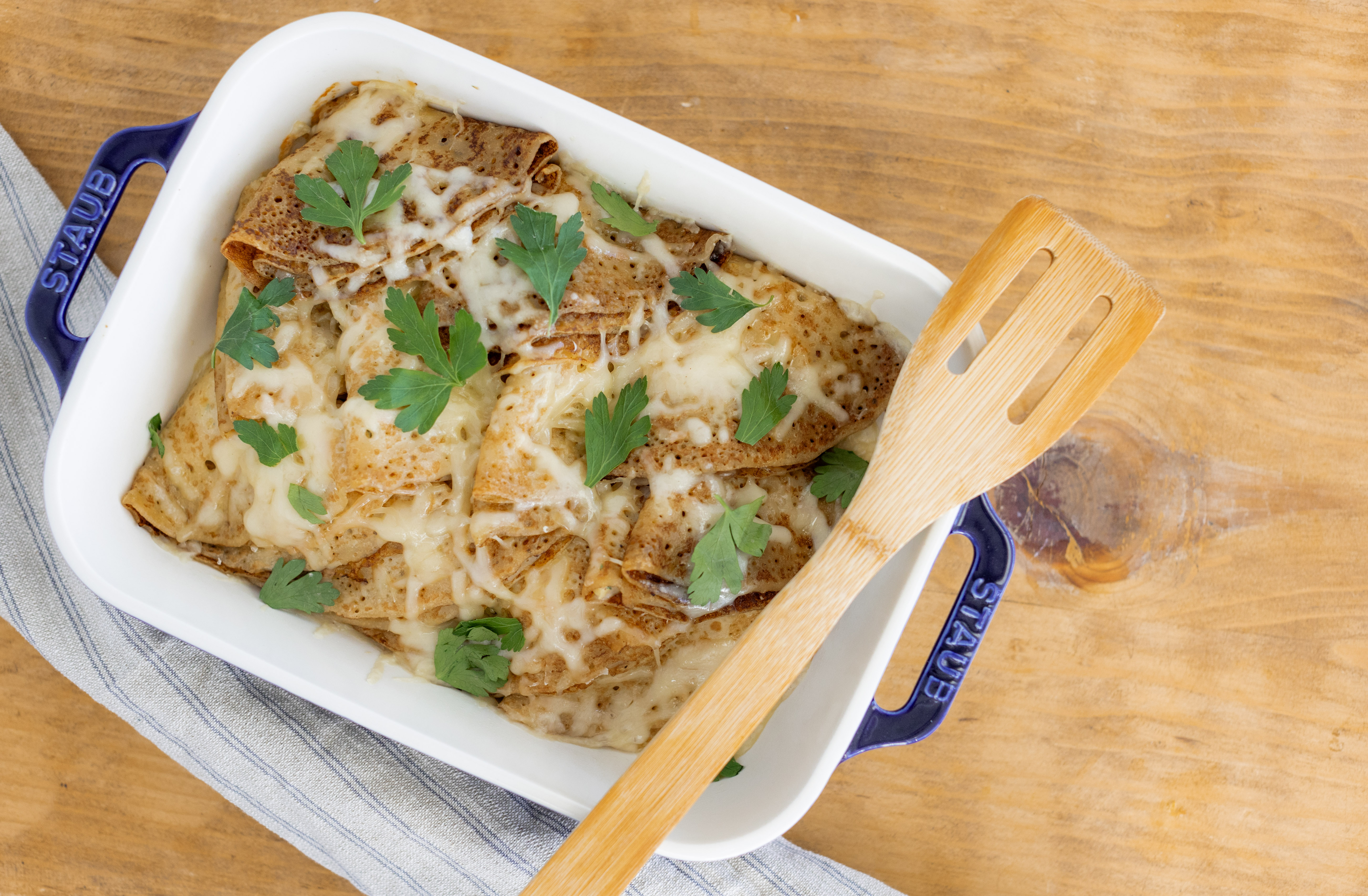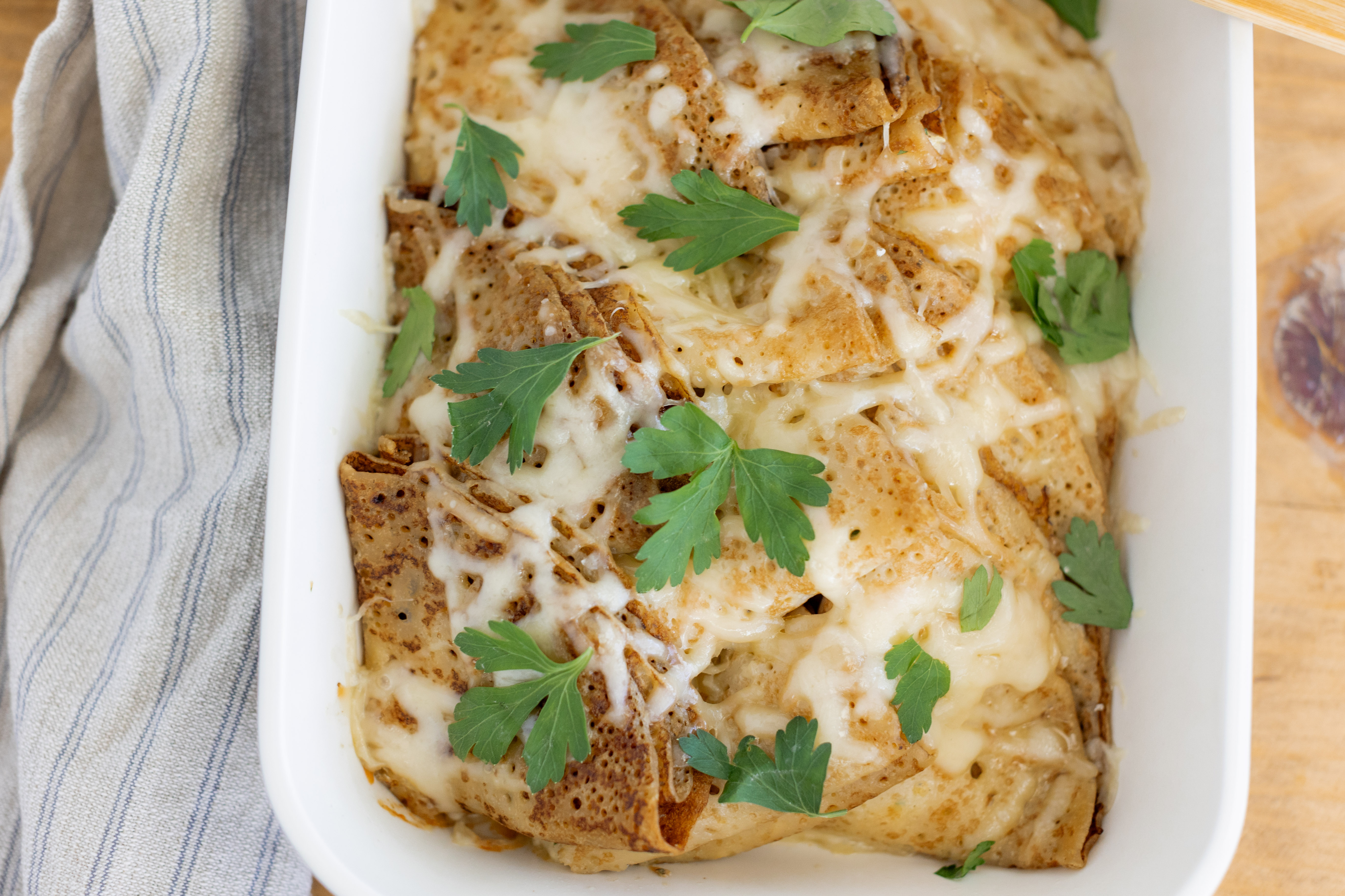 Step 11 -Place the filled crêpes in the prepared baking dish and sprinkle them with the remaining cheese.