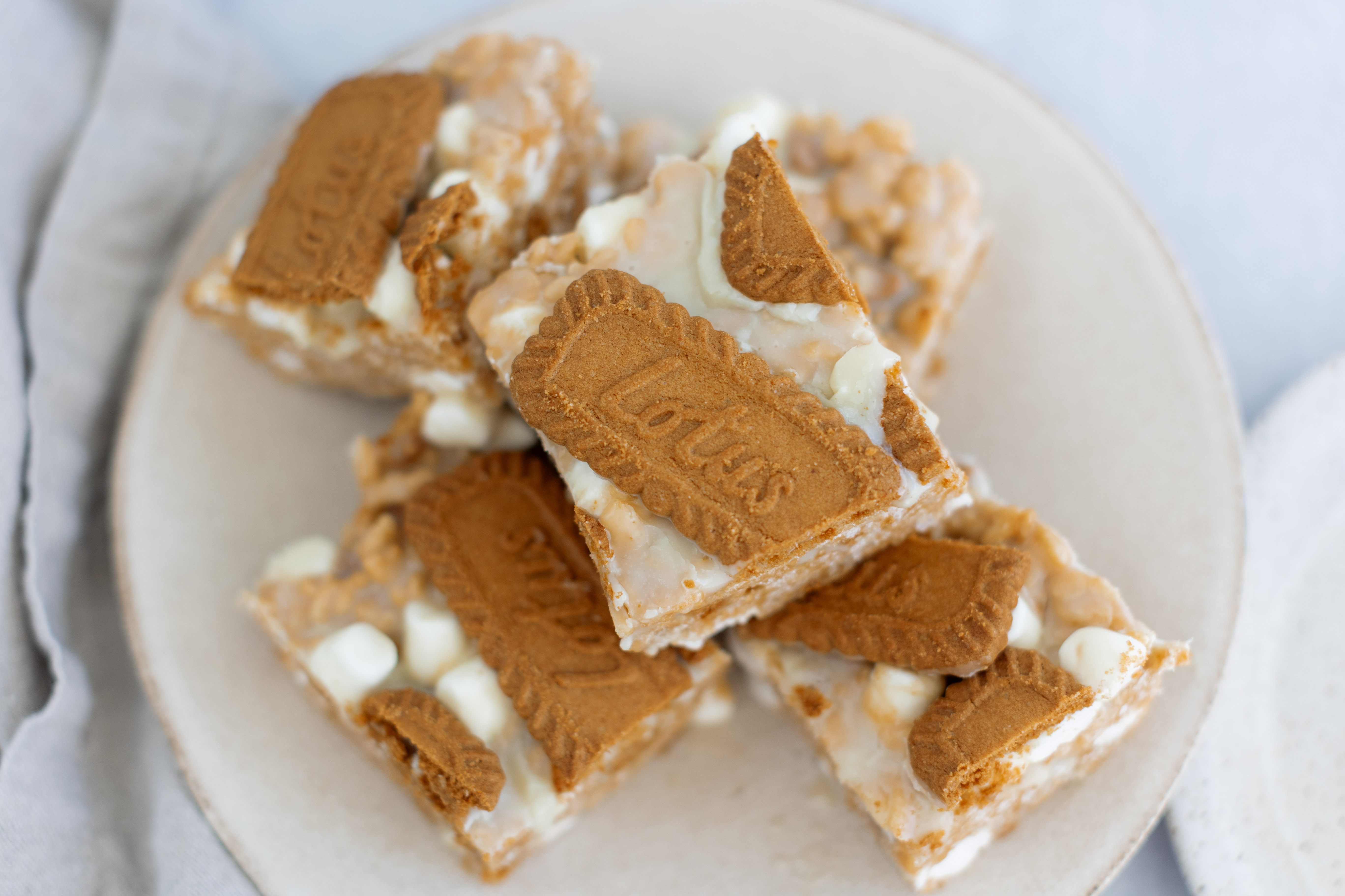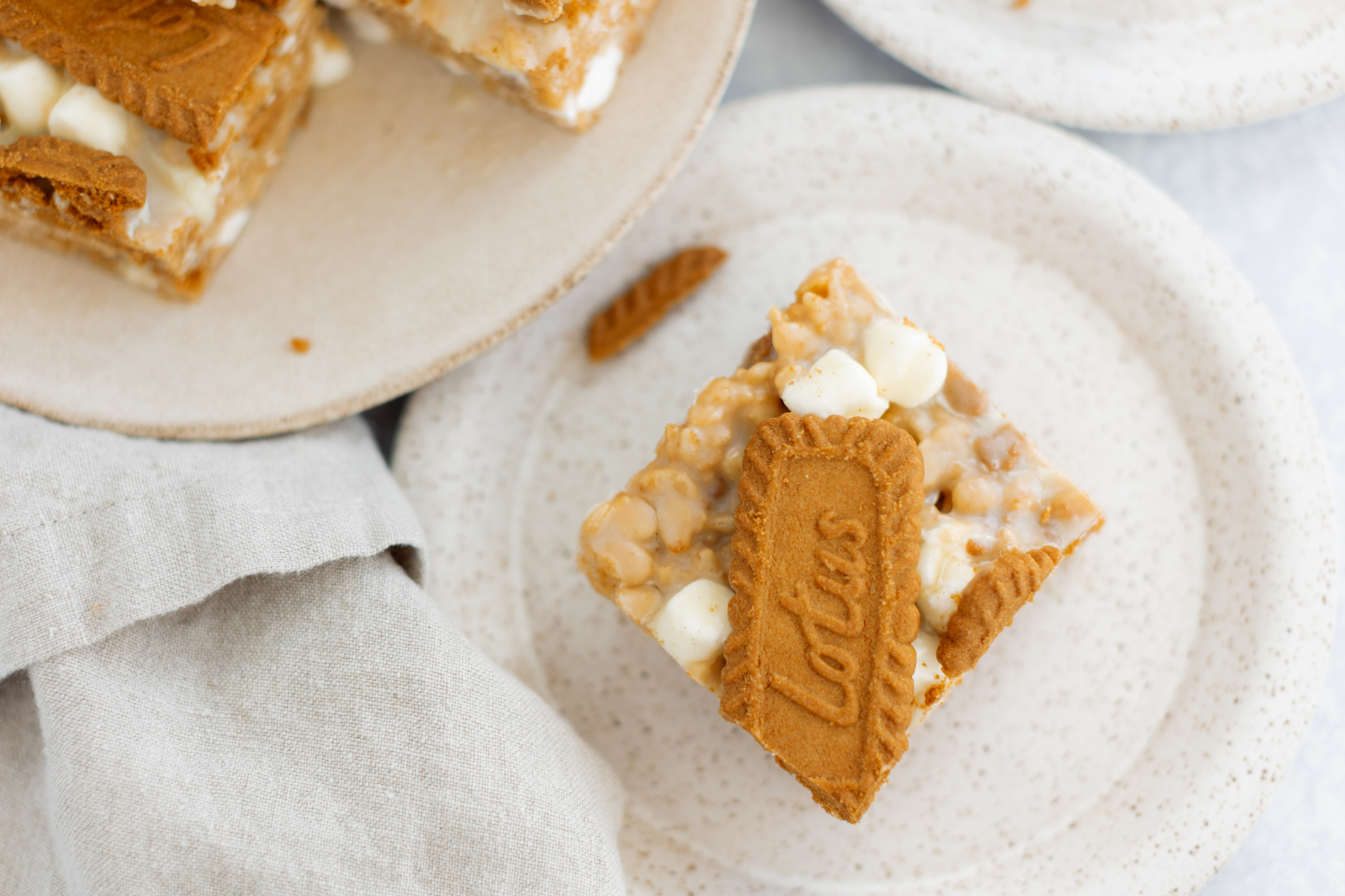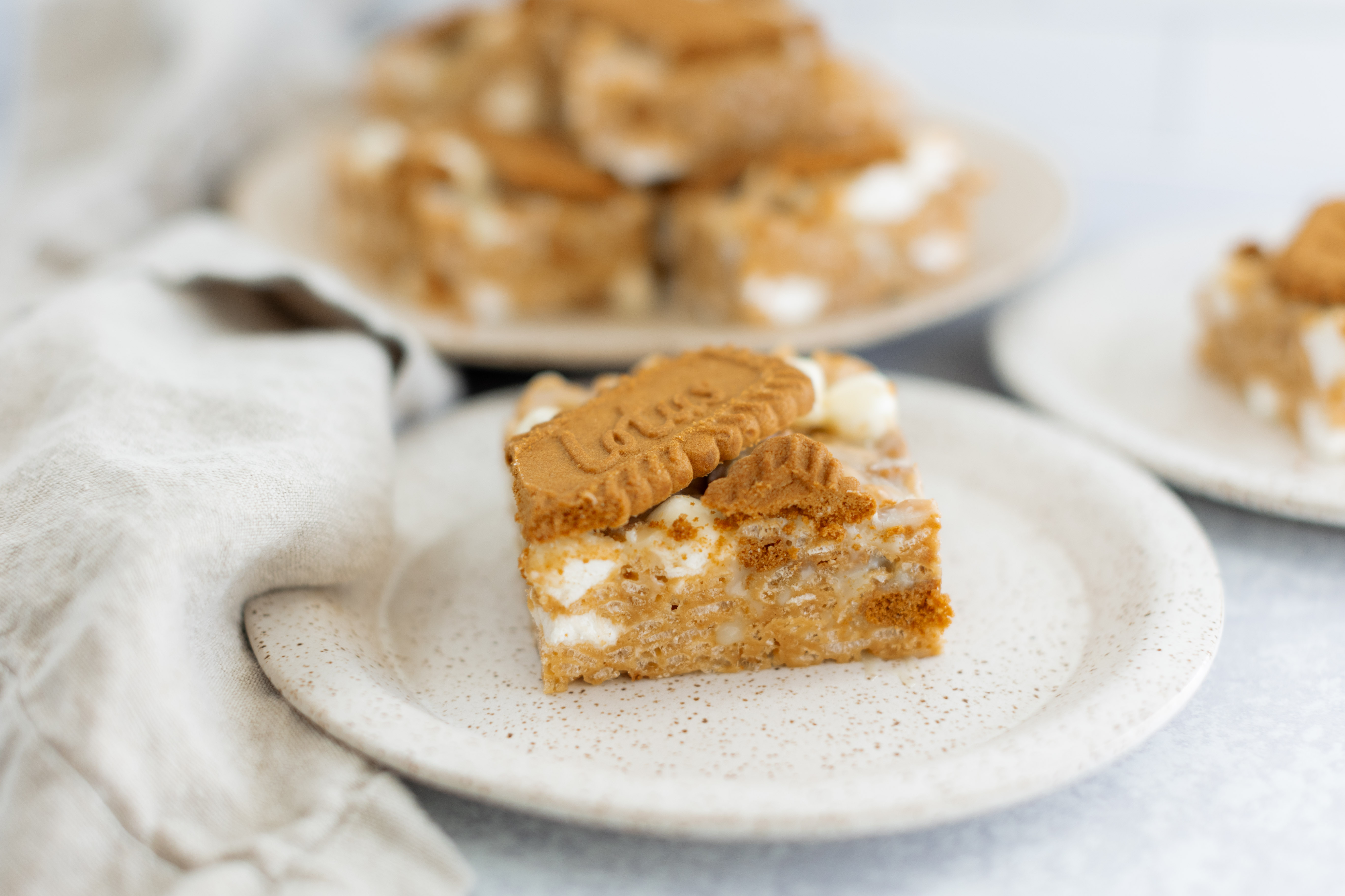 You know the marshmallow treats from your childhood? Marshmallow Cookie Bars are here to make those treats pale in comparison... and reawaken your inner kid in the process! The marshmallow and crispy rice cereal are as sticky-sweet as you remember, but now they've been mixed with the warm spice and richness of cookie butter. Then they get topped with a creamy white chocolate topping and speculoos cookies! Marshmallow Cookie Bars bring more joy to an already joyous dessert!