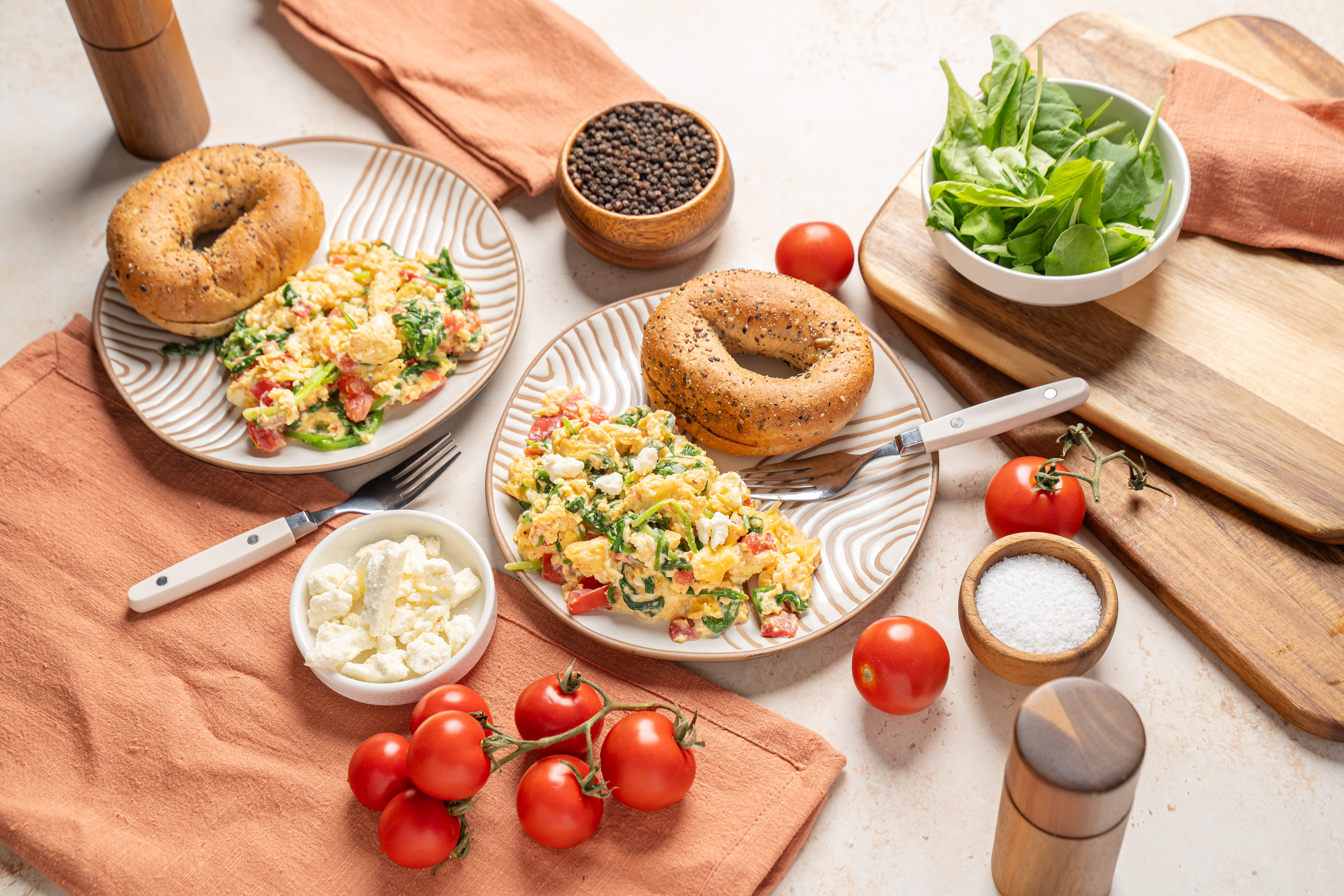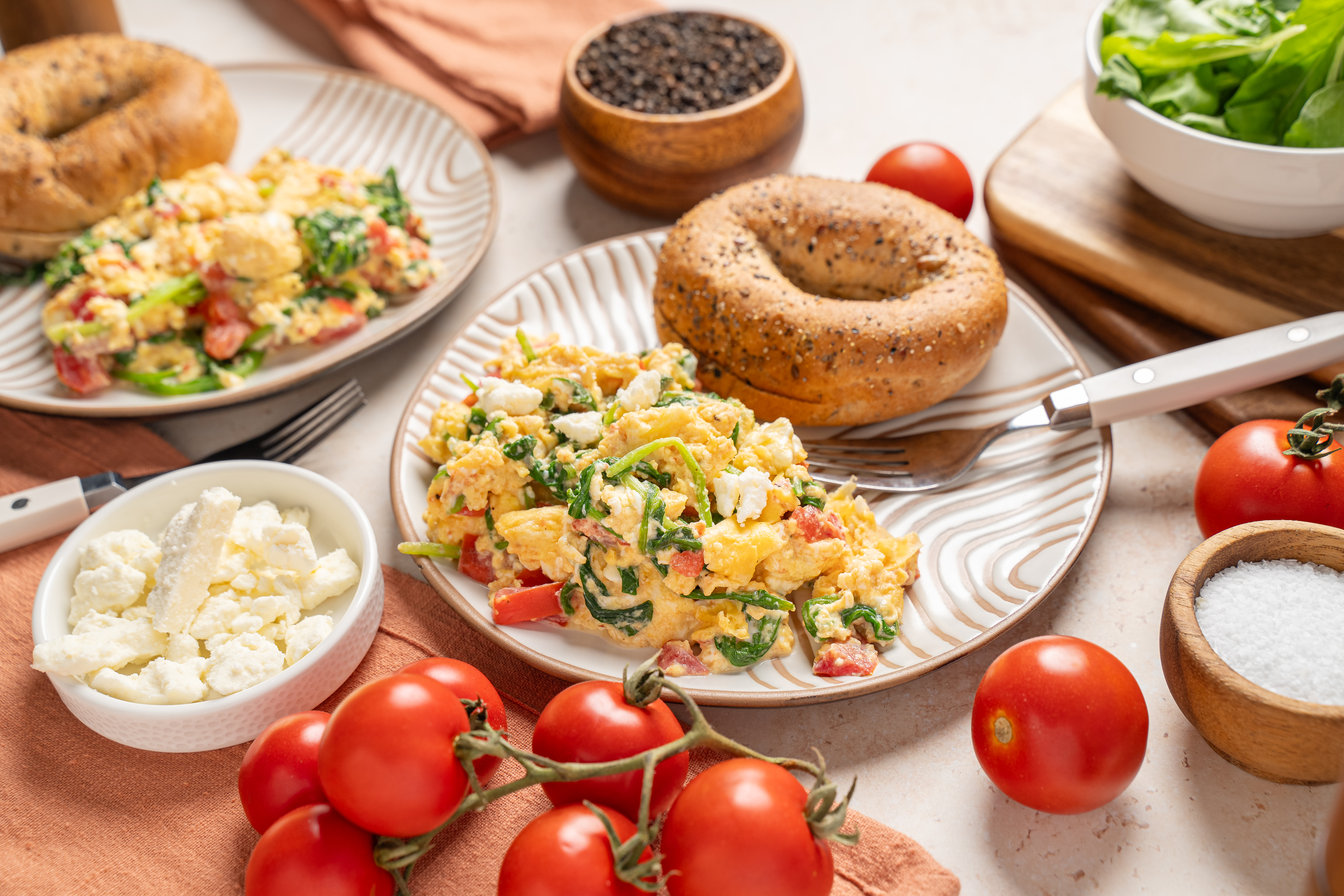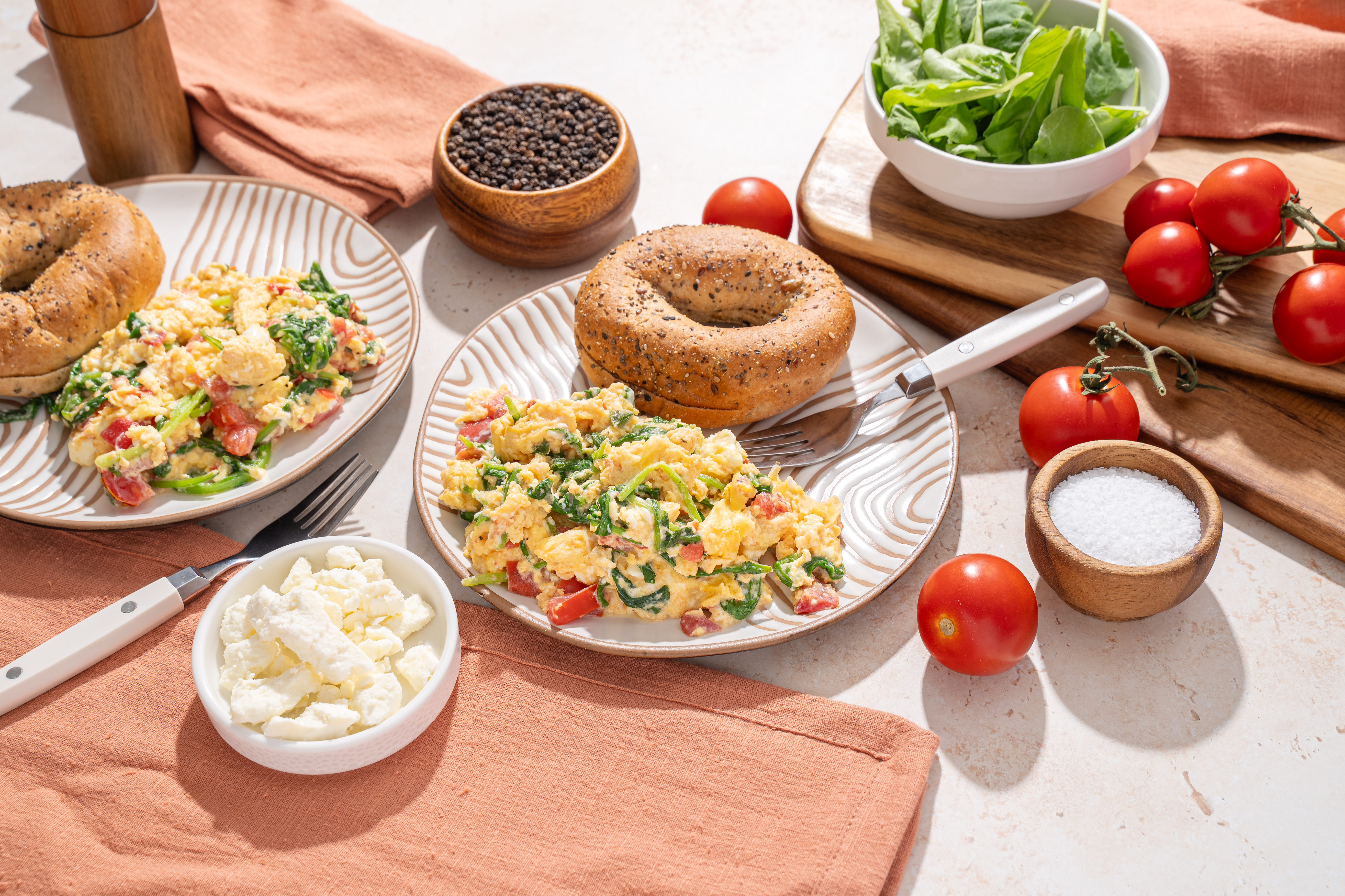 The blue waves of the Aegean Sea are lapping away in the background... well, for your taste buds anyway. You have to forgive them their fantasy; it's easy to be swept away by this Mediterranean Scramble! Fluffy scrambled eggs envelop bright tomatoes, wilted tender spinach, and creamy, sharp feta cheese. It's a familiar breakfast with an Athenian twist! Mediterranean Scramble will have you scrambling for more!