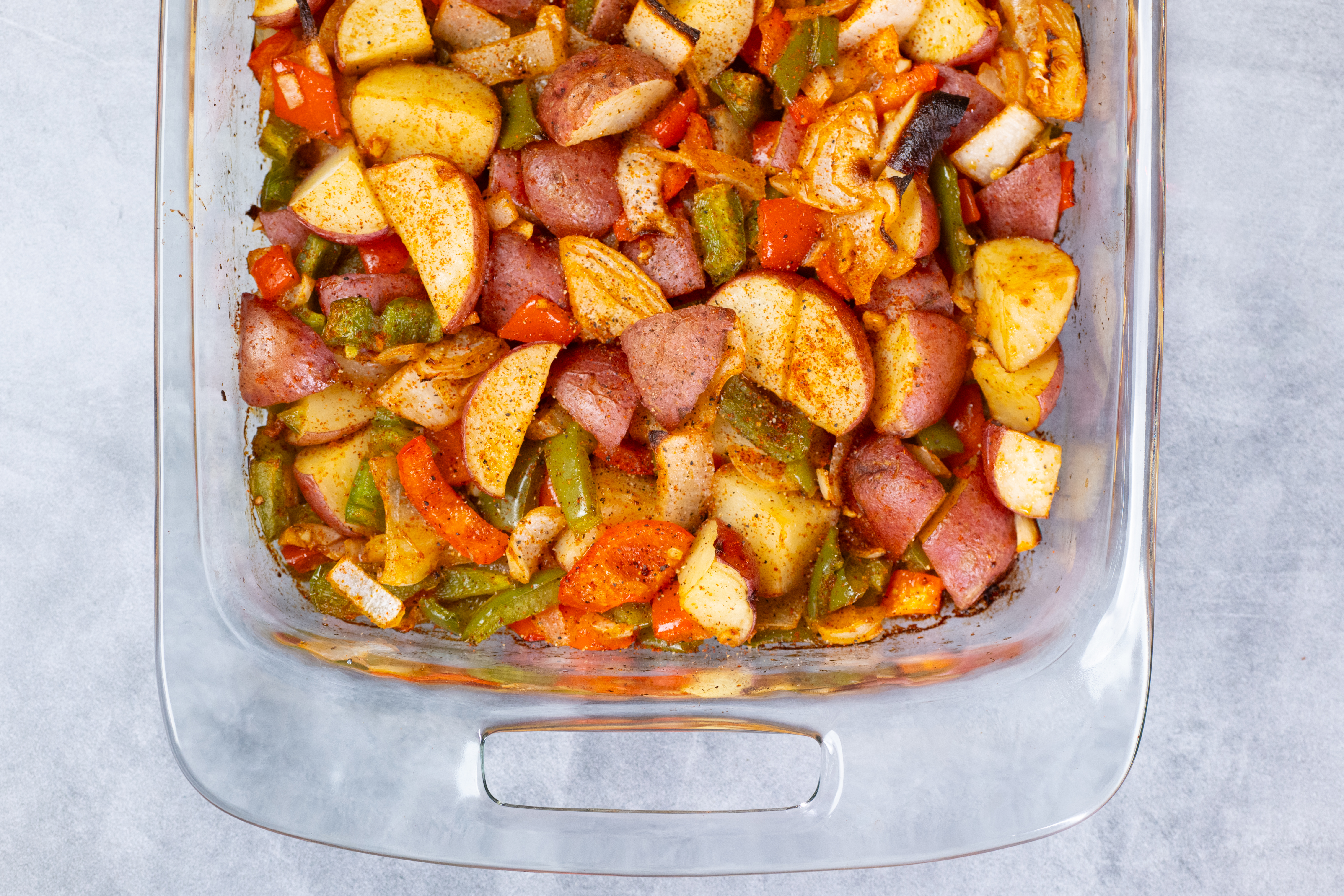 Step 2 -In a large bowl, add the potatoes, the garlic, the onions, the green bell peppers, the red bell peppers, the olive oil, the melted butter, the seasoned salt, the cayenne pepper, the salt, and the pepper and toss to combine.