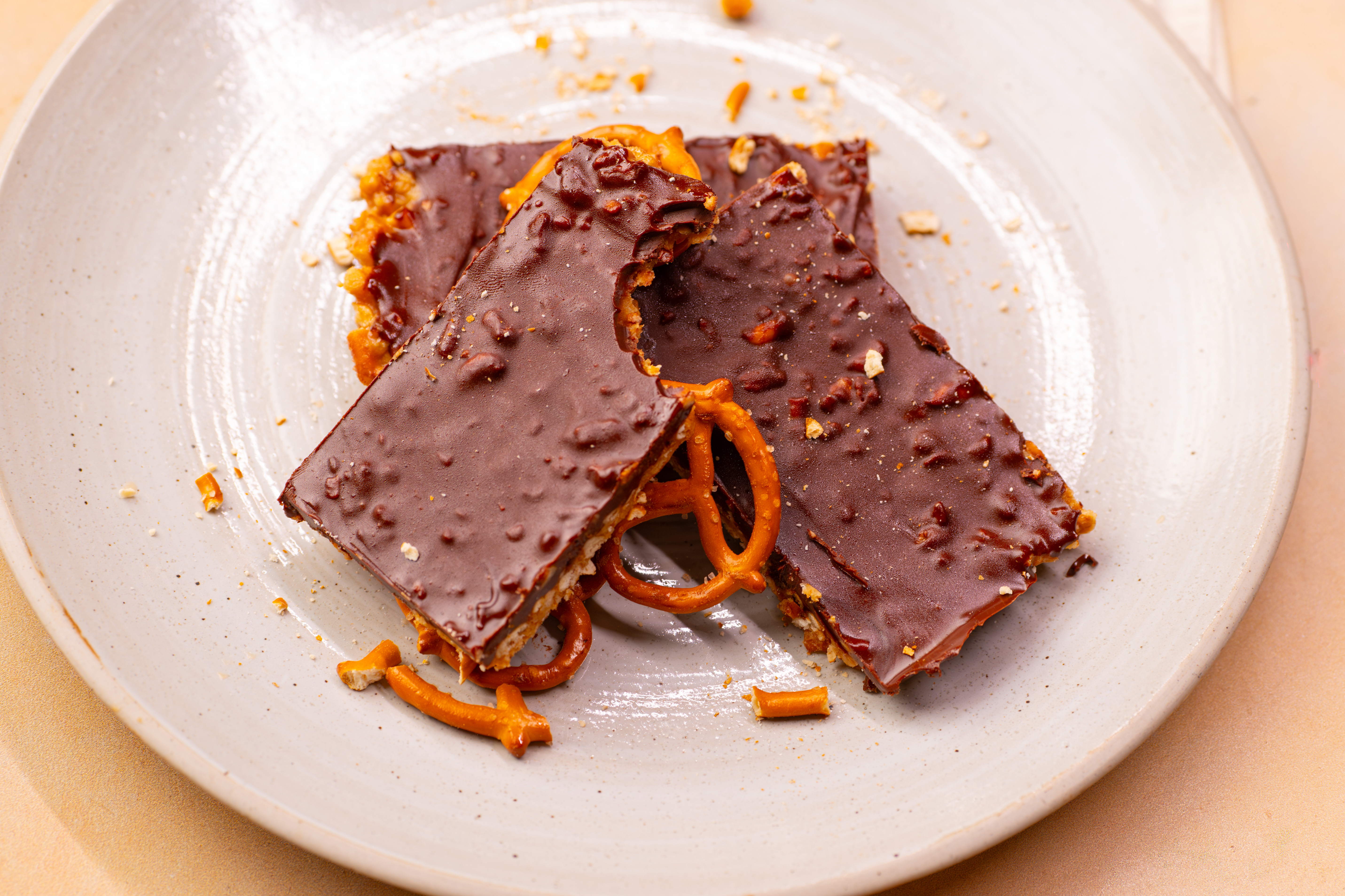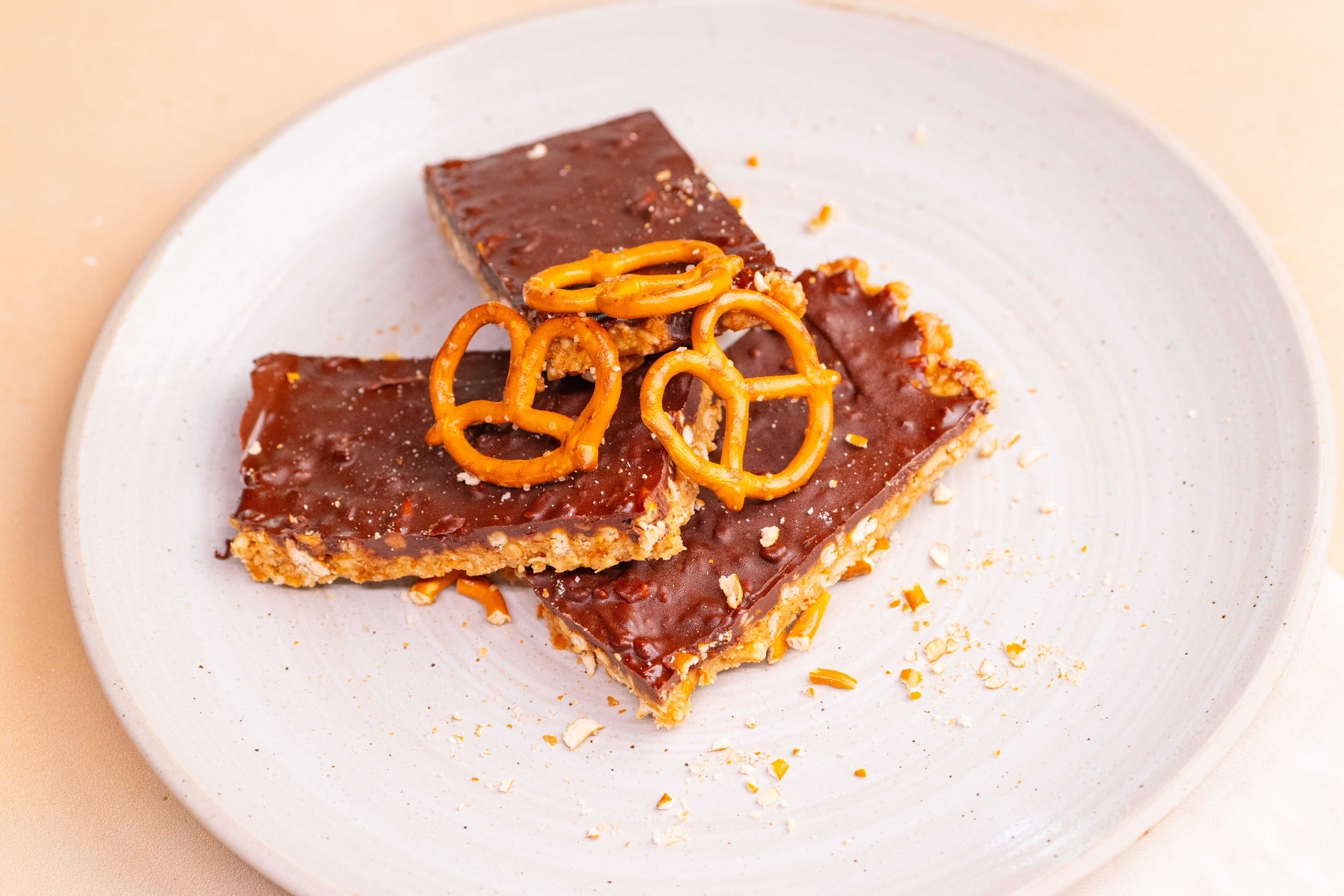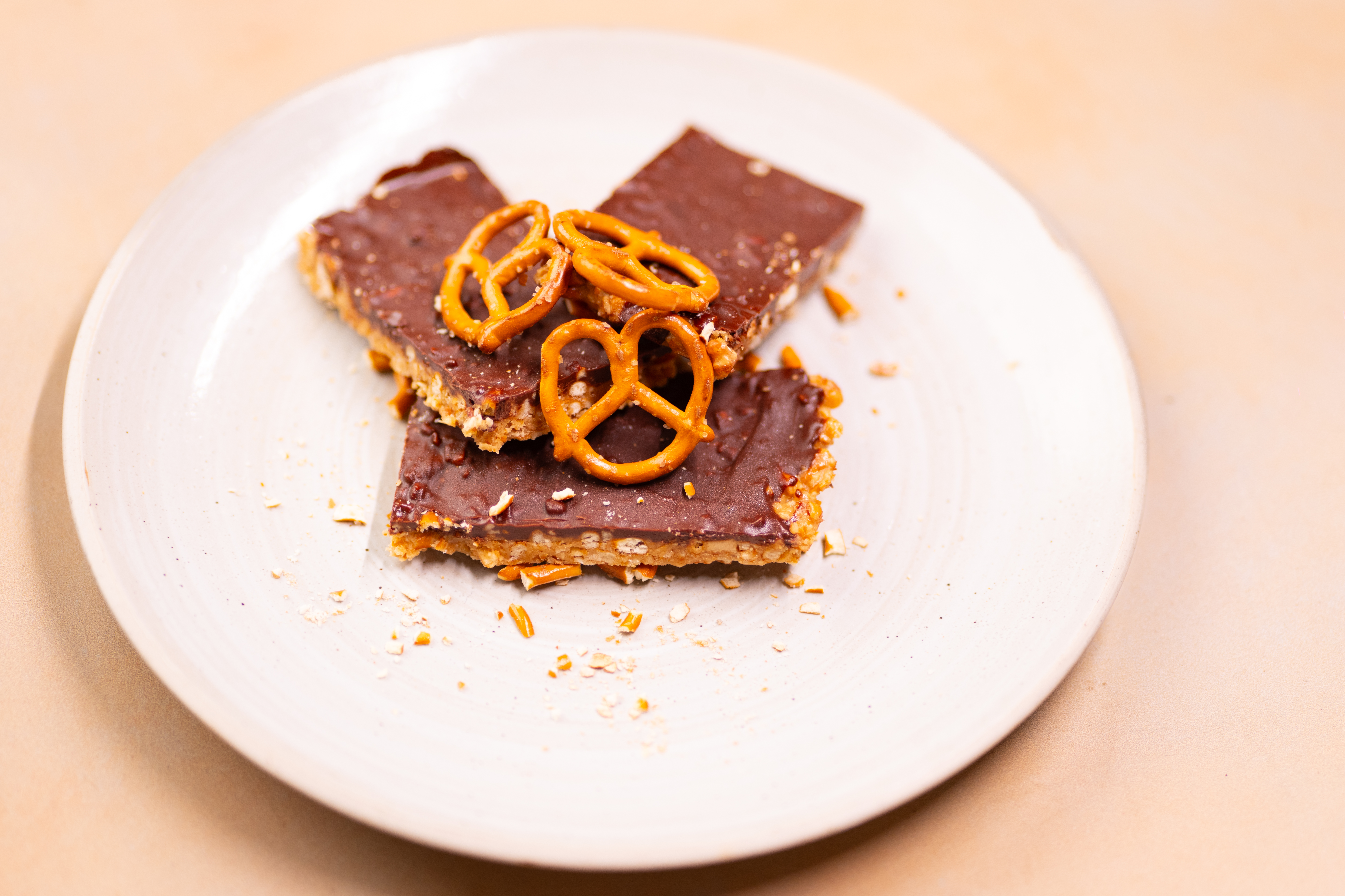 - 2 cups pretzels twists, finely crushed, plus more, to taste, whole, for garnish
