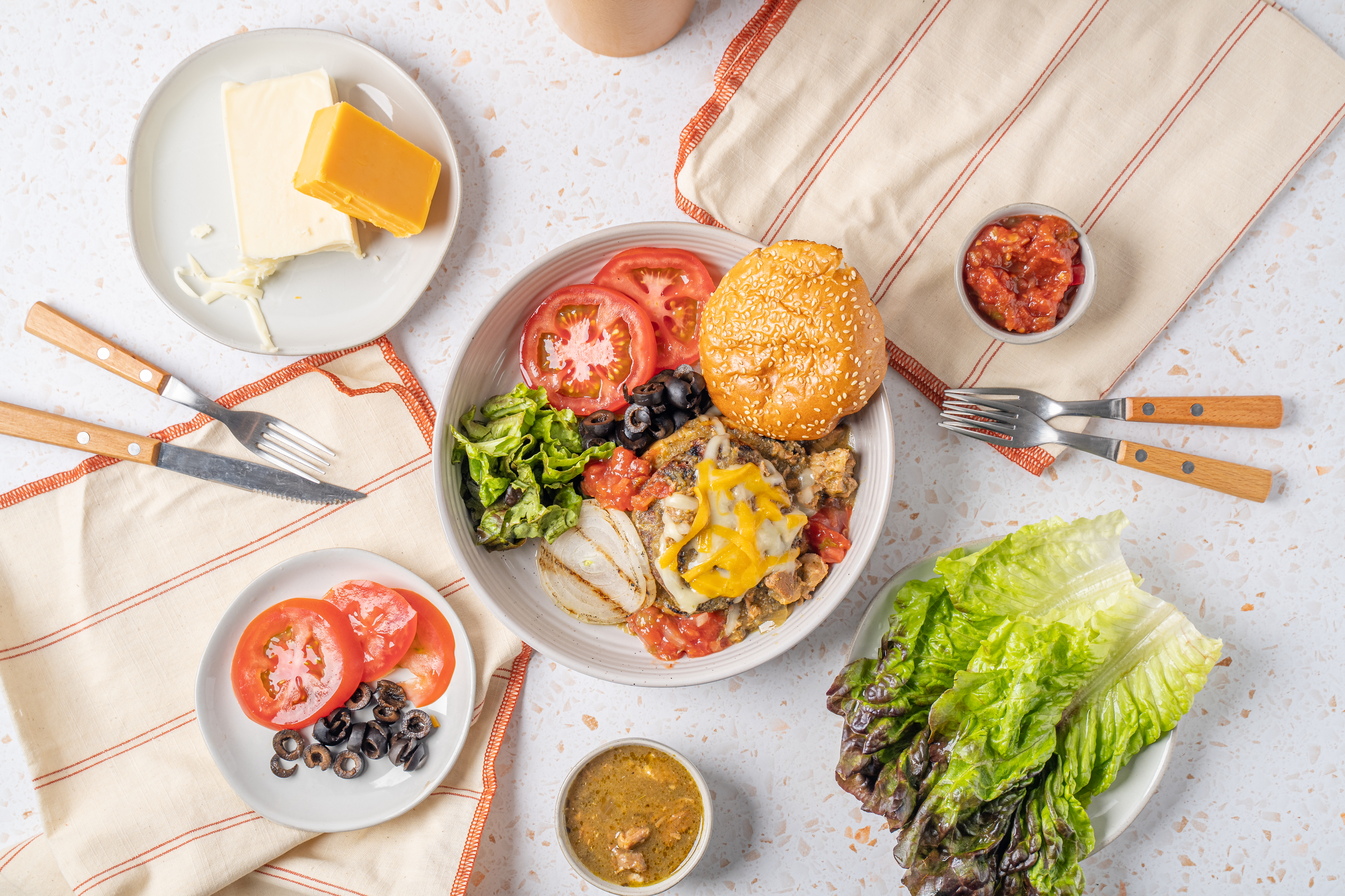 Step 7 -Evenly distribute the chopped lettuce, the grilled onions, the sliced olives, the sliced tomatoes, the sour cream, the salsa, and the bun-tops amongst both bowls, letting the toppings spill over the sides of the burger to fill the bowls, if desired.