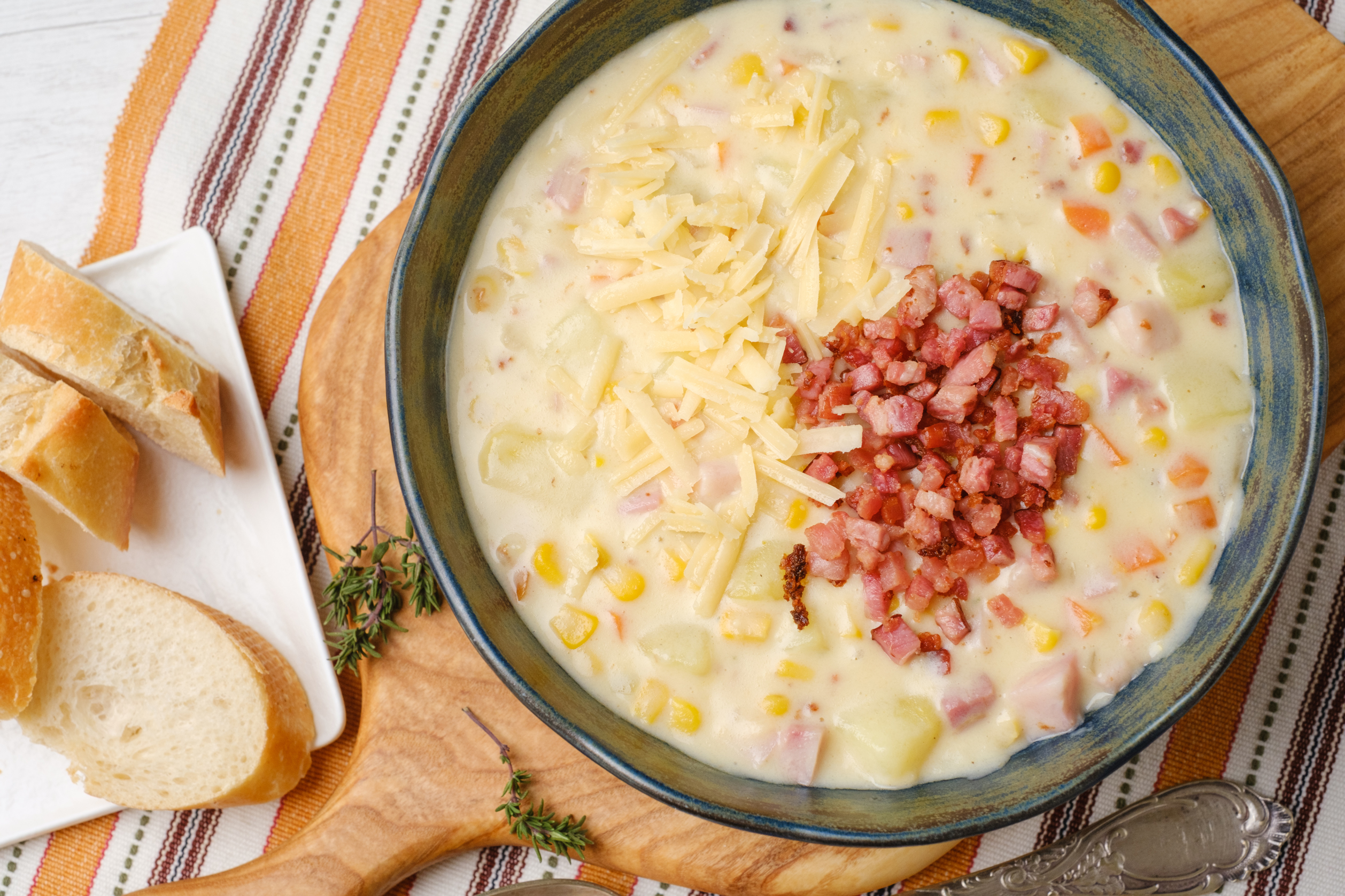 Great chowder in an hour isn't impossible; in fact, it's deliciously achievable with this Quick & Easy Cheesy Ham Chowder! The broth is creamy and savory, and filled with succulent ham and crisp bits of bacon for an extra pork kick! Loaded with cheese, potatoes, and sweet summer corn, the Quick & Easy Cheesy Ham Chowder is a warm weather favorite that tastes bountiful and looks beautiful!