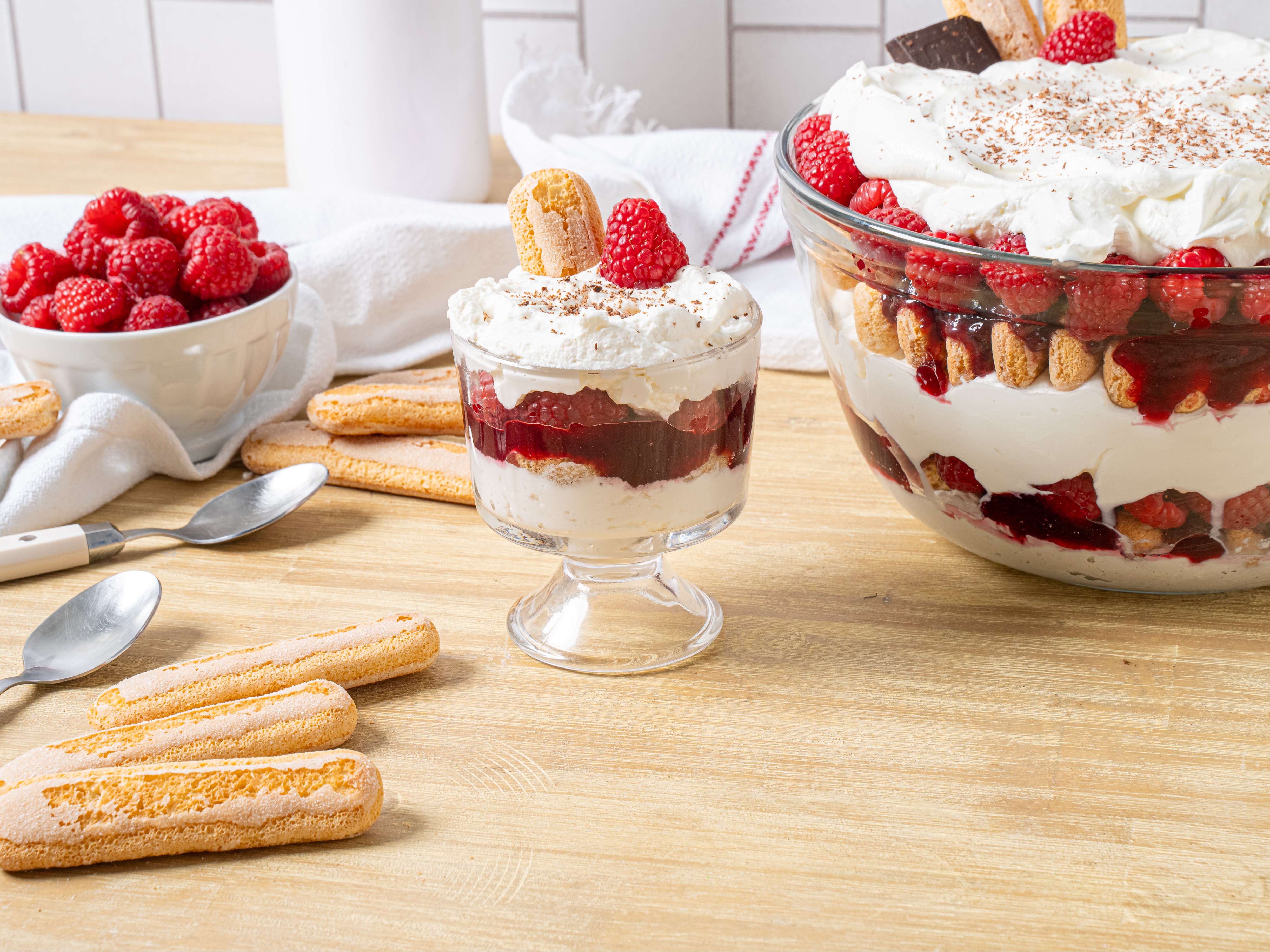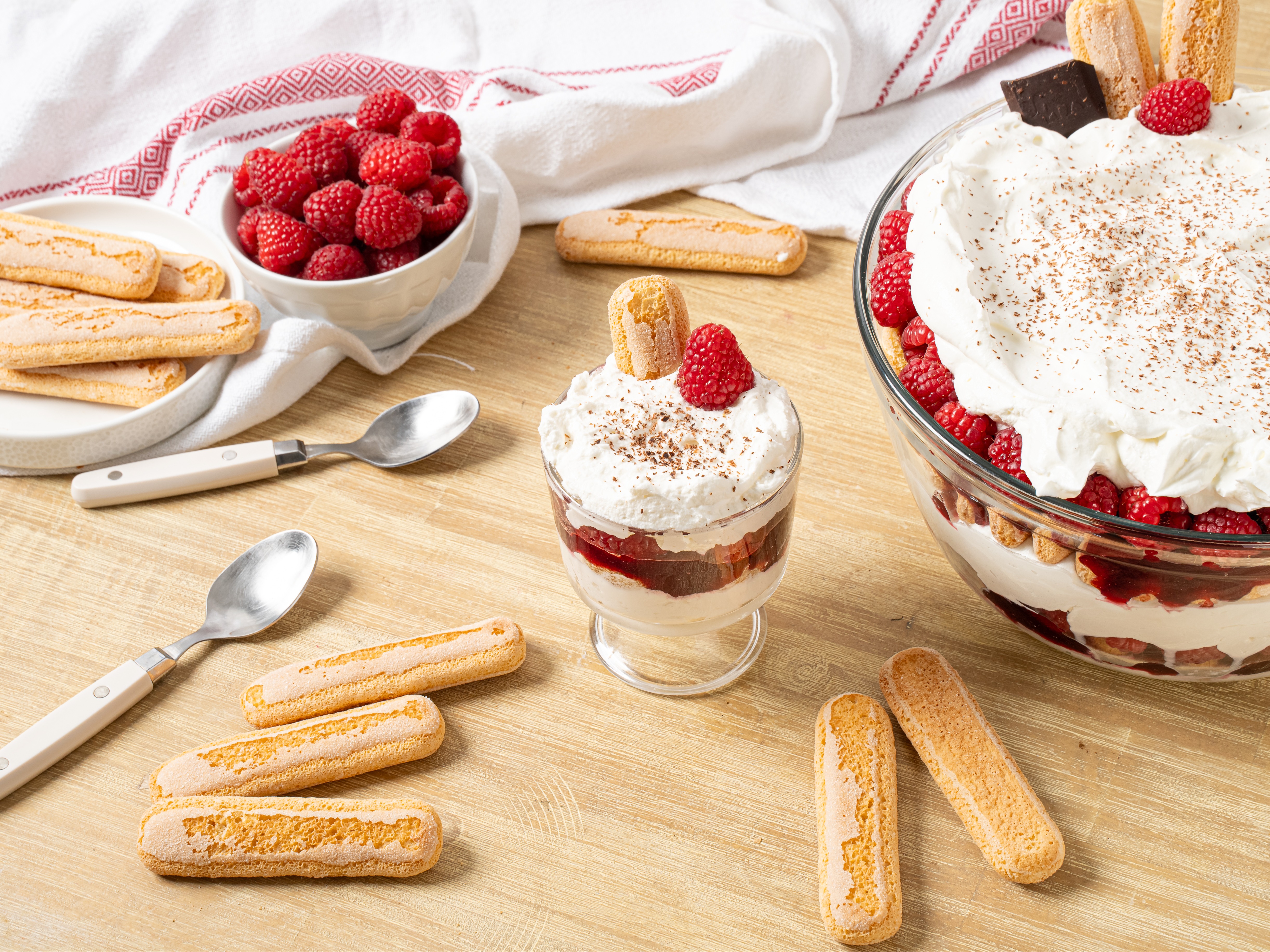 Step 15 -Serve the tiramisu garnished with the chocolate shavings, the extra ladyfingers, and the extra raspberries.