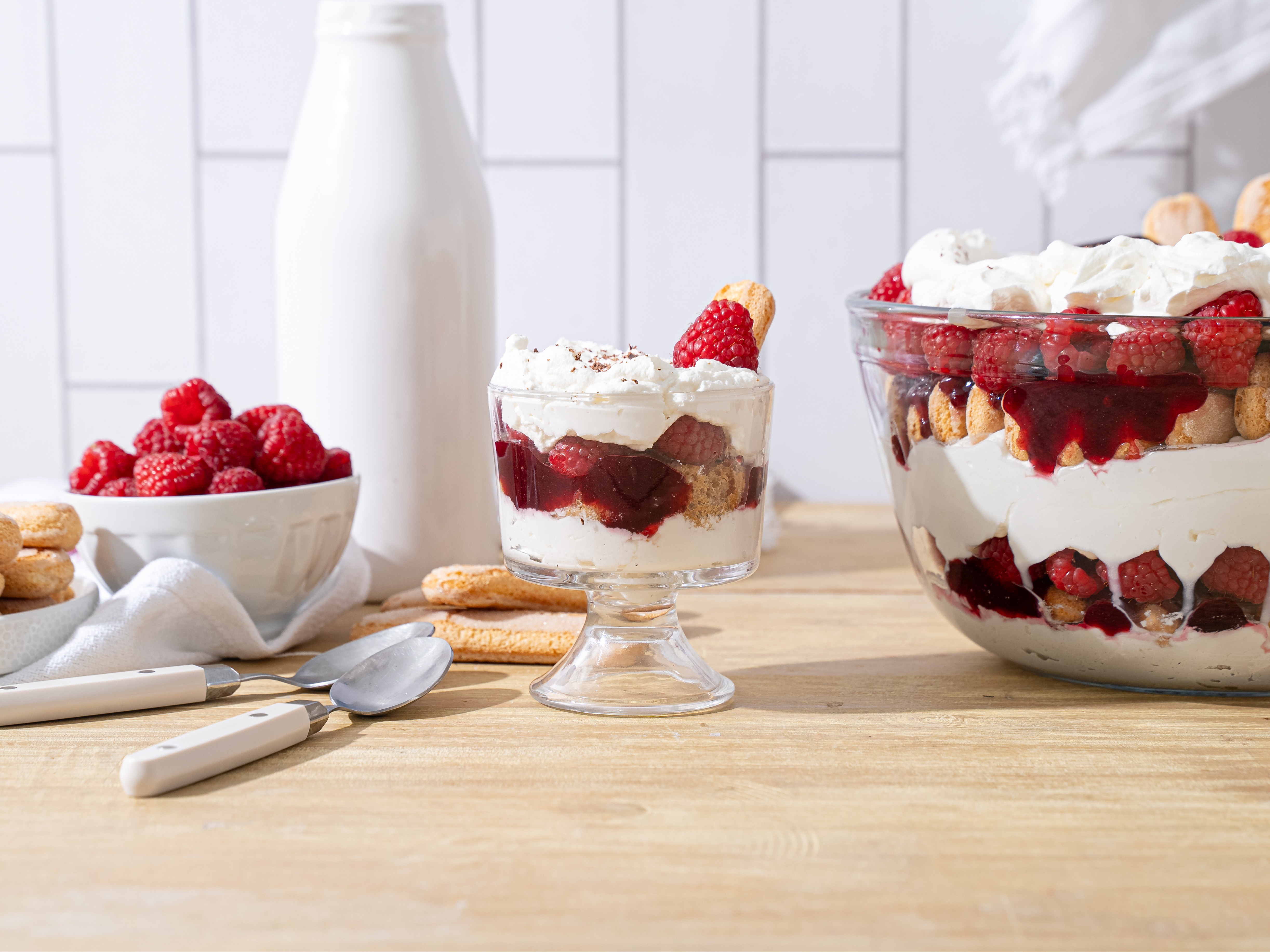 Step 11 -Evenly spread 1/2 of the remaining whipped cream over the ladyfinger layer, then evenly top with the remaining jam and 6 ounces of the remaining raspberries.