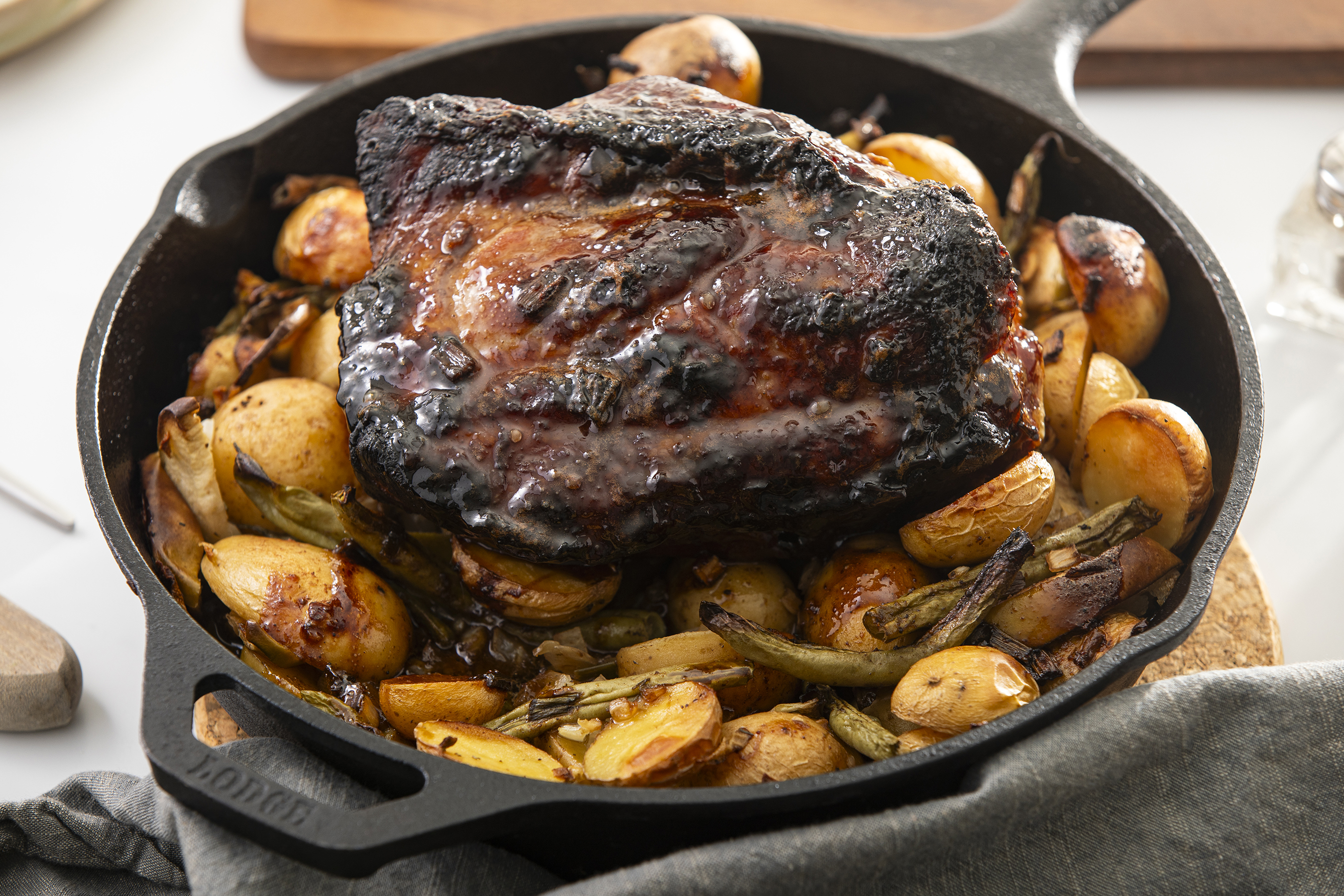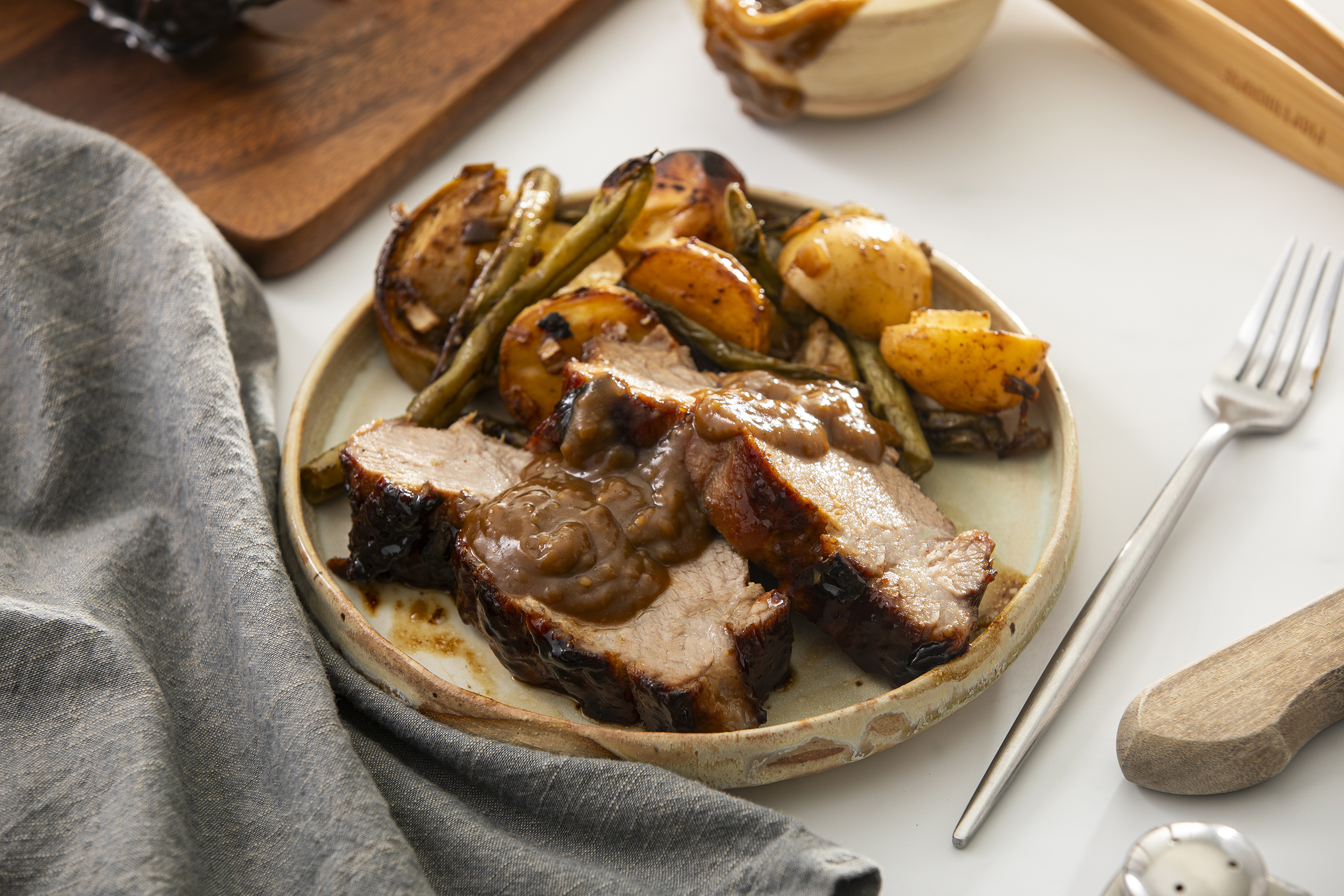 A dinner for your special someone needs to be as special as they are! Romantic Pork & Veggies is exactly that! The pork is coated in a sweet and savory glaze, which caramelizes on the pork as it roasts to juicy, savory perfection! Underneath the pork is a pile of potatoes, tart and sharp apples, and crunchy green beans, the perfect balance to the rich meat. Romantic Pork & Veggies will make this evening truly memorable!