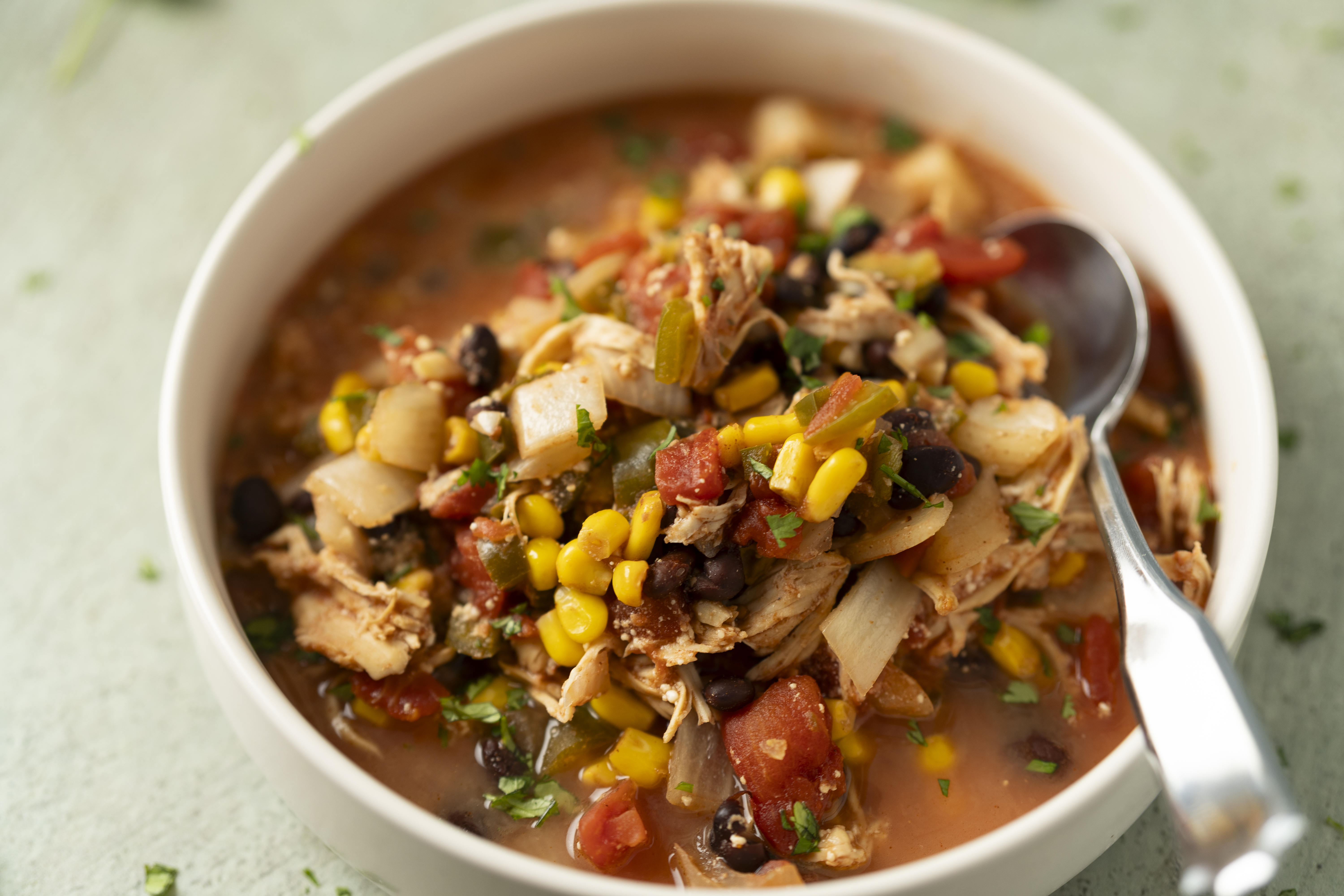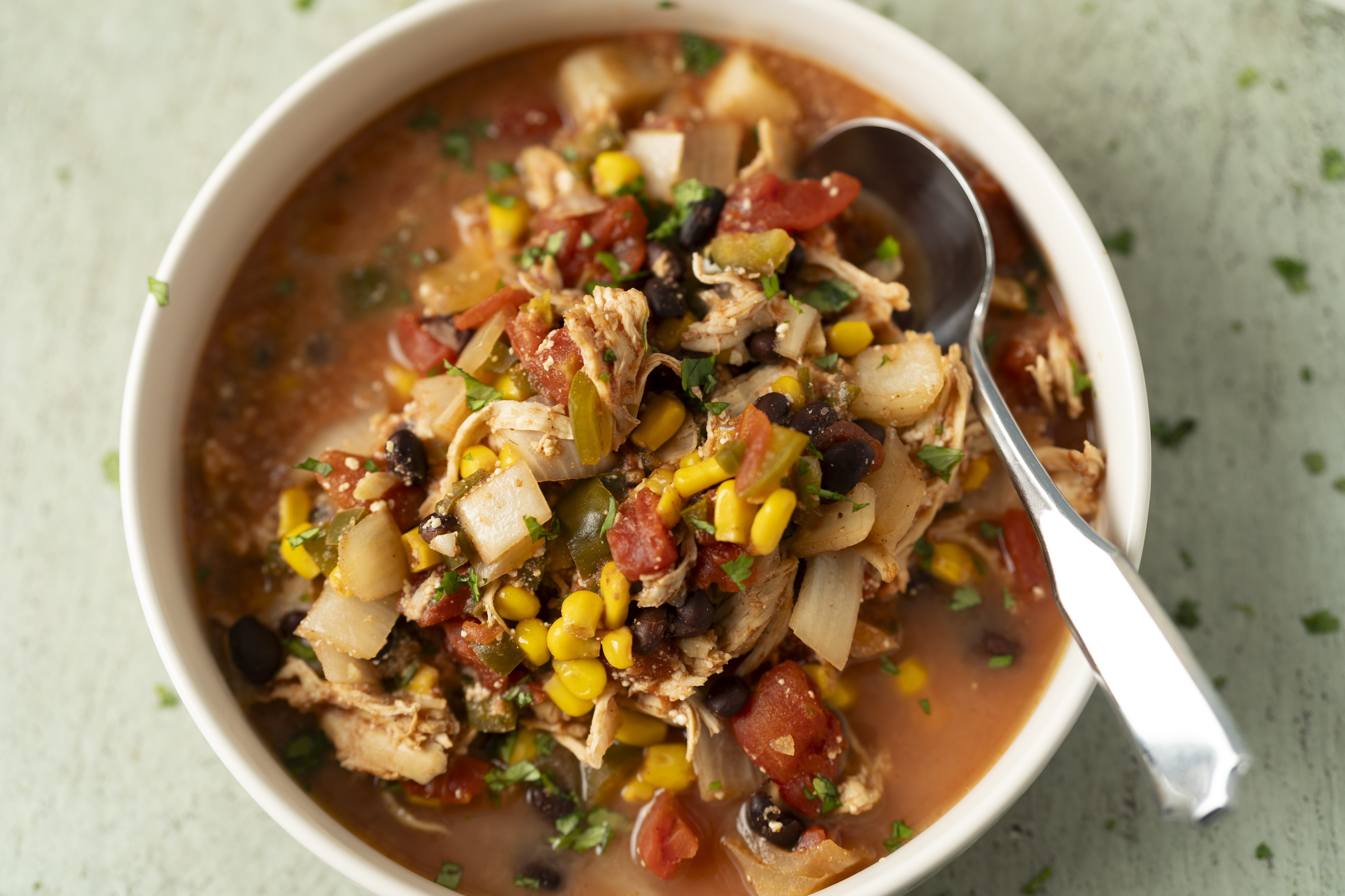 How heartwarming! How cozy! How delicious! Rustic Enchilada Soup is literally an enchilada in a bowl — the melt-in-your-mouth tender chicken, the fajita vegetables, the spicy jalapeño peppers, the hearty beans, it's all here! Oh, and the cheese! So, so much cheese... melty and spicy and salty! Rustic Enchilada Soup is a slow cooked masterpiece sure to warm you up when you need it most!