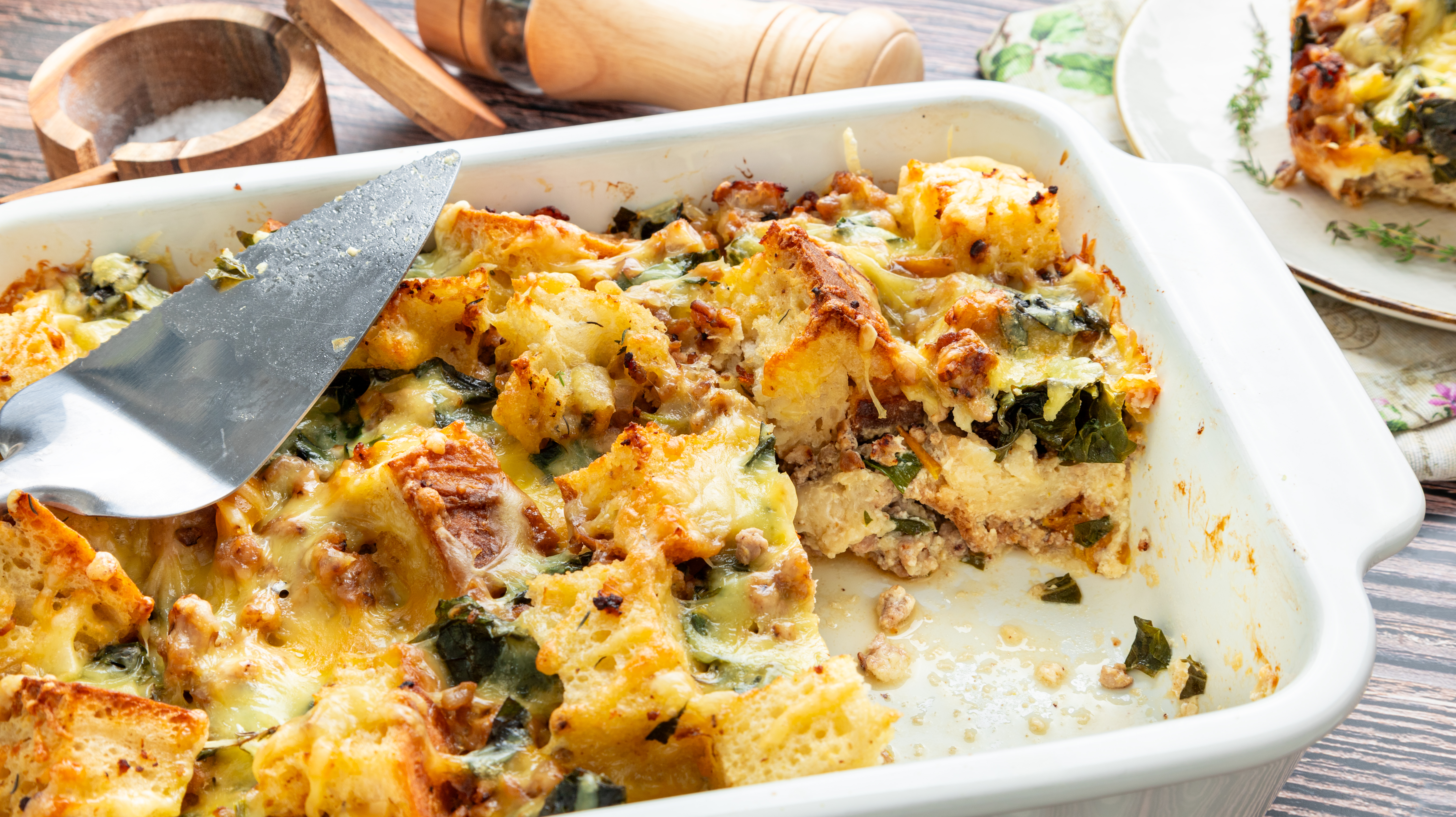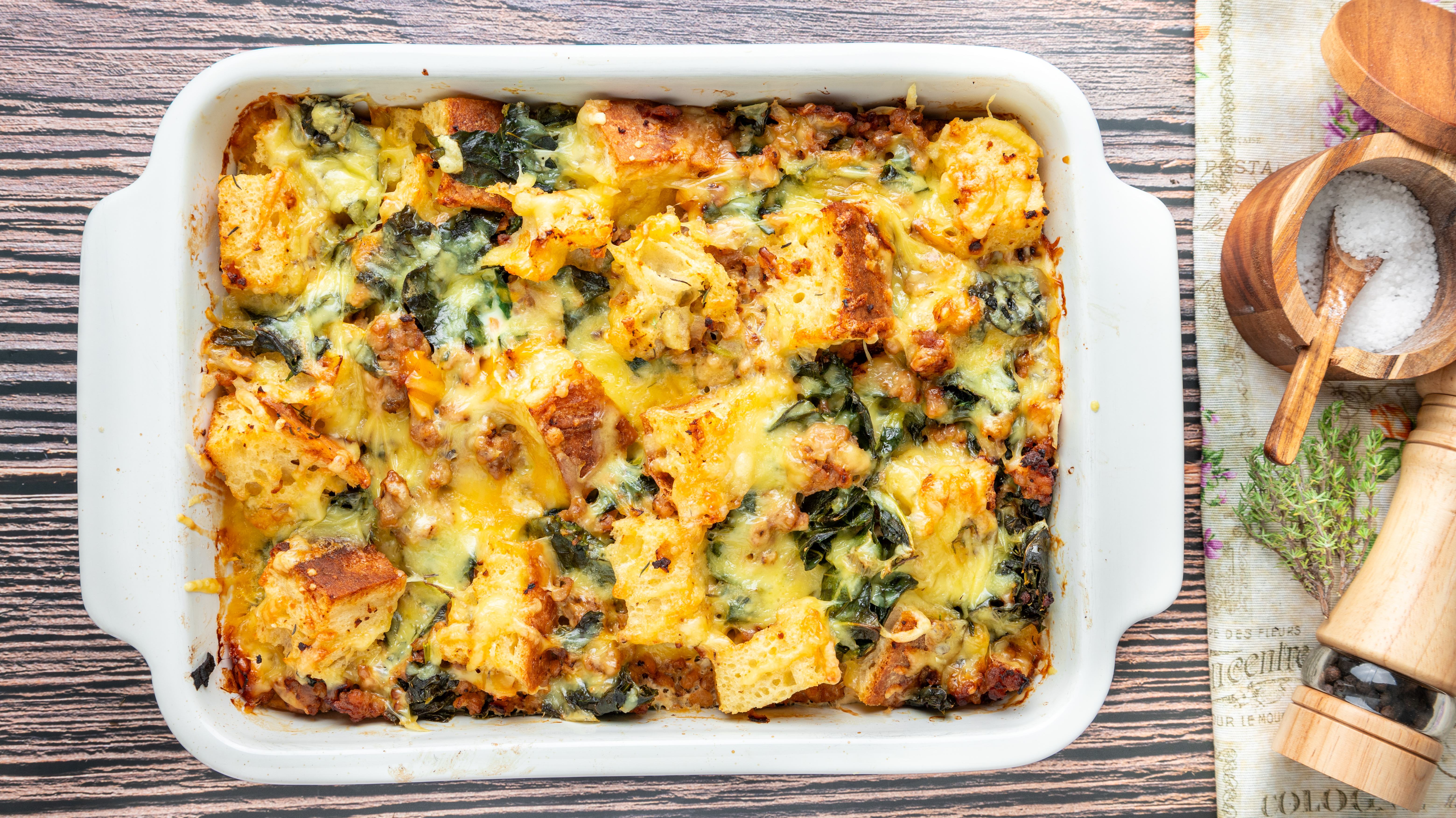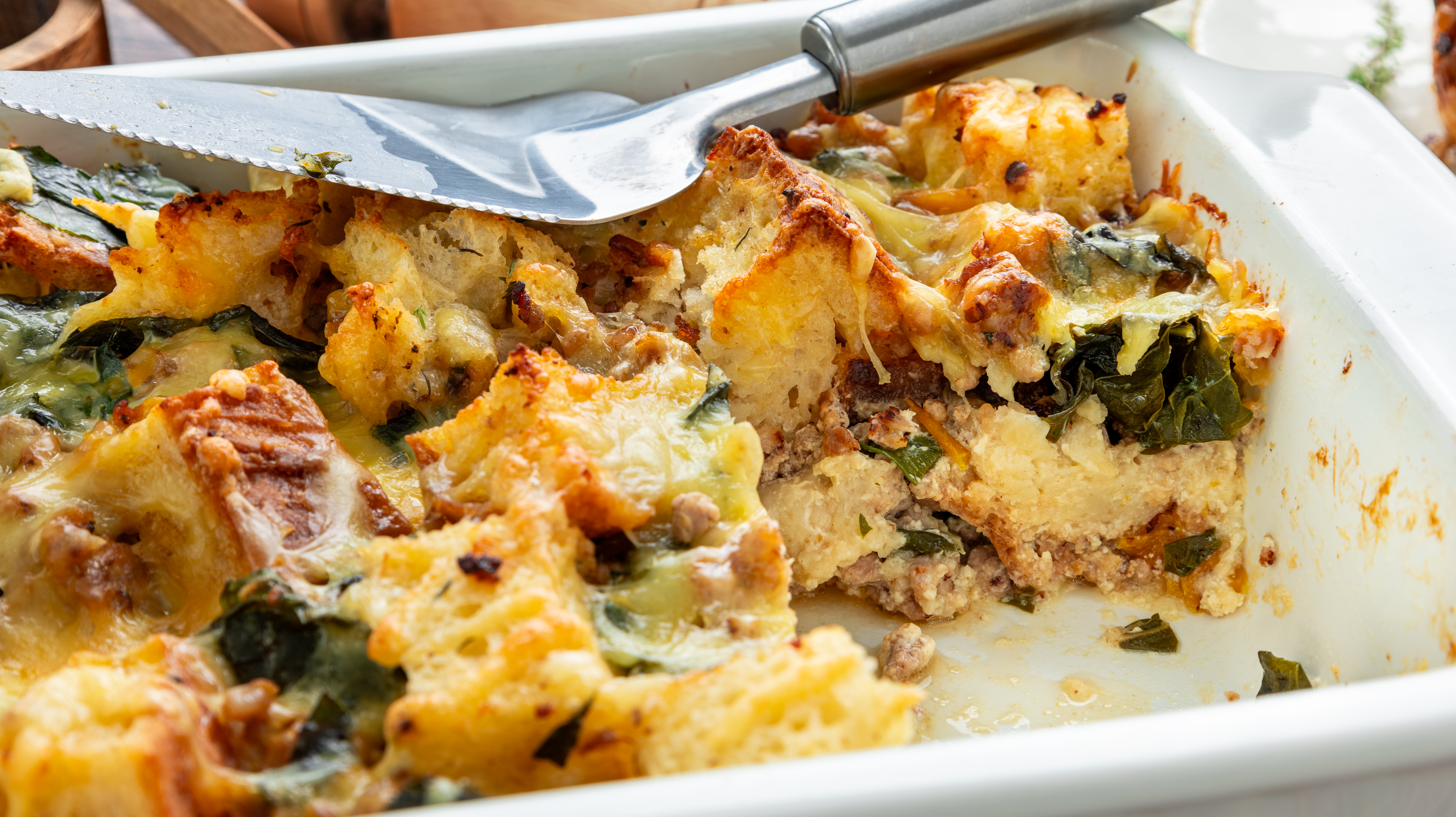 This casserole states what it's all about right in the title! The Savory Breakfast Bake is loaded with savory sausage, garden-fresh and slightly bitter turnip greens, and buttery bread cubes, all in a fluffy, creamy egg base! It has onions and garlic, the pillars of delicious savory flavors, and it has plenty of smoky, melty, sharp cheese. There's not much more the Savory Breakfast Bake could add to make itself any more savory or desirable!