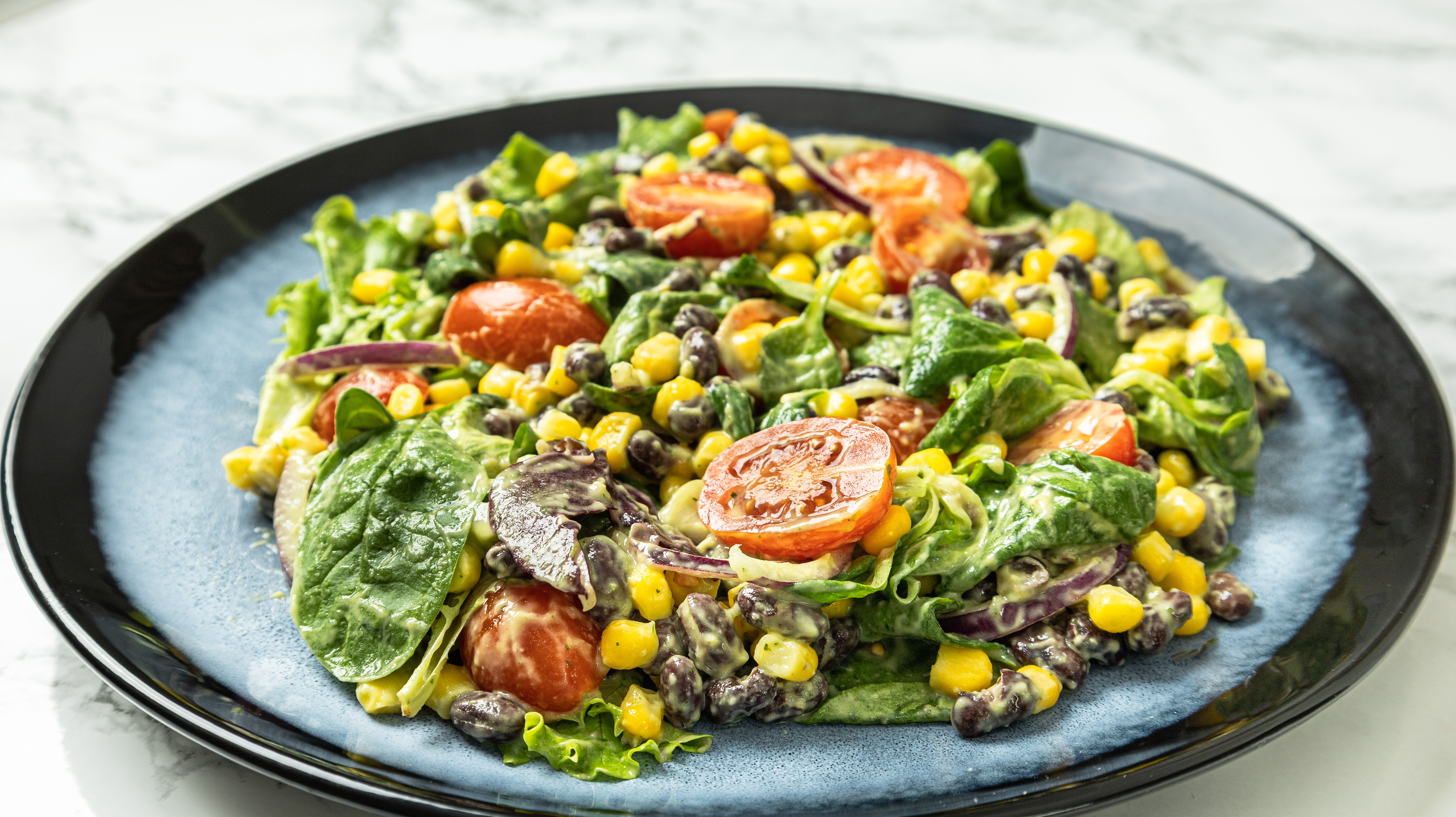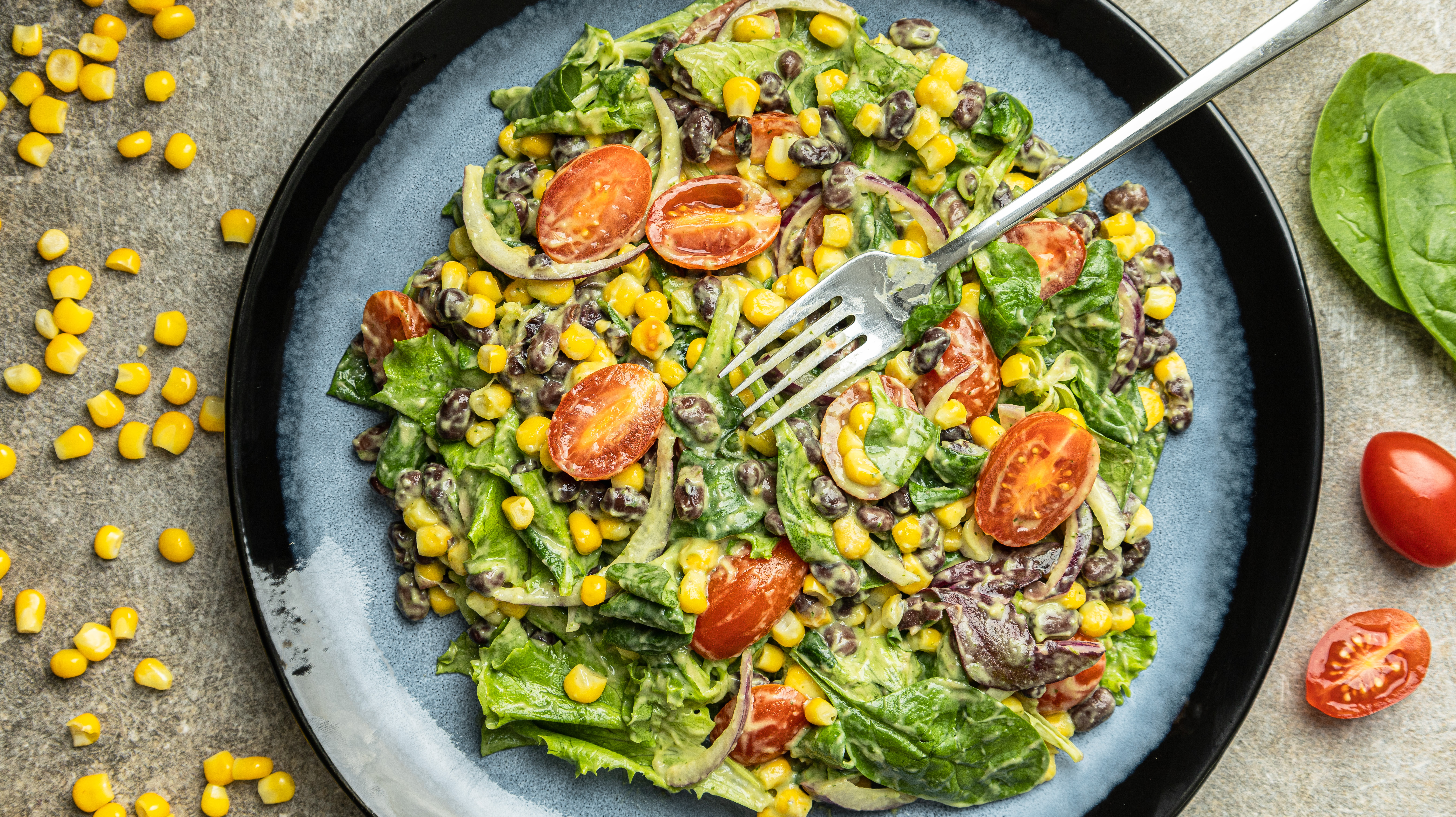 Step 3 -In a large bowl, combine the salad greens, the corn, the tomatoes, and the beans.