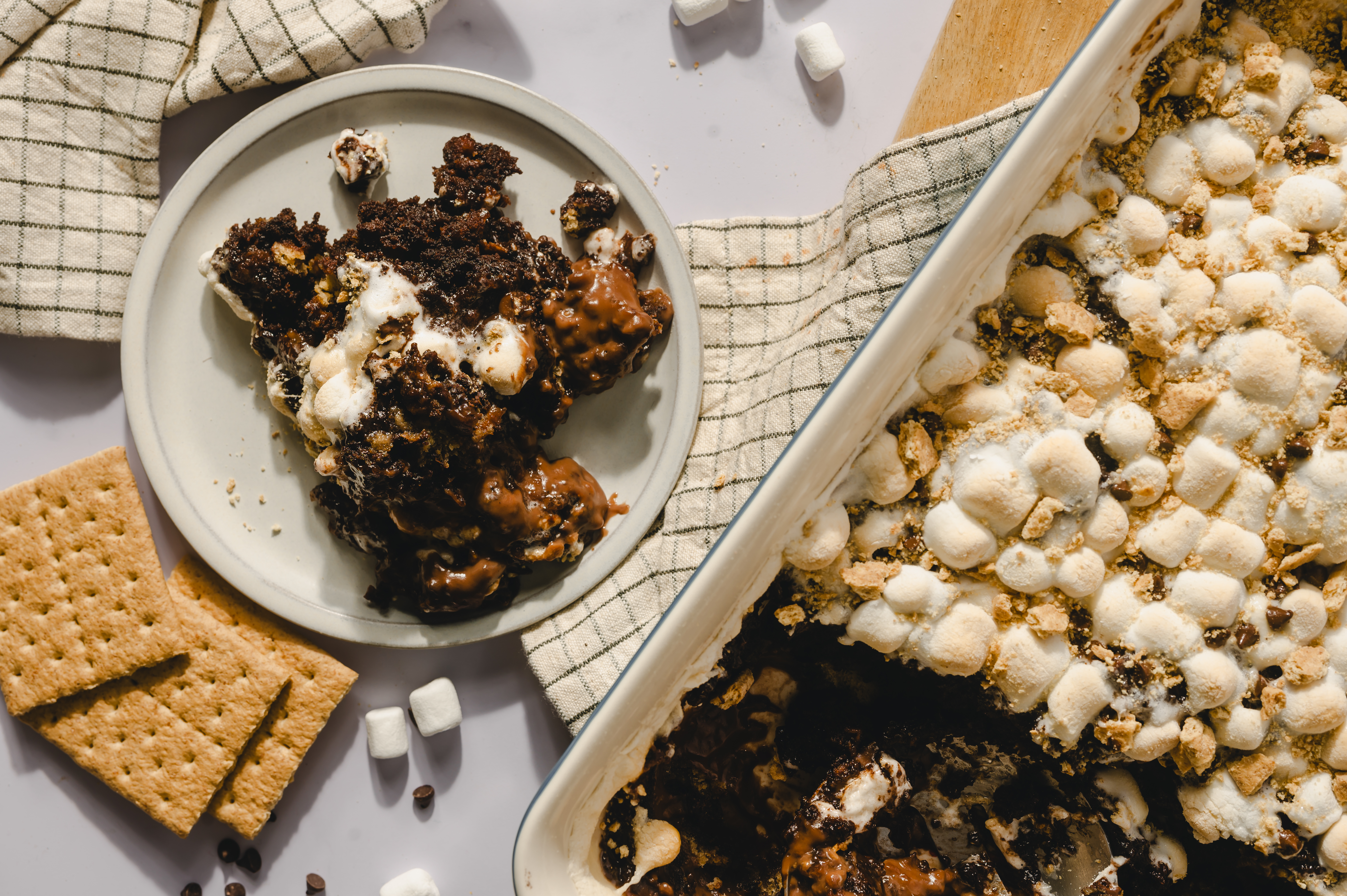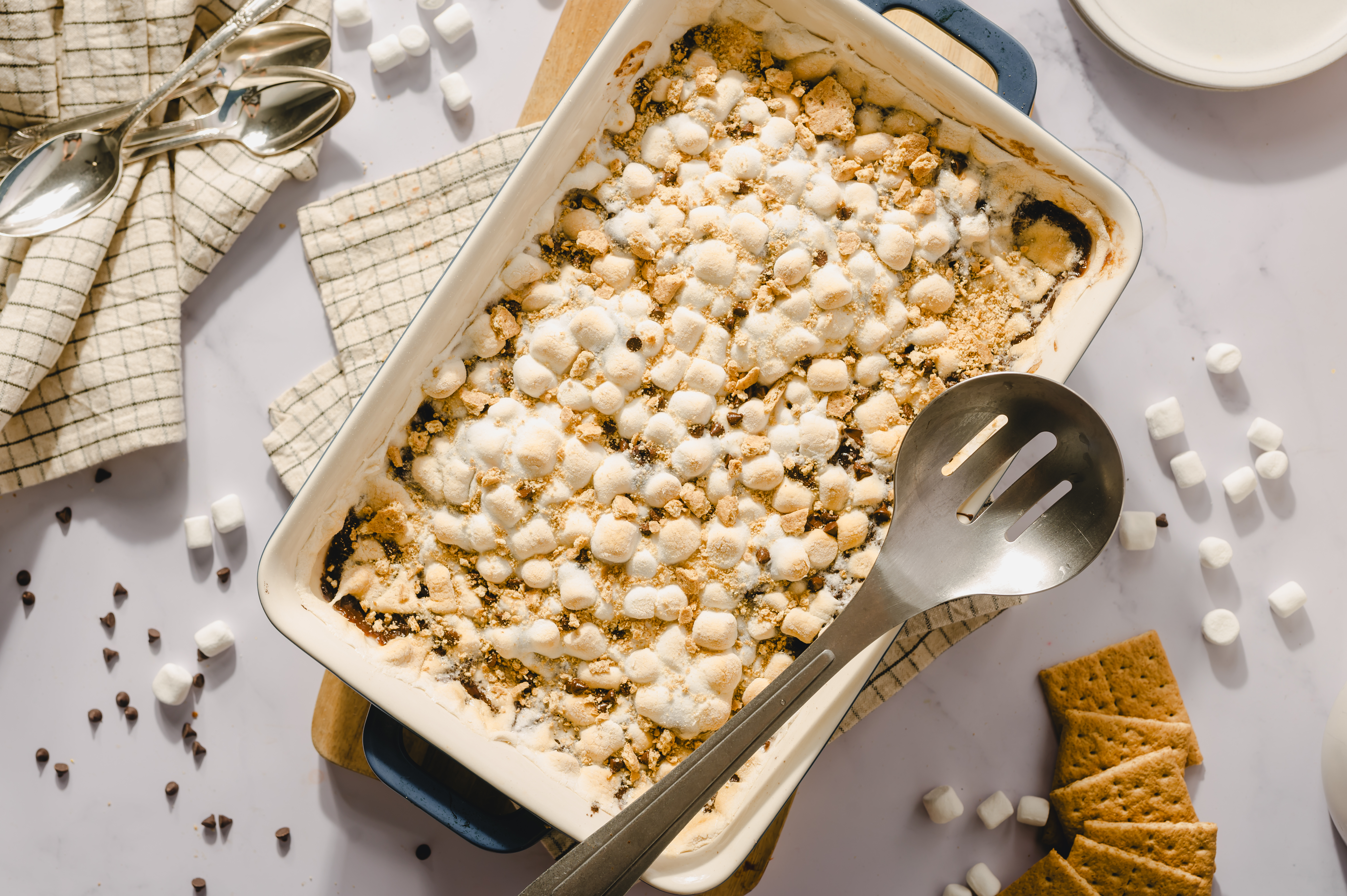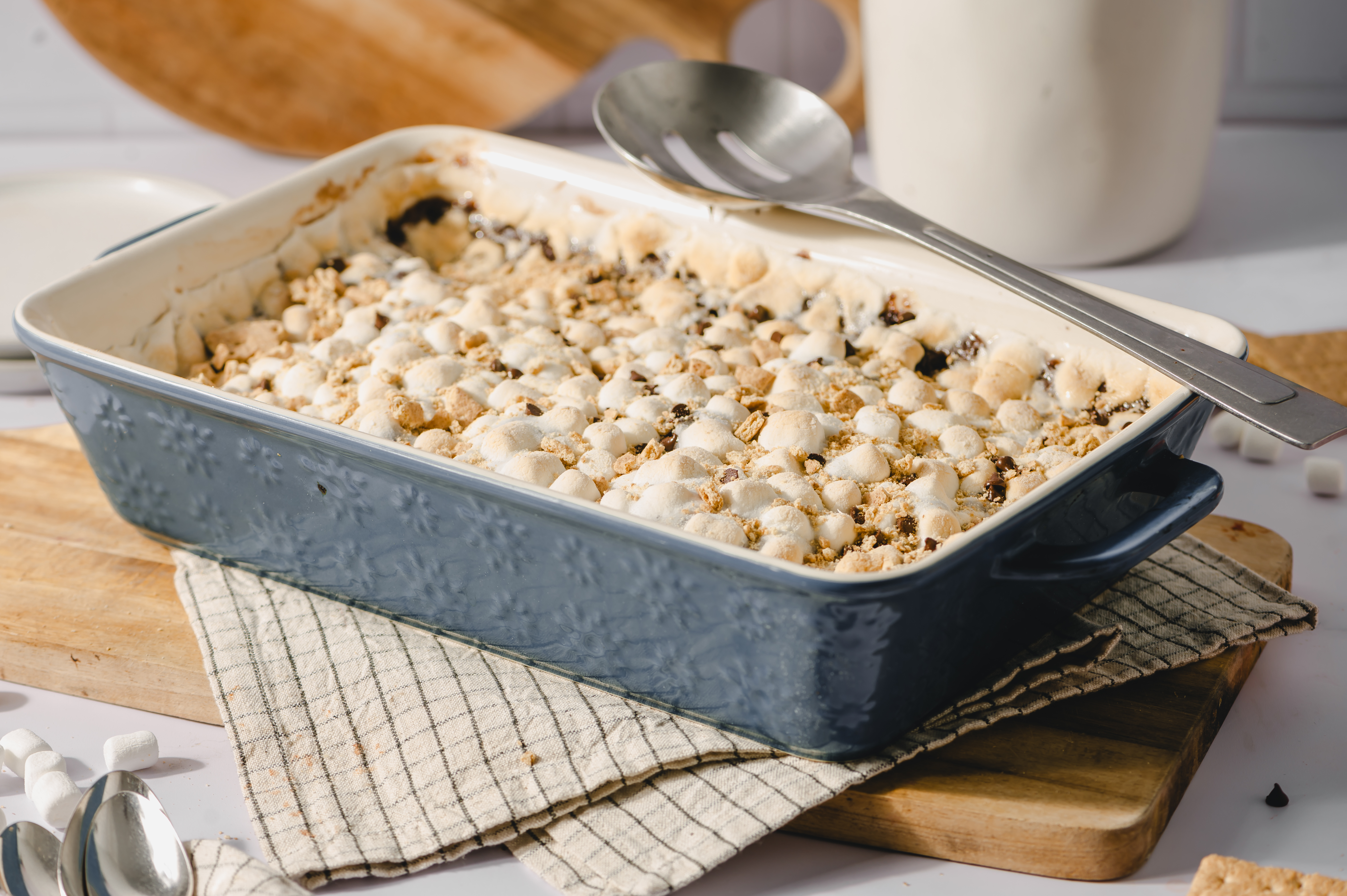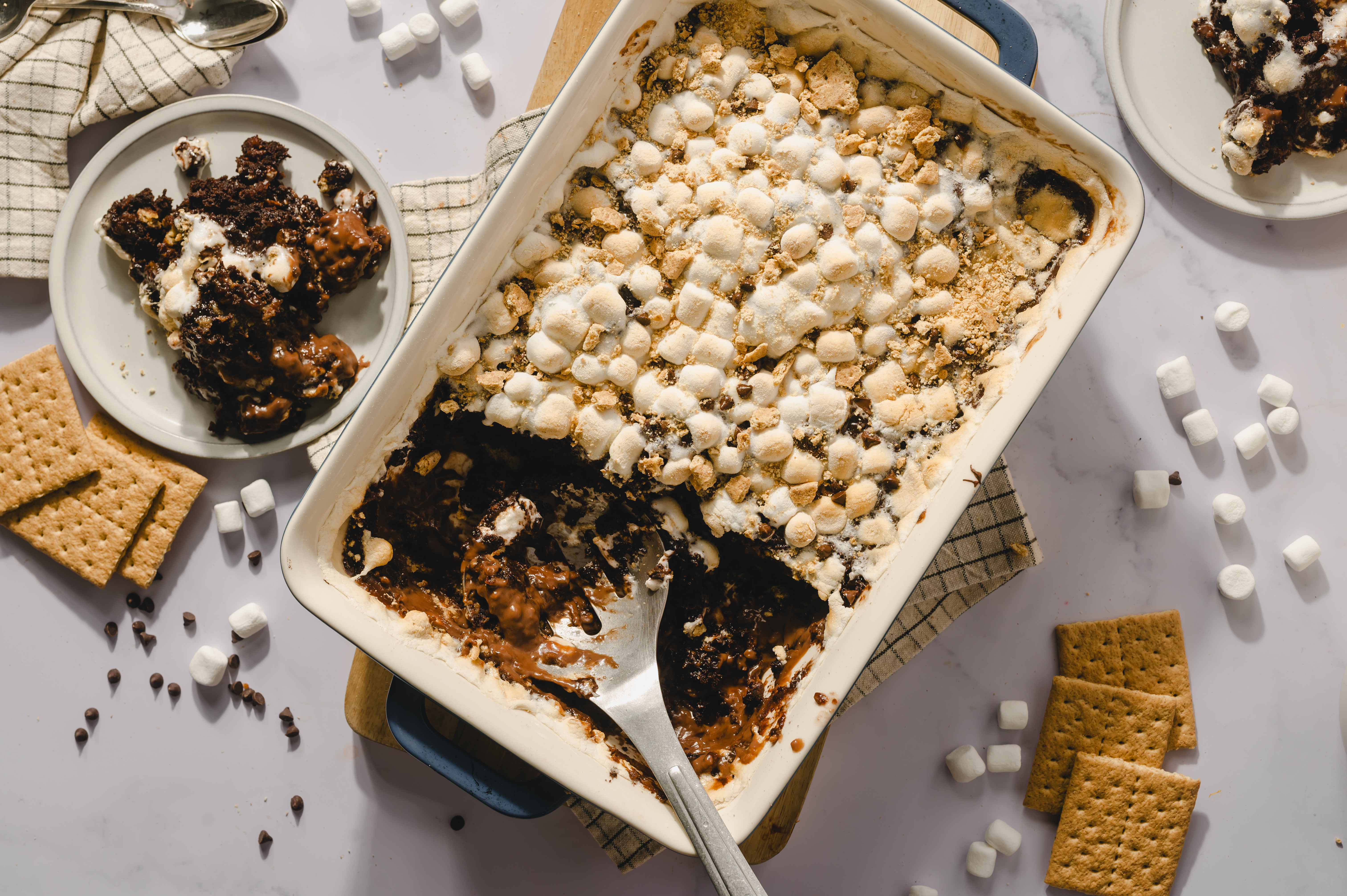 When the rain comes or you don't have wood for a soothing fire, this is the next better-best option! Fire up the oven, because S'more Cobbler Please is sure to have everyone asking for more... in a mannerly way, of course! A rich layering of chocolate pudding, crunchy graham crackers, melty chocolate chips, and creamy miniature marshmallows come together splendidly, without a kindling of firewood in sight! So, mind your manners and grab the best treat under the dessert tent with S'more Cobbler Please. It's raining chocolate... yes, please and thank you!