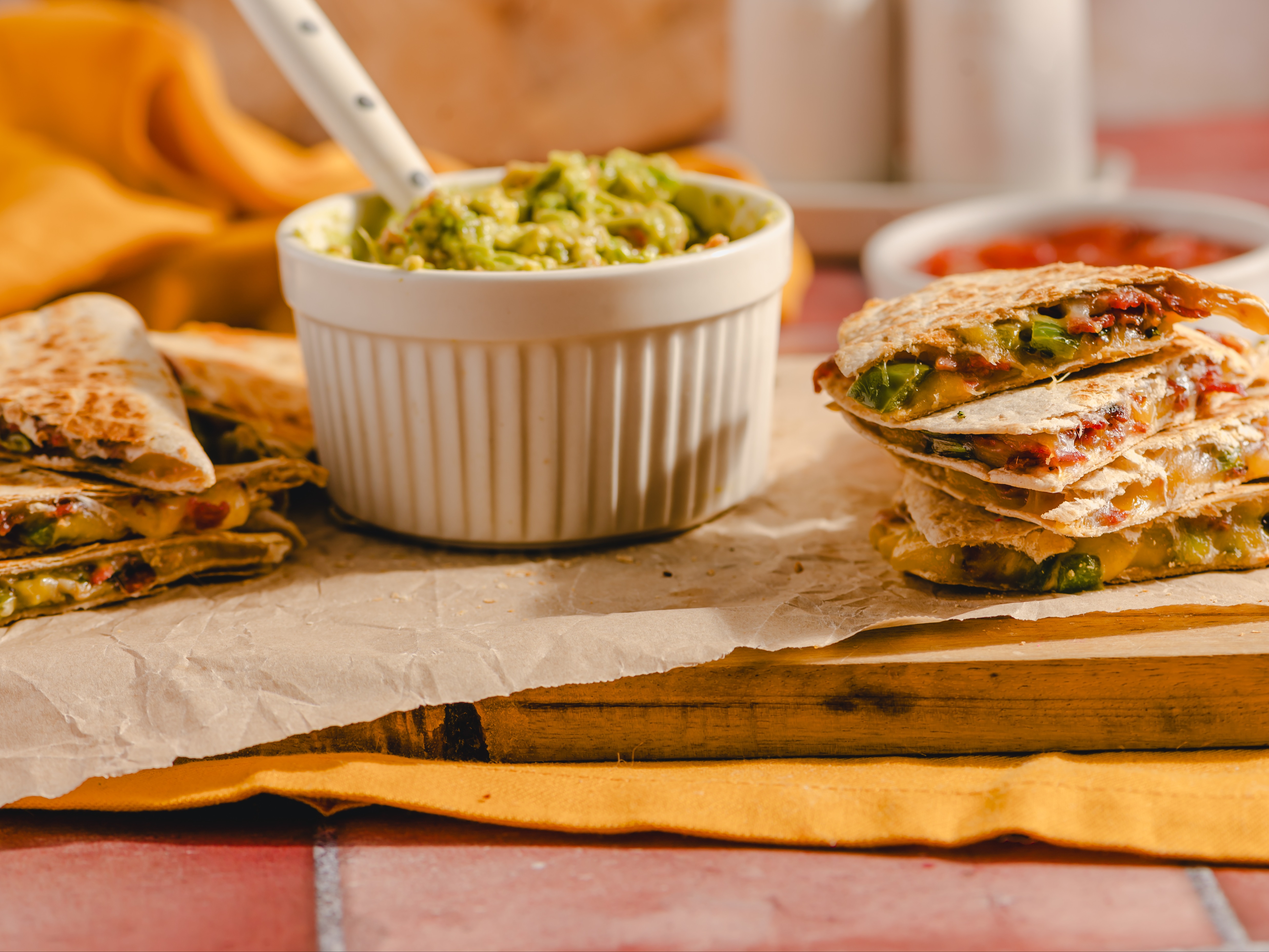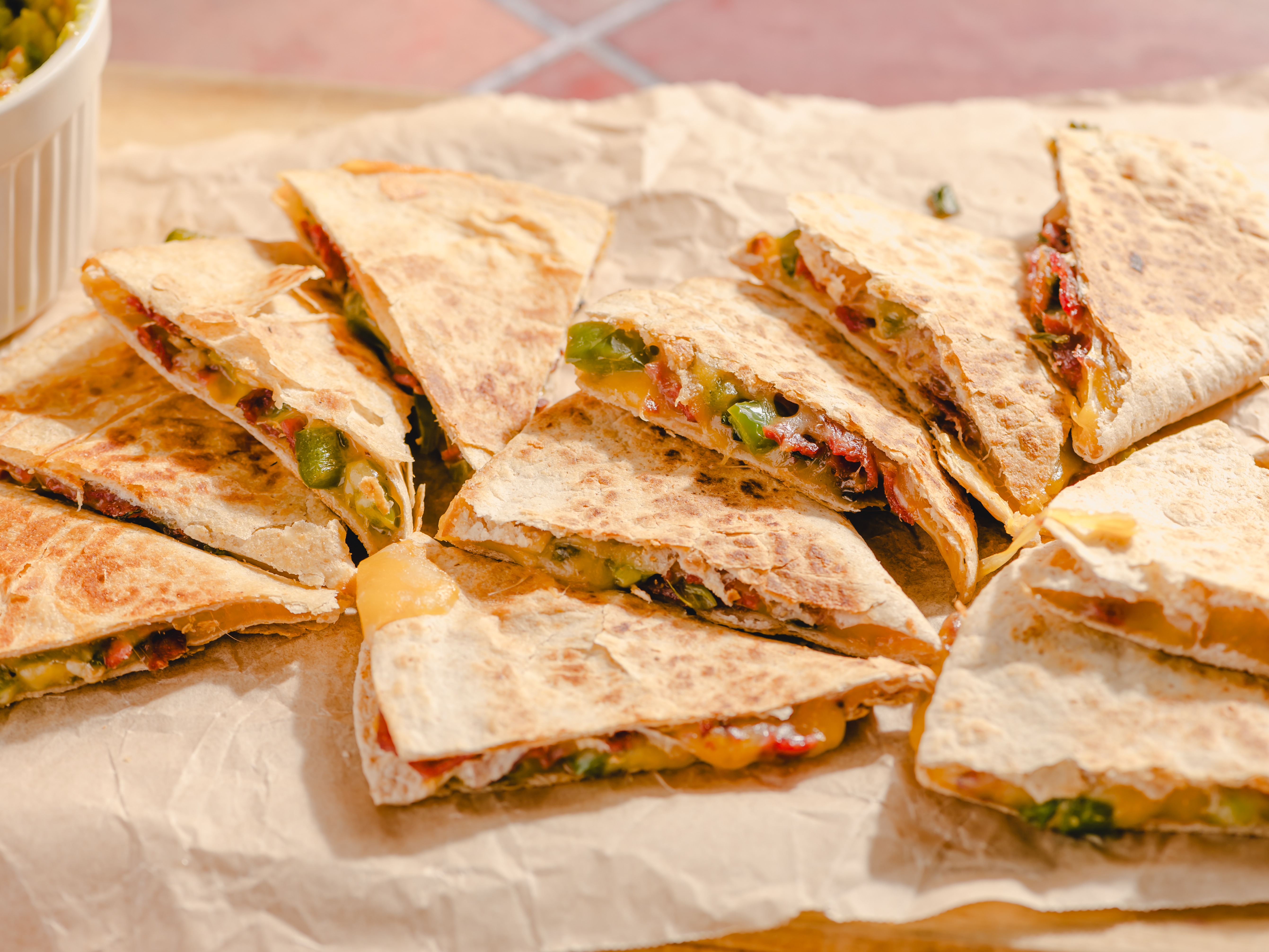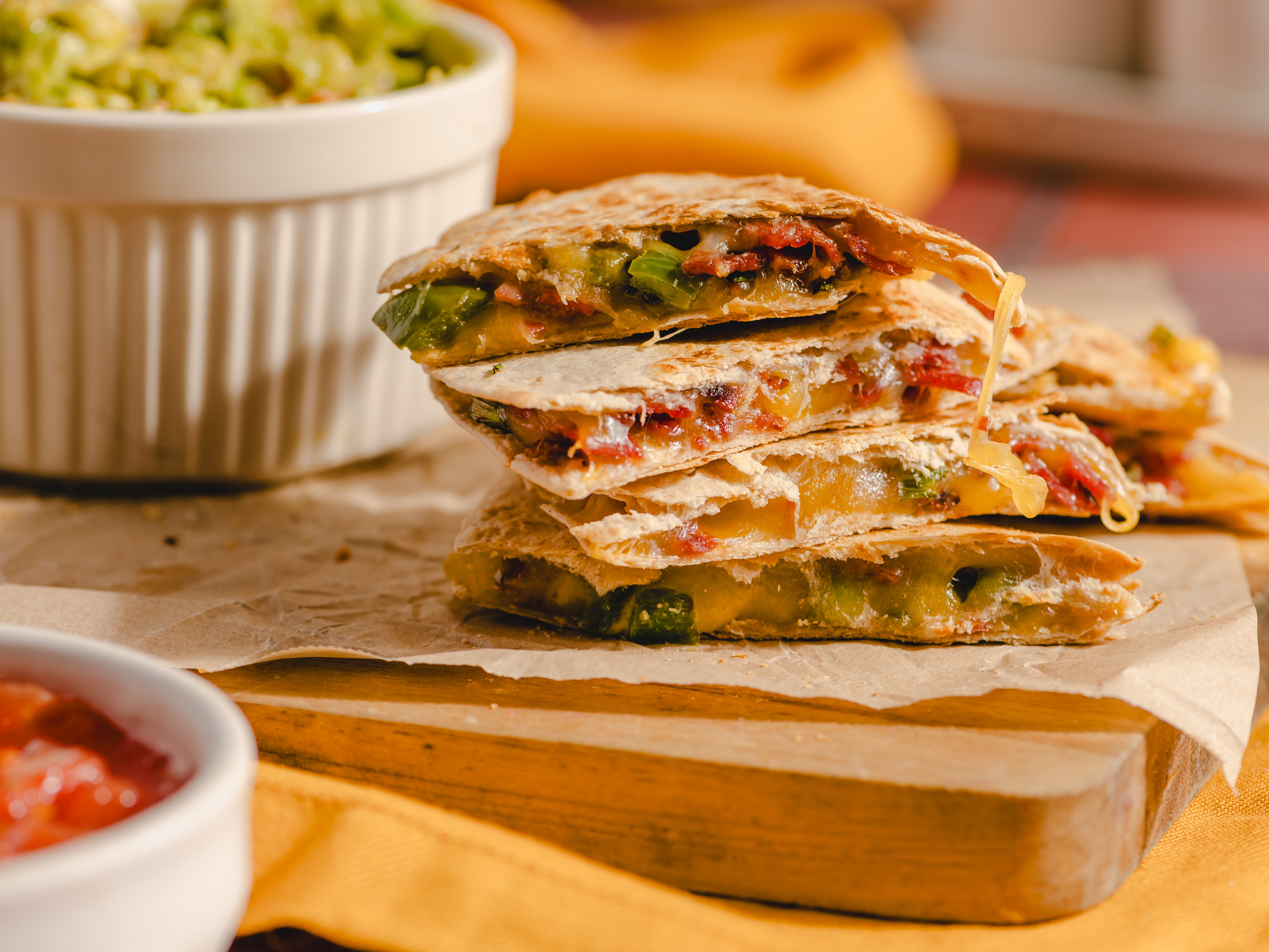 Woo! Is it hot in here? No, don't go turning down the A/C or calling the repair man, everything's fine! It's just these Spicy Quesadillas turning up the heat! Your tongue will be tingling as you crunch into the crispy tortillas that are securely wrapped around some Tex-Mex-seasoned melty cheese, crispy bacon, and spicy jalapeños. They might make you sweat a little bit but a scoop of the creamy, cooling, homemade guacamole will balance it all out just right! Believe us! You didn't break anything; you're just blown away by just how flavorful and explosive these Spicy Quesadillas are!