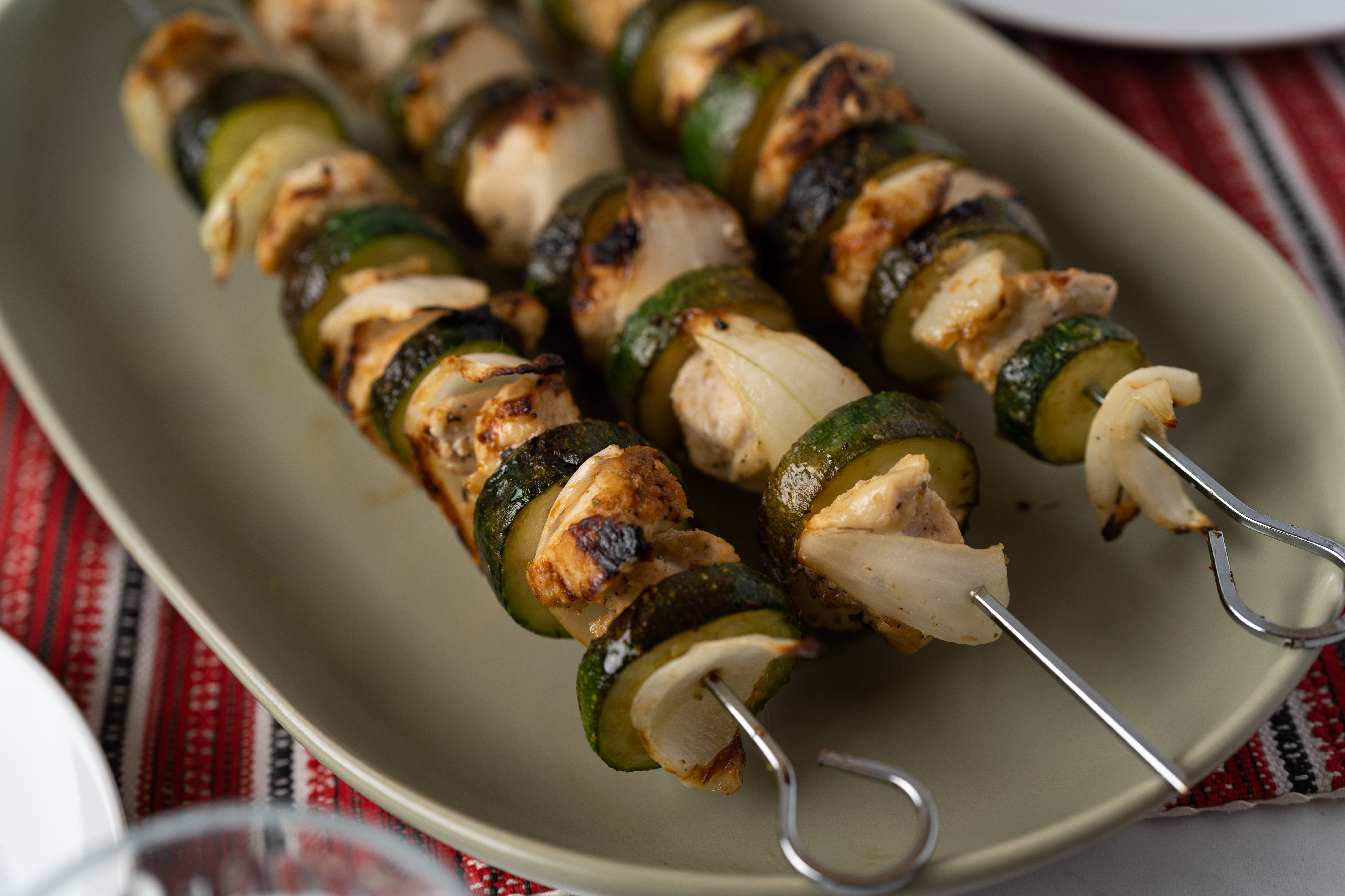 Step 7 -Alternately thread the chicken and the vegetables onto metal skewers or soaked wooden skewers.